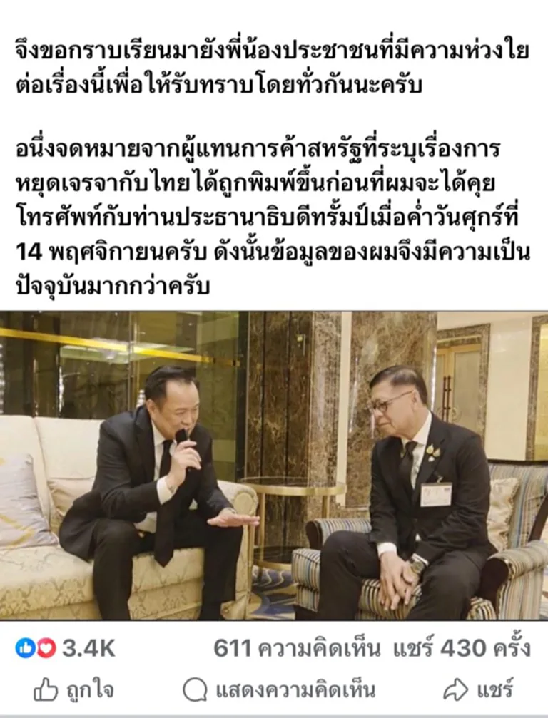 อนึ่งจดหมายจากผู้แทนการค้าสหรัฐที่ระบุเรื่องการหยุดเจรจากับไทยได้ถูกพิมพ์ขึ้นก่อนที่ผมจะได้คุยโทรศัพท์กับท่านประธานาธิบดีทรัมป์เมื่อค่ำวันศุกร์ที่ 14 พฤศจิกายนครับ ดังนั้นข้อมูลของผมจึงมีความเป็นปัจจุบันมากกว่าครับ