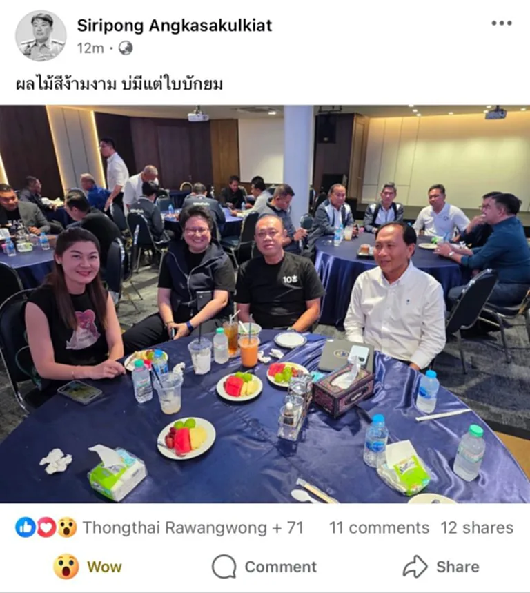 16 พ.ย. 2568 นายสิริพงศ์ อังคสกุลเกียรติ โฆษกประจำสำนักนายกรัฐมนตรีและ และรองหัวหน้าพรรคภูมิใจไทย โพสต์ภาพลงเพจเฟซบุ๊กส่วนตัว โดยในภาพปรากฏ น.ส.สุดารัตน์ พิทักษ์พรพัลลภ สส.อุบลราชธานี พรรคเพื่อไทย นั่งร่วมโต๊ะกับนายเนวิน ชิดชอบ ประธานสโมสรฟุตบอลบุรีรัมย์ ยูไนเต็ด น.ส.แนน บุญย์ธิดา สมชัย สส.อุบลราชธานี ในฐานะโฆษกพรรคภูมิใจไทย พร้อมระบุแคปชั่นว่า “ผลไม้สีง้ามงาม บ่มีแต่ใบบักยม”