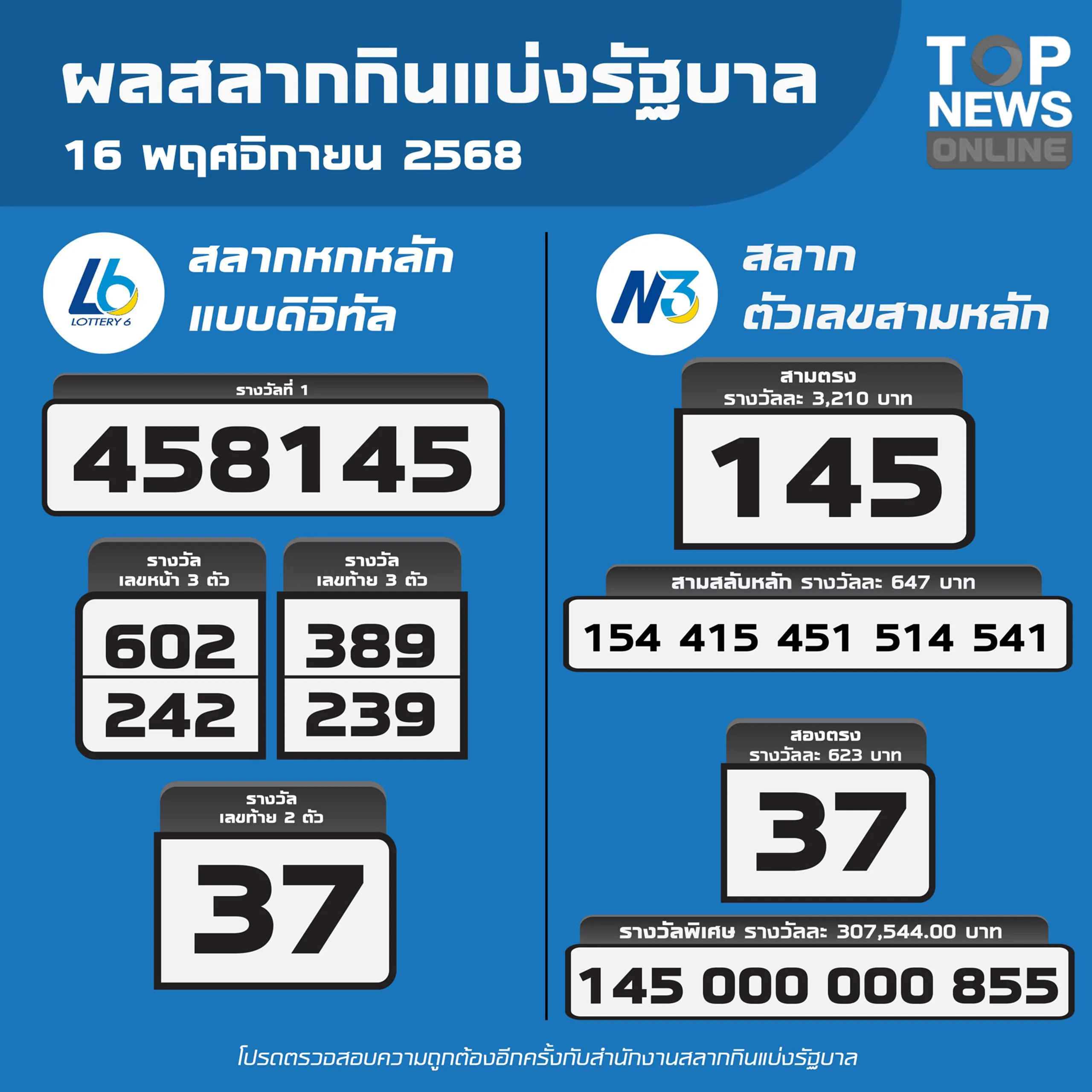 ตรวจหวย ผลสลากกินแบ่งรัฐบาล งวดประจำวันที่ 16 พฤศจิกายน 2568 – Top News รายงาน