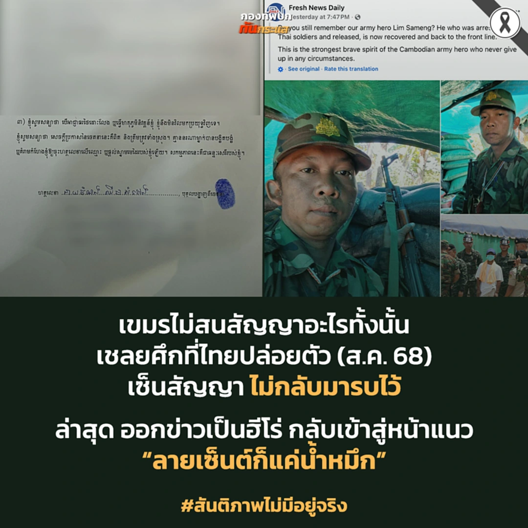 วานนี้ (16 พ.ย.68) เพจกองทัพบก ทันกระแส โพสต์ข้อความ โดยระบุว่า..เขมรไม่สนสัญญาอะไรทั้งนั้น เชลยศึกที่ไทยปล่อยตัว (ส.ค. 68)  เซ็นสัญญา ไม่กลับมารบไว้ ล่าสุด ออกข่าวเป็นฮีโร่ กลับเข้าสู่หน้าแนว “ลายเซ็นต์ก็แค่น้ำหมึก” #สันติภาพไม่มีอยู่จริง