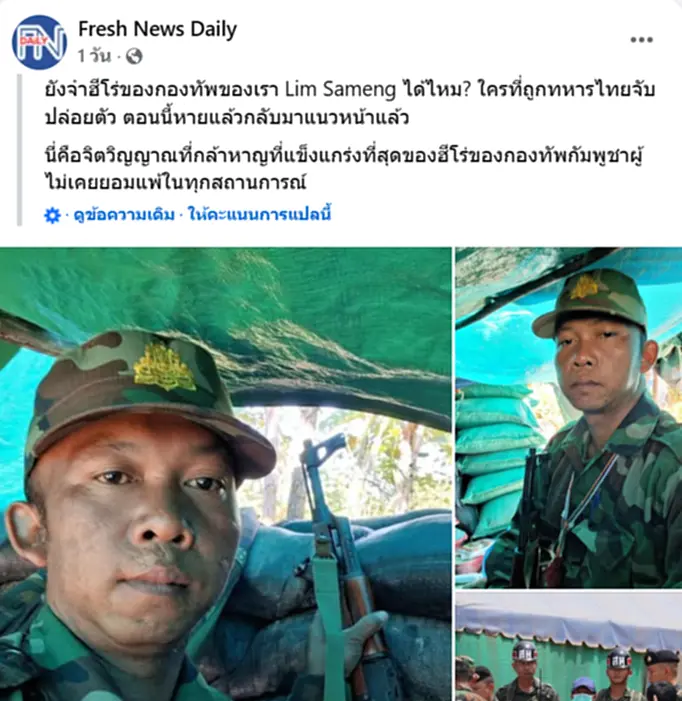 ตามที่ปรากฏภาพข่าวของสำนักข่าว Fresh News Daily ว่า คุณยังจำฮีโร่ทหารของเราชื่อ ” ซึม ซ็อมแอง ” ได้หรือไม่??? เขาคือคนที่ถูกทหารไทยจับกุมและได้รับการปล่อยตัว และตอนนี้ได้ฟื้นตัวกลับมาอยู่แนวหน้าอีกครั้งแล้ว