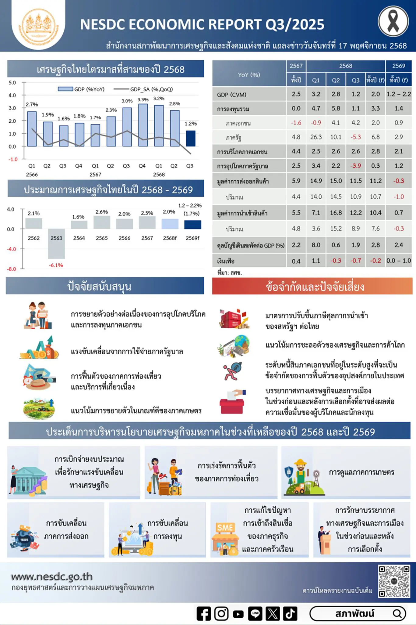 เมื่อวันที่ 17 พฤศจิกายน 2568 นางสาวอ้อนฟ้า เวชชาชีวะ เลขาธิการสภาพัฒนาการเศรษฐกิจและสังคมแห่งชาติ (สศช.) หรือสภาพัฒน์ฯ แถลงรายงานภาวะเศรษฐกิจไทยไตรมาสที่ 3 ของปี 2568 และแนวโน้มเศรษฐกิจปี 2568-2569 ว่าเศรษฐกิจไทยในไตรมาสที่3 ของปี 2568 ขยายตัว 1.2% ชะลอลงจาก 2.8% ในไตรมาสที่2 ของปี 2568 และเมื่อปรับผลของฤดูกาลออกแล้ว เศรษฐกิจไทยในไตรมาสที่ 3 ของปี 2568 ลดลงจากไตรมาสที่ 2 ของปี 2568 ที่ 0.6% รวม 9 เดือนแรกของปี 2568 เศรษฐกิจไทย ขยายตัว 2.4%