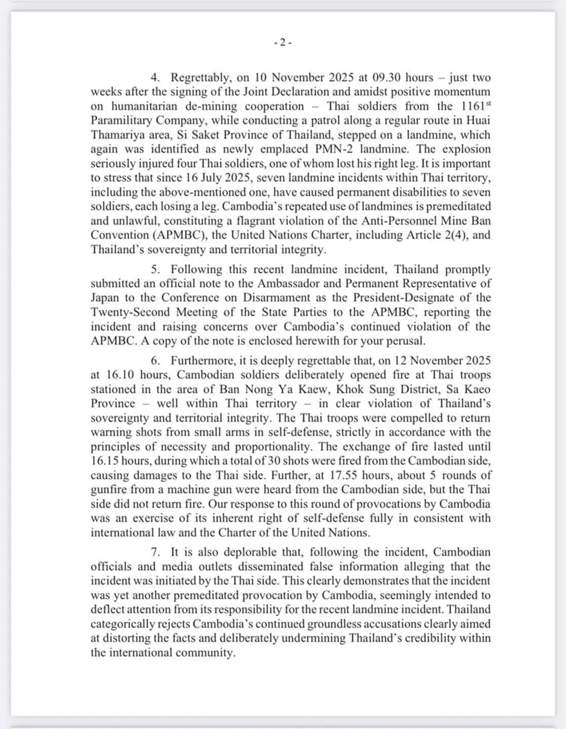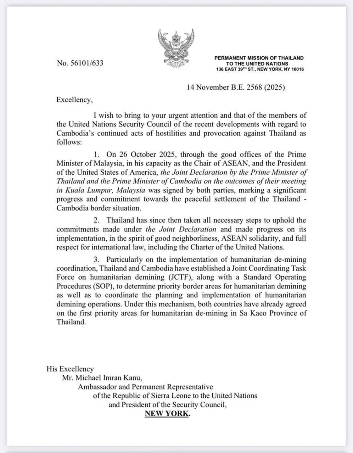 เมื่อวันที่ 17 พฤศจิกายน 2568 นายเชิดชาย ใช้ไววิทย์ เอกอัครราชทูตผู้แทนถาวรไทยประจำสหประชาชาติ ณ นครนิวยอร์ก ได้ส่งหนังสือชี้แจงต่อ คณะมนตรีความมั่นคงแห่งสหประชาชาติ กรณีที่กัมพูชากระทำการที่เป็นปฏิปักษ์และยั่วยุประเทศไทย โดยมีใจความดังต่อไปนี้