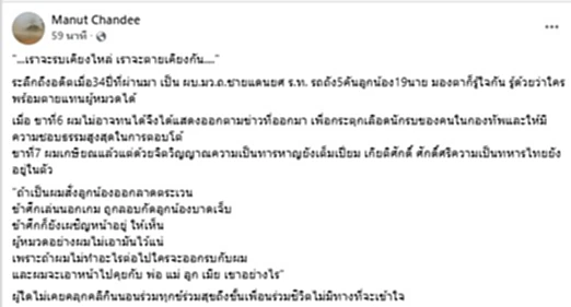 พลเอก มนัส จันดี เสนาธิการทหาร กองบัญชาการกองทัพไทย ได้ออกมาเคลื่อนไหวด้วยการโพสต์ข้อความระบุว่า”…เราจะรบเคียงไหล่ เราจะตายเคียงกัน….” ระลึกถึงอดีตเมื่อ34ปี่ที่ผ่านมา เป็น ผบ.มว.ถ.ชายแดนยศ ร.ท. รถถัง5คันลูกน้อง19นาย มองตาก็รู้ใจกัน รู้ด้วยว่าใครพร้อมตายแทนผู้หมวดได้