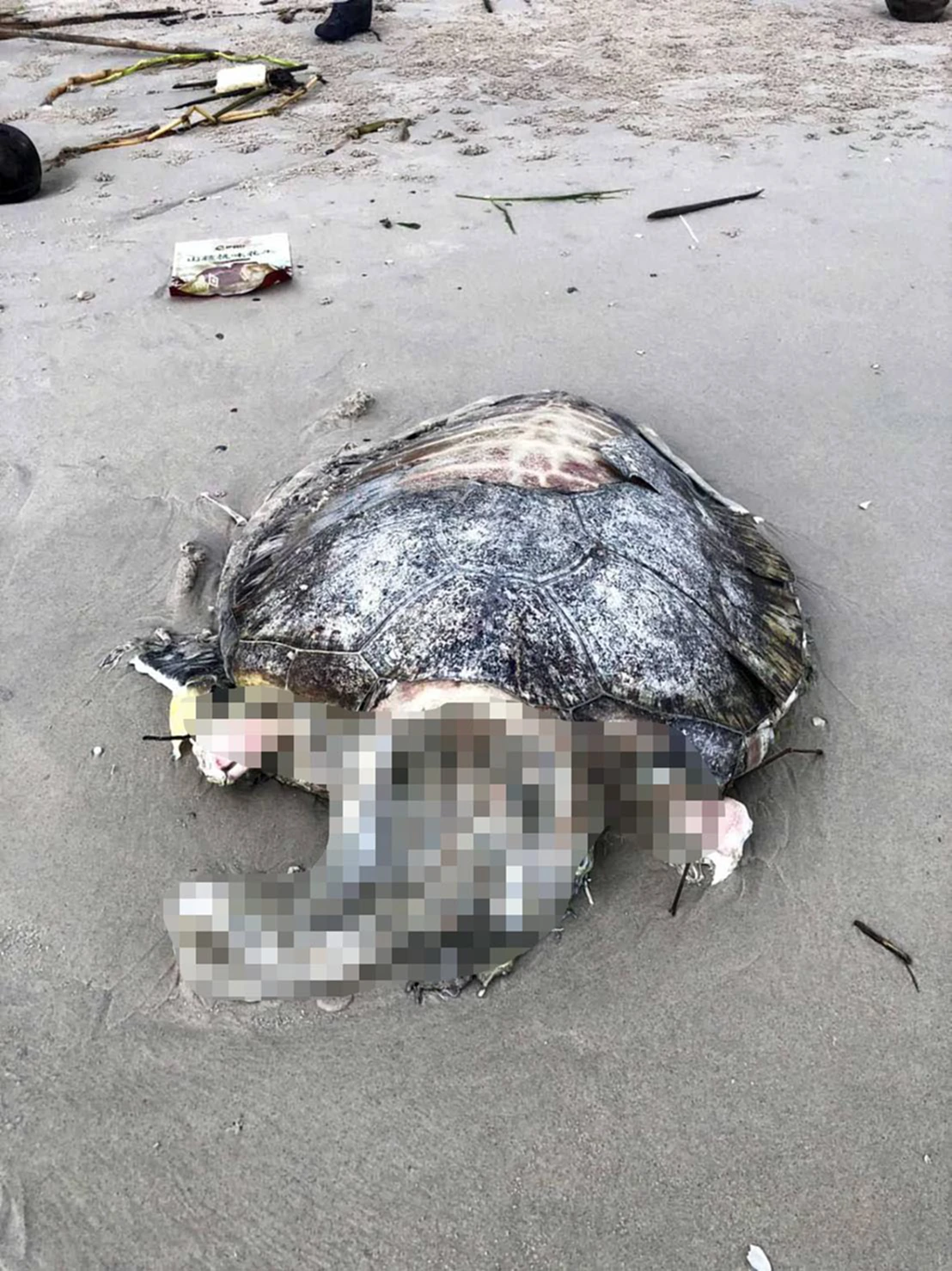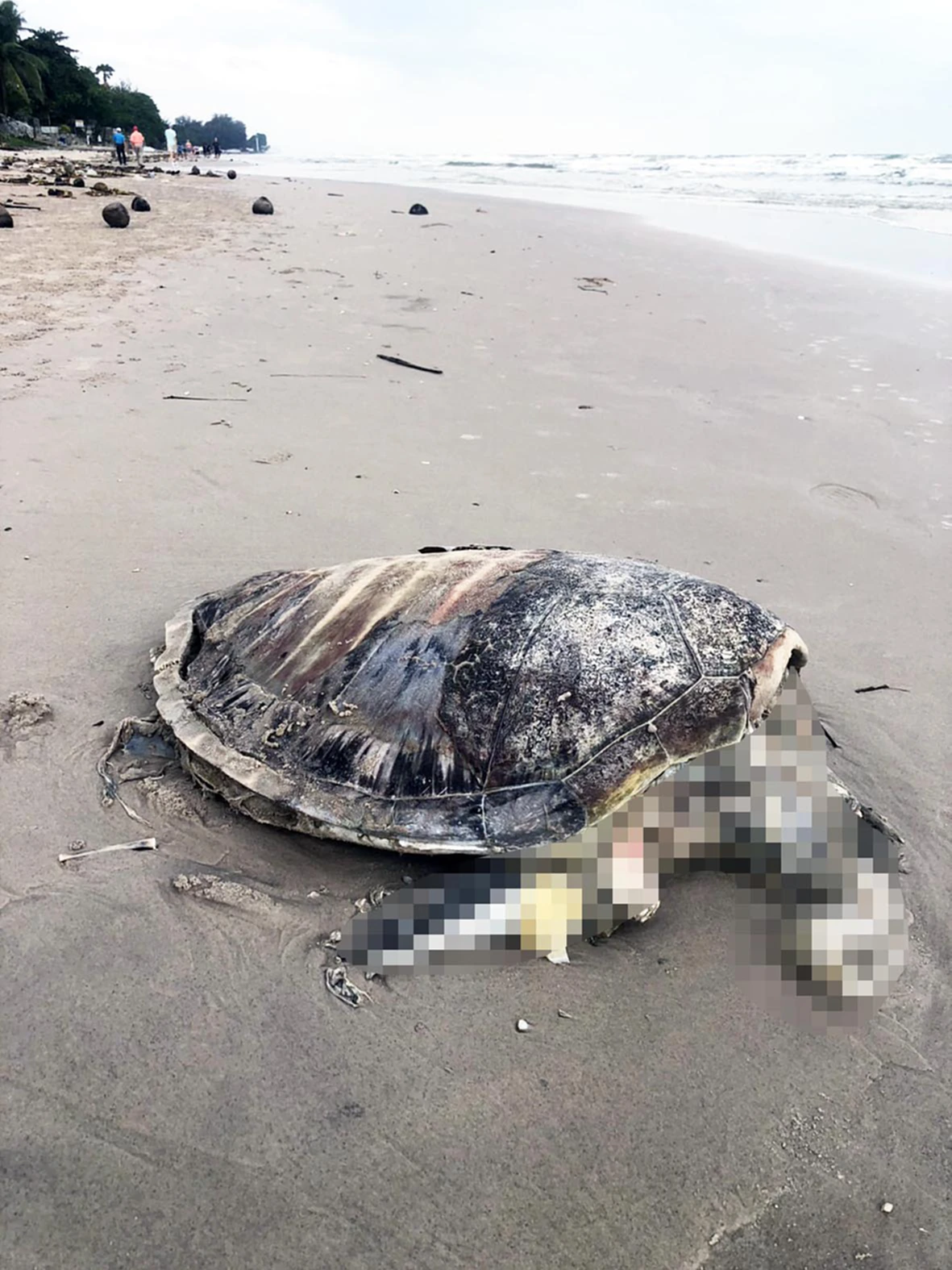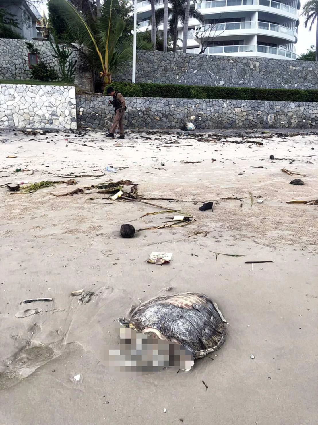 วันที่ 17 พ.ย. 2568 ศูนย์วิทยุรับแจ้งเหตุ 191 สภ.หัวหิน จ.ประจวบคีรีขันธ์ ได้รับแจ้งจากนักท่องเที่ยวว่าพบซากเต่าทะเลเกยตื้นบริเวณชายหาดหน้าคอนโดซอยนภานาวิน เขตเทศบาลนครหัวหิน จึงประสานมูลนิธิสว่างหัวหินธรรมสถานเข้าตรวจสอบ โดยมีตำรวจหัวหินอยู่ในที่เกิดเหตุ ท่ามกลางนักท่องเที่ยวต่างชาติที่ให้ความสนใจ พบว่าเป็นซากเต่าตนุใกล้สูญพันธุ์ขนาดใหญ่ สภาพเน่าเปื่อยเหลือเพียงกระดองและครีบ ส่งกลิ่นเหม็นทั่วบริเวณ ลำตัวยาวประมาณ 50 เซนติเมตร กว้างประมาณ 30 เซนติเมตร น้ำหนักกว่า 30 กิโลกรัม คาดว่าเสียชีวิตมาแล้วไม่ต่ำกว่า 2 วัน