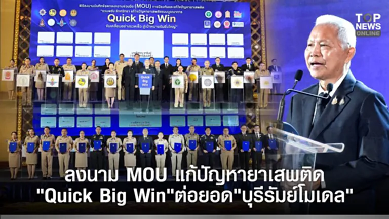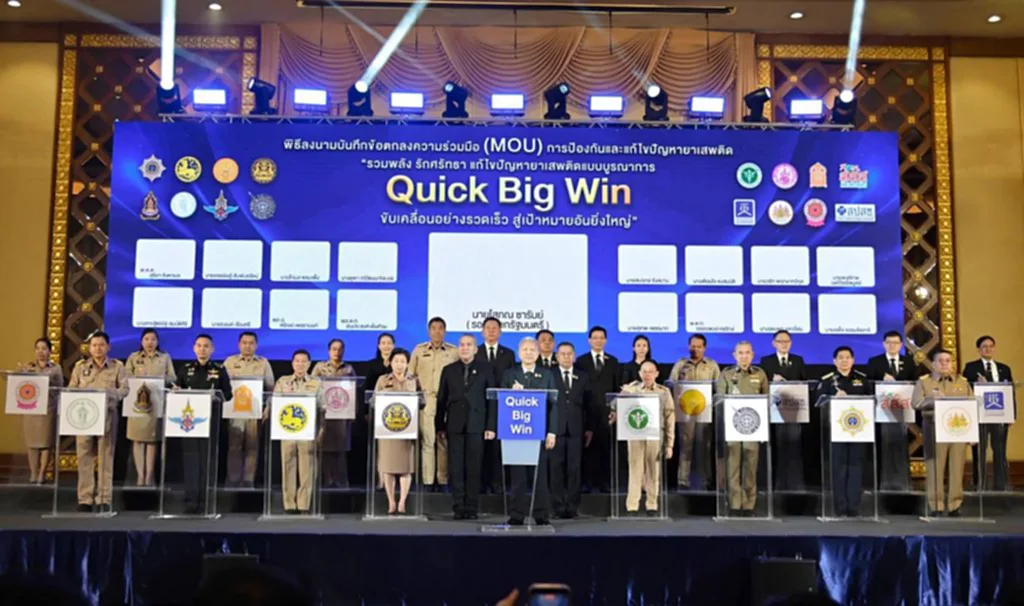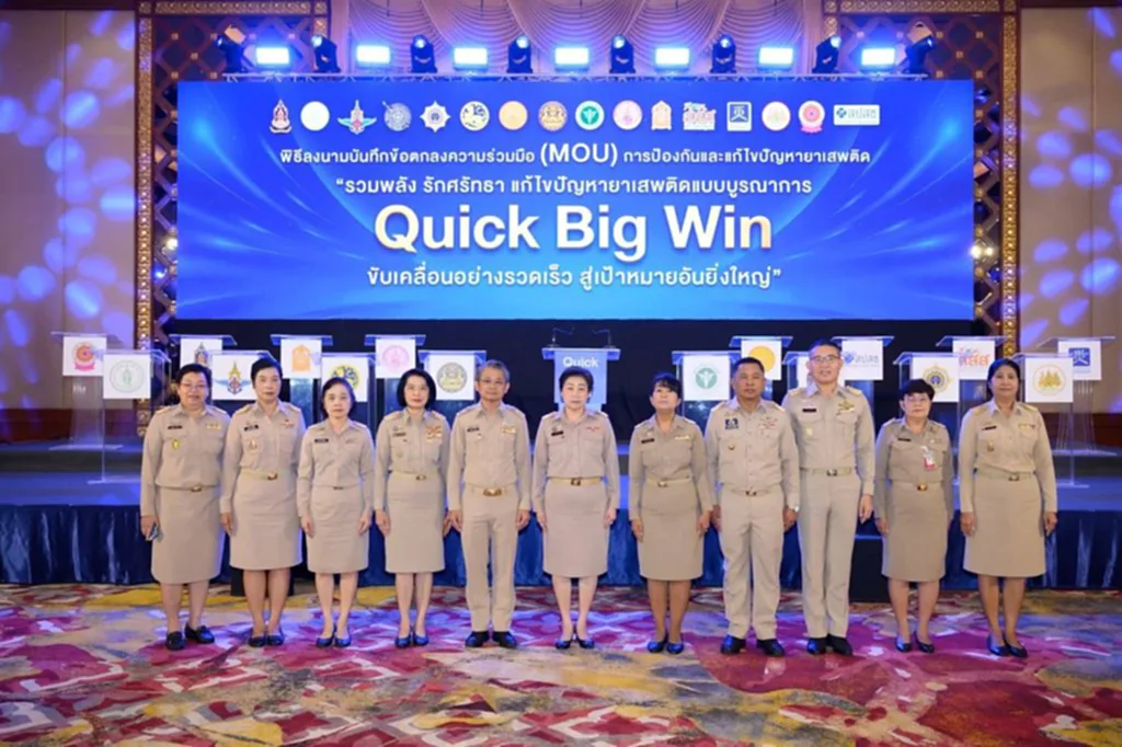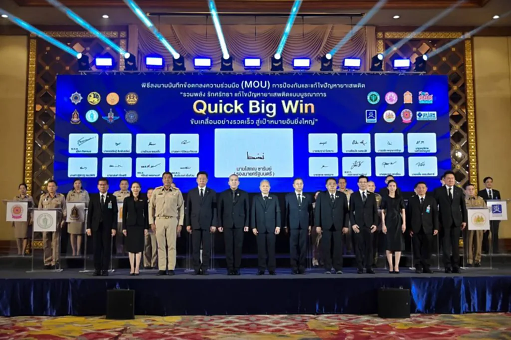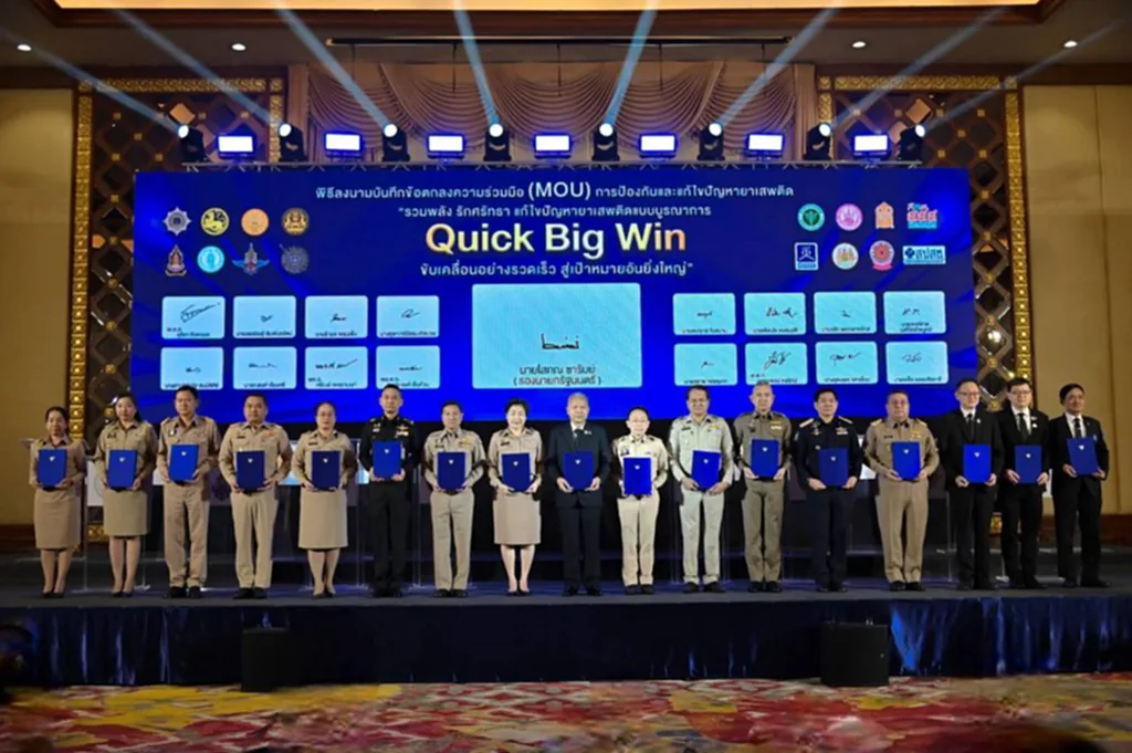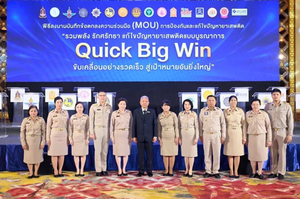 สำนักปลัดนายกรัฐมนตรี ร่วมกับ 16 หน่วยงาน ภาคีเครือข่าย ลงนาม MOU แก้ไขปัญหายาเสพติด "Quick Big Win" ต่อยอด "บุรีรัมย์โมเดล" มุ่งสู่ รวมพลัง รักศรัทธา แก้ปัญหายาเสพติดแบบบูรณาการ ยุติปัญหายาเสพติดทั่วประเทศอย่างเป็นระบบและยั่งยืน