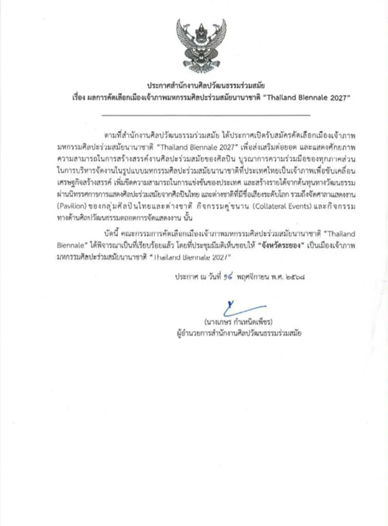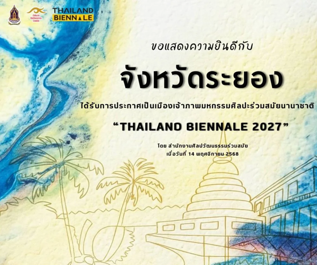 นางสาวซาบีดา ไทยเศรษฐ์ รัฐมนตรีว่าการกระทรวงวัฒนธรรม (รมว.วธ.) เปิดเผยว่า กระทรวงวัฒนธรรม(วธ.) โดยสำนักงานศิลปวัฒนธรรมร่วมสมัย (สศร.) ได้คัดเลือกจังหวัดที่เป็นเจ้าภาพจัดงานมหกรรมศิลปะร่วมสมัยนานาชาติ “Thailand Biennale 2027” โดยจังหวัดระยองได้รับคัดเลือกเป็นเจ้าภาพจัดงานฯ ครั้งที่ 5 ในปี 2027 หรือปีพ.ศ.2570 เนื่องจากจังหวัดระยองมีแนวคิดและมุมมองที่ดีในการสร้างสมดุลระหว่างอุตสาหกรรมและสิ่งแวดล้อมผ่านศิลปวัฒนธรรมด้วย ซึ่งเป็นสิ่งที่แตกต่างจากเมืองอื่นอย่างเห็นได้ชัด ถือเป็นโจทย์ใหม่ให้กับงานมหกรรมศิลปะร่วมสมัยนานาชาติ และมีสิ่งอำนวยความสะดวกรองรับการจัดงานพร้อมทุกด้าน มีประสบการณ์จัดงานในระดับนานาชาติมาแล้ว รวมถึงผ่านเกณฑ์มาตรฐานที่กำหนดไว้ในระดับดีทุกด้าน รวมทั้งมีการเตรียมความพร้อมรับเป็นเจ้าภาพและมีข้อมูลความร่วมมือของทุกหน่วยงานในพื้นที่ที่ชัดเจน เป็นรูปธรรม ทั้งหน่วยงานภาคราชการ องค์กรปกครองส่วนท้องถิ่น ภาคธุรกิจ เอกชน ศิลปิน และภาคประชาชน ตลอดจนมีการวางแผนงานและงบประมาณรองรับไว้ด้วย ประกอบกับจังหวัดระยองมีแผนและเป้าหมายที่จะนำศิลปะไปส่งเสริมคุณภาพชีวิตให้แก่ประชาชน