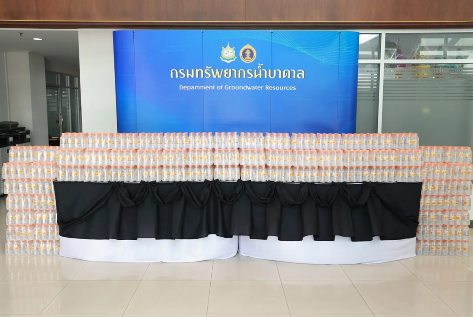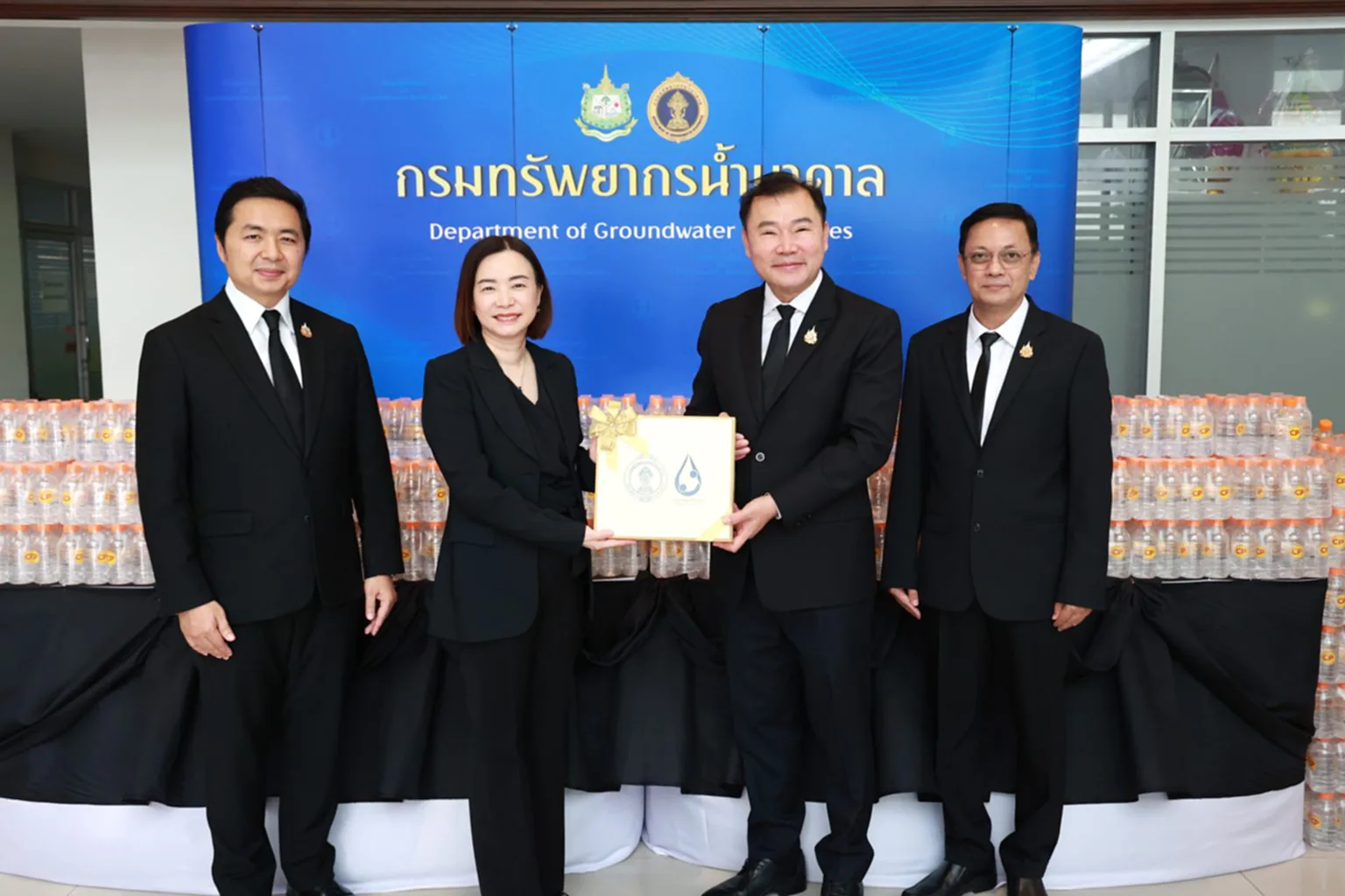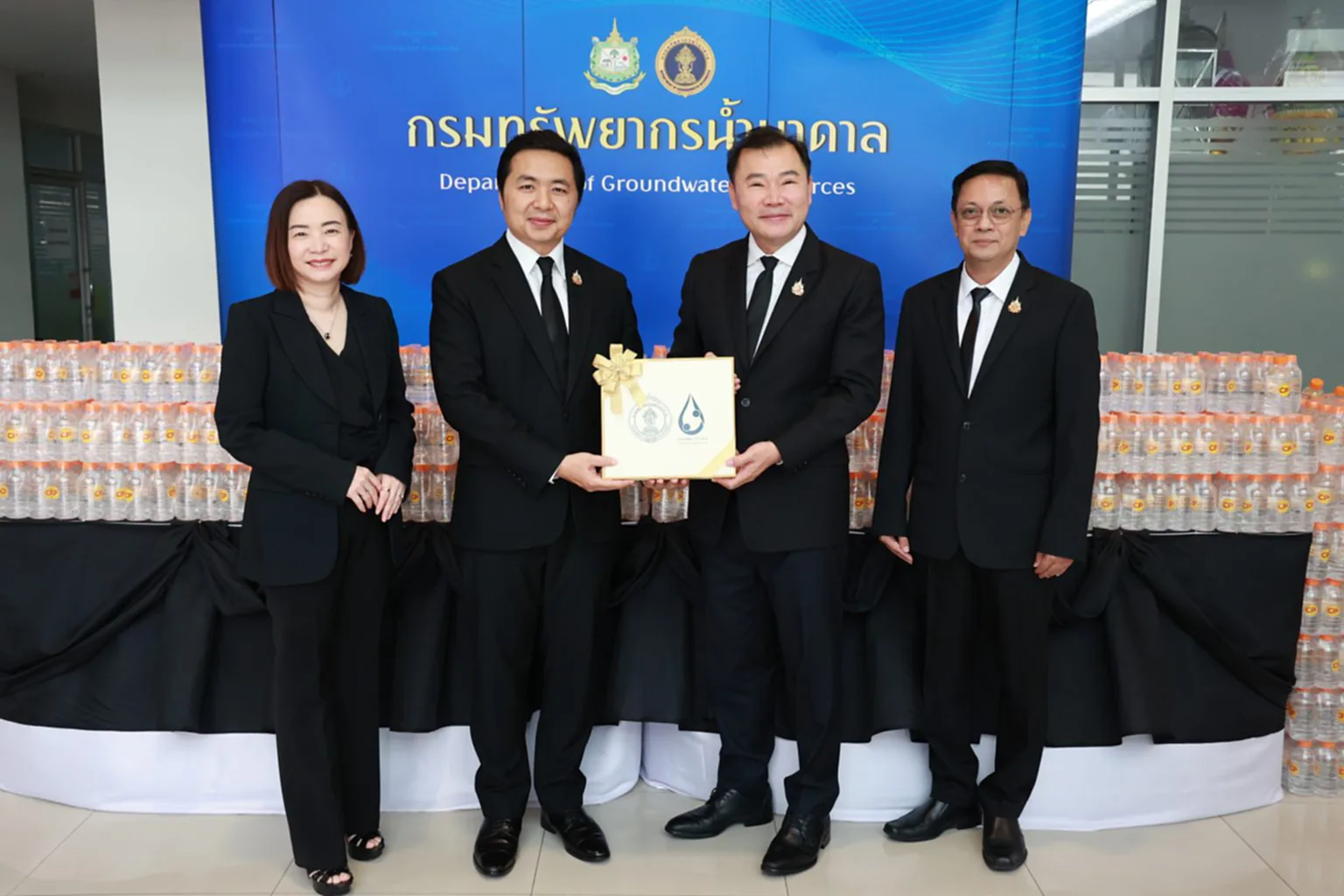 วันที่ 18 พฤศจิกายน 2568 เวลา 09.30 น. ณ ลานอเนกประสงค์ ชั้น 2 กรมทรัพยากรน้ำบาดาล นายภาดล ถาวรกฤชรัตน์ อธิบดีกรมทรัพยากรน้ำบาดาล เป็นผู้แทนกระทรวงทรัพยากรธรรมชาติและสิ่งแวดล้อม นำคณะผู้บริหารกรมทรัพยากรน้ำบาดาล ให้การต้อนรับ คุณพิมลรัตน์ รีพัฒนาวิจิตรกุล ประธานผู้บริหารทรัพยากรบุคคล เครือเจริญโภคภัณฑ์ และคุณจอมกิตติ ศิริกุล ผู้บริหารสูงสุดด้านพัฒนาความยั่งยืนภาครัฐและกิจการสัมพันธ์ เครือเจริญโภคภัณฑ์ ในโอกาสส่งมอบน้ำดื่มสะอาดบรรจุขวด ขนาด 350 มิลลิลิตร จำนวน 100,000 ขวด ให้แก่กระทรวงทรัพยากรธรรมชาติและสิ่งแวดล้อม โดยกรมทรัพยากรน้ำบาดาลจะนำน้ำดื่มบรรจุขวดดังกล่าว เพื่อสนับสนุนและให้บริการแก่ประชาชนที่เดินทางเข้าเฝ้าฯ กราบถวายบังคมพระบรมศพ สมเด็จพระนางเจ้าสิริกิติ์ พระบรมราชินีนาถ พระบรมราชชนนีพันปีหลวง ณ พระที่นั่งดุสิตมหาปราสาท ในพระบรมมหาราชวัง เพื่อถวายเป็นพระราชกุศล และแสดงออกถึงความจงรักภักดี สำนึกในพระมหากรุณาธิคุณอันหาที่สุดมิได้