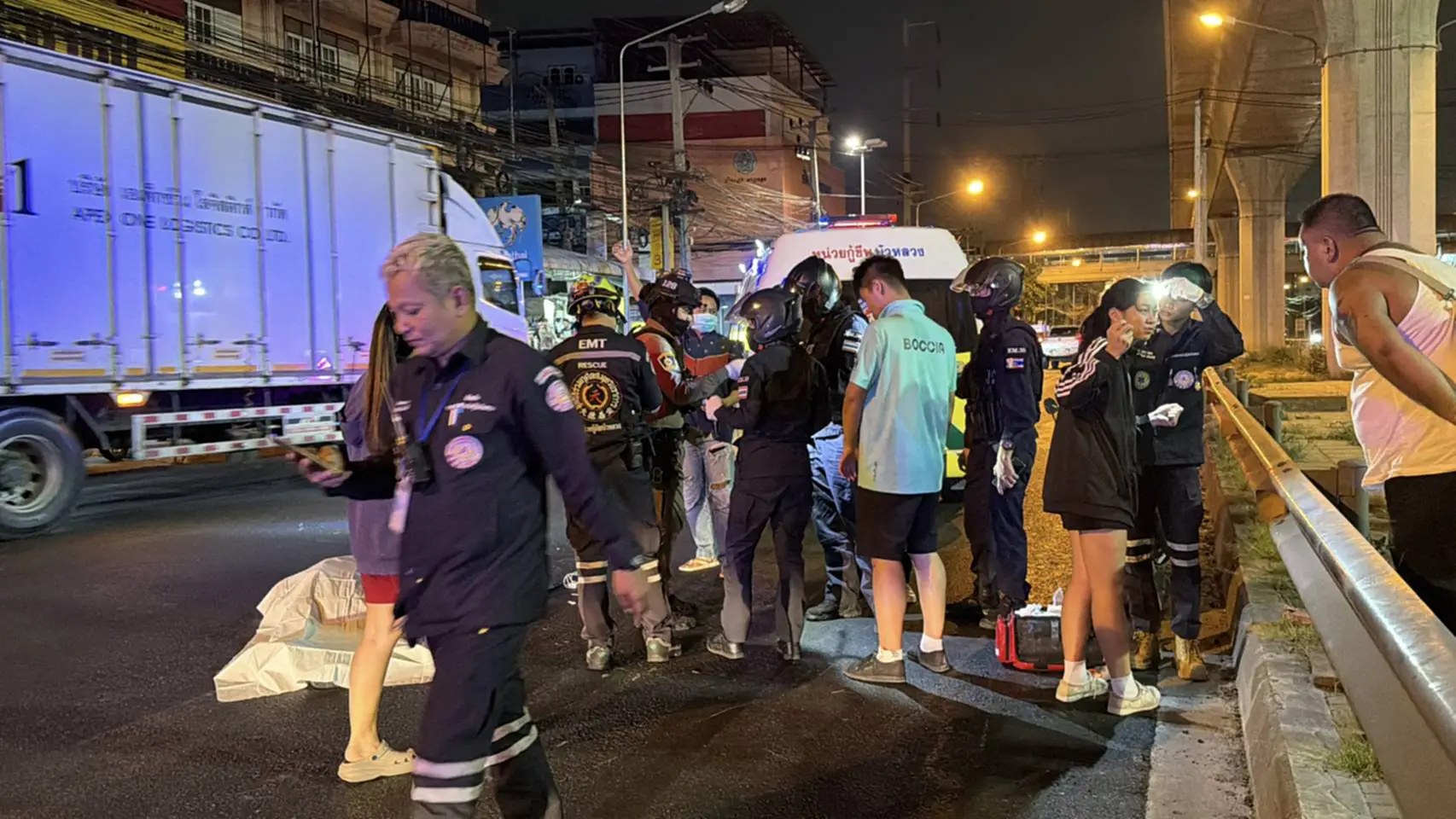 เจ้าหน้าที่ตำรวจ สภ.เมืองสมุทรปราการ พร้อมหน่วยกู้ภัยร่วมกุศลสมุทรปราการเข้าตรวจสอบ พบศพผู้เสียชีวิตในสภาพศีรษะถูกรถบรรทุกทับ ข้าวของเครื่องใช้ตกกระจายทั่วบริเวณ ส่วนรถจักรยานยนต์ล้มอยู่ริมทาง โดยรถบรรทุกคู่กรณีหลบหนีจากจุดเกิดเหตุทันที