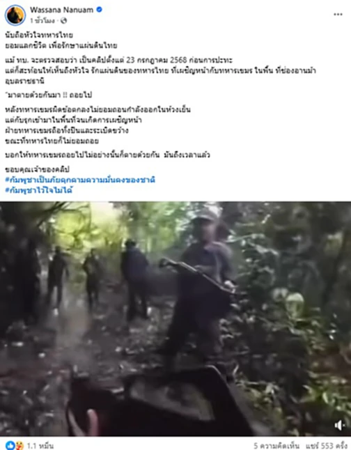 วันที่ 19 พ.ย.2568 วาสนา นาน่วม ผู้สื่อข่าวสายทหารออกมาโพต์ข้อความพร้อมคลิปวิดีโอระบุว่า นับถือหัวใจทหารไทย ยอมแลกชีวิต เพื่อรักษาแผ่นดินไทยแม้ ทบ. จะตรวจสอบว่า เป็นคลิปตั้งแต่ 23 กรกฎาคม 2568 ก่อนการปะทะ
