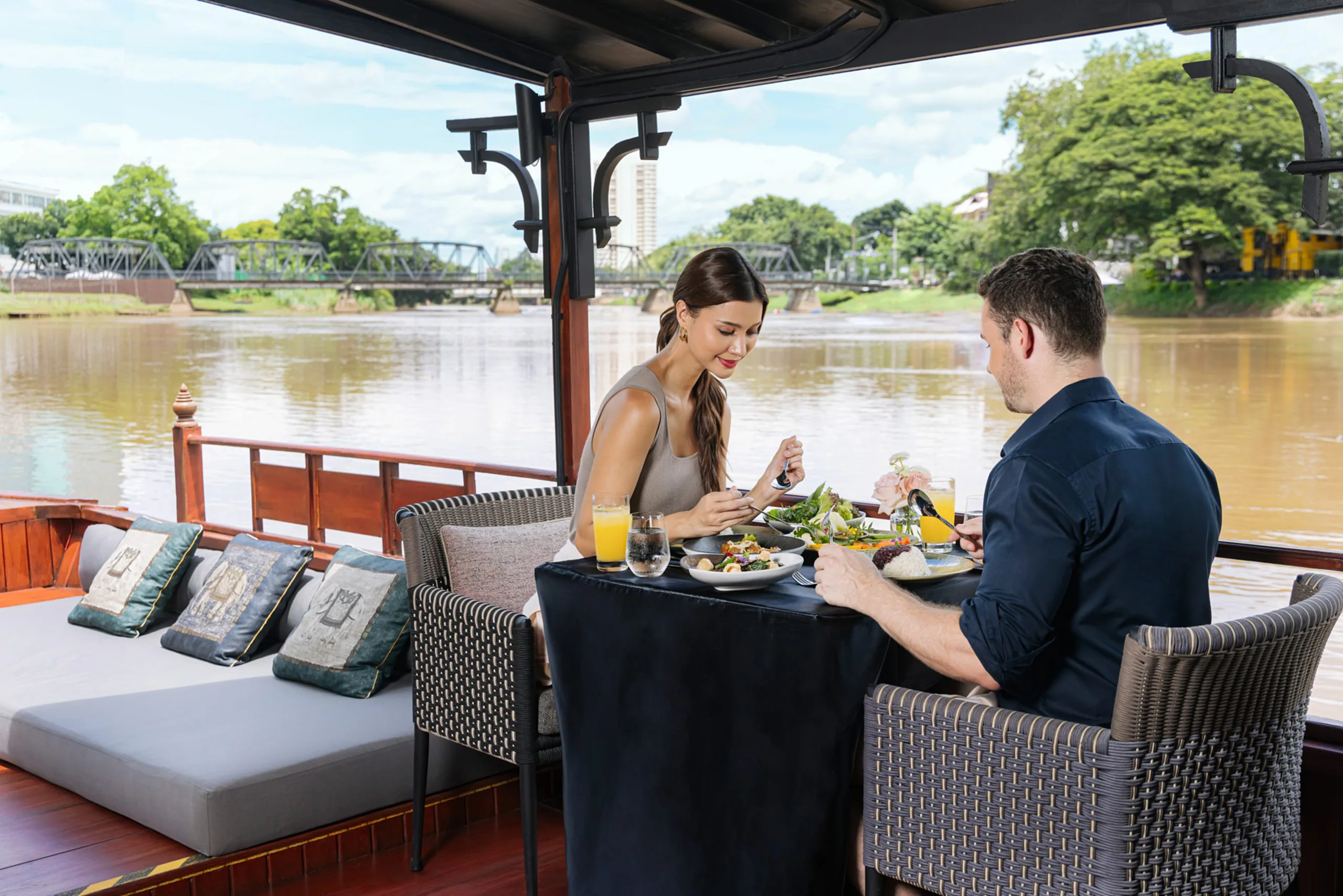 เมื่อกลับมาที่รีสอร์ท แขกจะลงเรือ “น้ำจิต” ซึ่งเป็นเรือท้องแบนไม้สักขนาด 21 เมตร สร้างในสไตล์ล้านนา ตัวเรือเปิดโล่งทุกด้าน ทำให้สัมผัสลมเย็นสบายและชมวิวแม่น้ำได้รอบทิศ ภายใต้คำแนะนำจากเชฟผู้เชี่ยวชาญ แขกจะได้เรียนทำอาหารไทยเมนูยอดนิยม เช่น ต้มยำกุ้ง และแกงเขียวหวาน รวมถึงเมนูอาหารเหนืออย่างข้าวซอย แกงฮังเล และน้ำพริกอ่อง หลังจากนั้นแขกจะได้อิ่มอร่อยกับอาหารมื้อเที่ยงฝีมือตนเองบนเรือ พร้อมเพลิดเพลินไปกับทัศนียภาพริมฝั่งน้ำของเมืองเชียงใหม่ ปิดท้ายด้วยการมอบประกาศนียบัตร Spice Spoons และสูตรอาหารให้กลับไปทำที่บ้านได้
