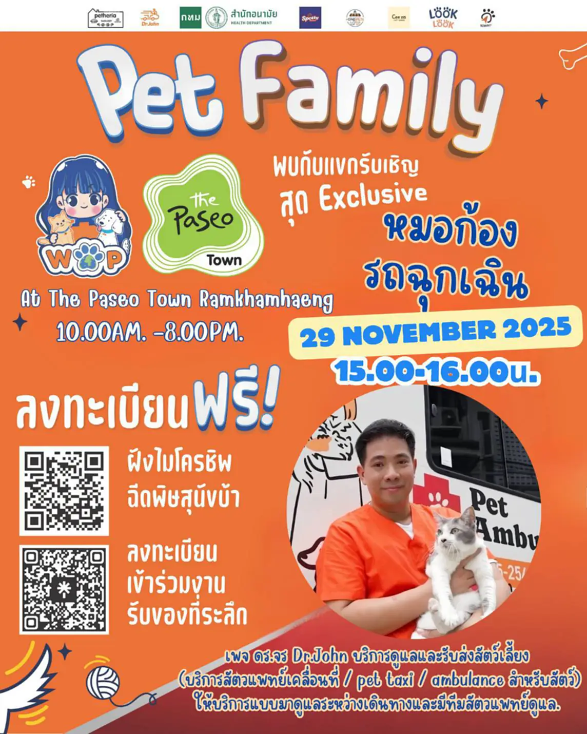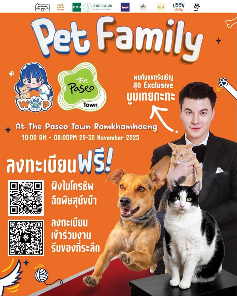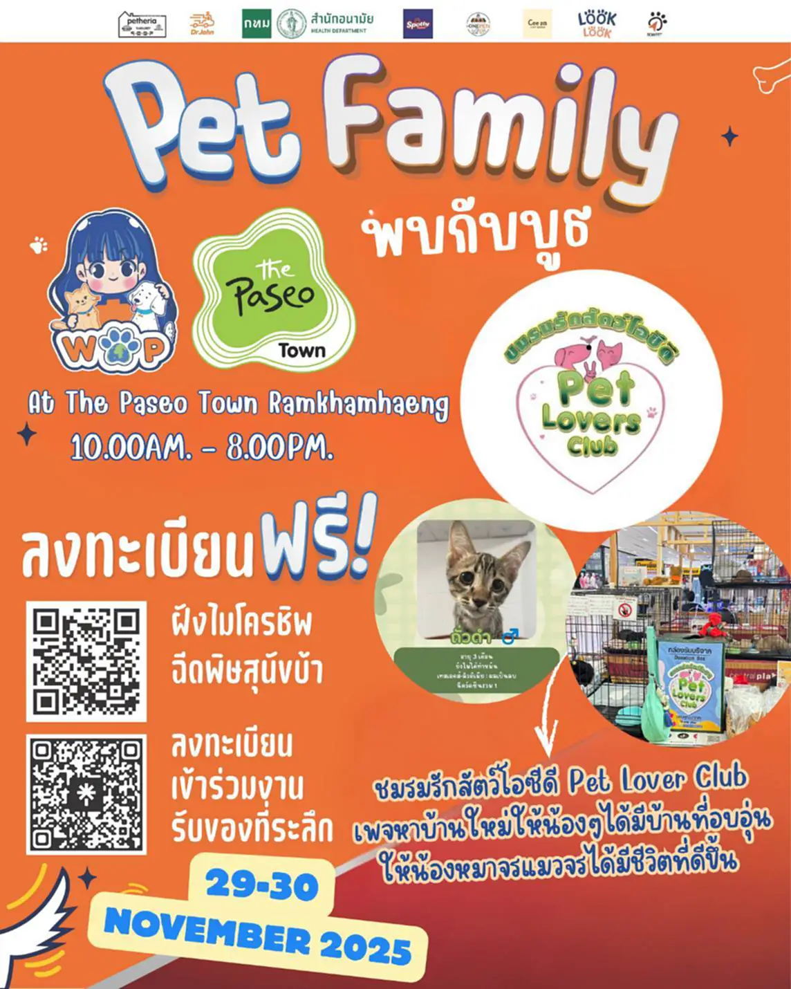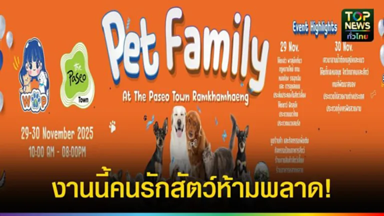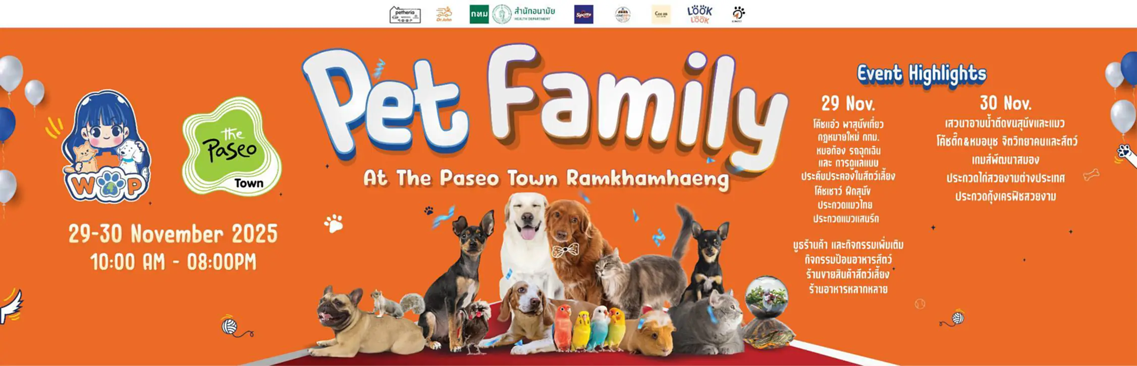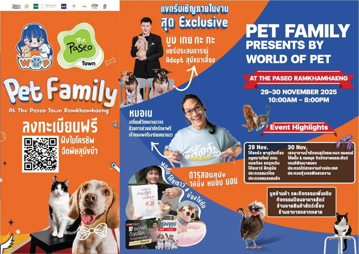 นางกชมน ผู้มีสิทธิ์  ประธานบริหาร บริษัท โลกของสัตว์(ไทยแลนด์) จำกัด เปิดเผยว่า  คนรักสัตว์ไม่ควรพลาด งาน “Pet Family By World of pet at the Paseo town Ramkhamhaeng”  ซึ่งจะมีการจัดขึ้นระหว่างวันที่ 29-30 พฤศจิกายน 2568  ระหว่างเวลา 10.00-20.00น. ที่ พาซีโอ สาขารามคำแหง  กรุงเทพมหานคร   โซน ชั้น 1 และชั้น 2  ตั้งแต่ เวลา: 10:00 น. – 20:00 น. ขนความสนุกและความรู้มาให้ทั้งครอบครัวคนรักสัตว์อย่างยิ่งใหญ่ส่งท้ายปี   ภายในงาน กิจกรรมแน่น สาระครบ กิจกรรมสำหรับครอบครัวและเด็กๆ งานนี้เน้นกิจกรรมอบอุ่นสไตล์ Pet Family โดยเฉพาะสำหรับครอบครัวคนรักสัตว์ ที่จะช่วยฝึกความอ่อนโยนให้กับเด็กๆ อาทิ