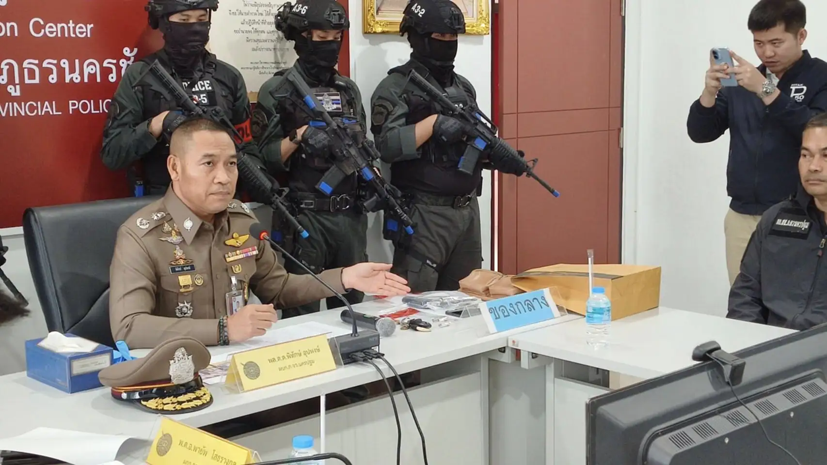 วันที่ 19 พ.ย.2568 เวลา 13.00 น. ที่ สภ.นครชัยศรี จ.นครปฐม พล.ต.ต.พิทักษ์ อุปพงษ์ ผบก.ภ.จว.นครปฐม พร้อมด้วย พ.ต.อ.พายัพ โสธรางกูล ผกก.สภ.นครชัยศรี พ.ต.ท.อิสรภาพ แก้วชลคราม รอง ผกก.ป.สภ.นครชัยศรี พ.ต.ท.ณรงค์ แก้วศรี รอง ผกก.สส.ภ.จว.นครปฐม พ.ต.ท.นาวิน ทรงละออ รอง ผกก.(สอบสวน) สภ.นครชัยศรี ชุดสืบสวน ภ.จว.นครปฐม ชุดสืบสวน สภ.นครชัยศรี และเจ้าหน้าที่ที่เกี่ยวข้อง ร่วมแถลงข่าวการจับกุม ผู้ต้องหาในคดี พยายามฆ่าผู้อื่น ผู้ต้องหาคือ นางสุนันต์(สงวนนามสกุล) อายุ 59 ปี พร้อมของกลางที่ตรวจยึดได้ อาวุธปืนสั้น ชนิดลูกโม่ ขนาด .38 ยี่ห้อสมิธแอนด์เวสสัน (มีใบ ป.4) รถเก๋งซูซูกิ สีขาว ปลอกกระสุนปืนขนาด .38 จำนวน 4 ปลอก กระสุนปืนขนาด .38 จำนวน 1 กระบอก