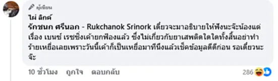และว่า “เดี๋ยวจะมาอธิบายให้ฟังนะจ๊ะน้อง แต่เรื่อง เบนซ์ เรซซิ่ง เขายกฟ้องแล้ว ซึ่งไม่เกี่ยวกับยาเสพติดใดใดทั้งสิ้น อย่าทำร้ายเหยื่อเลยเพราะวันนี้เค้าก็เป็นเหยื่อมาทีนึง แล้วเช็กข้อมูลดีๆ ก่อน รอเดี๋ยวนะจ๊ะ”
