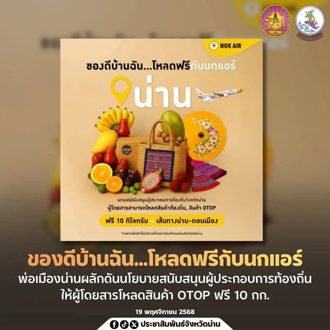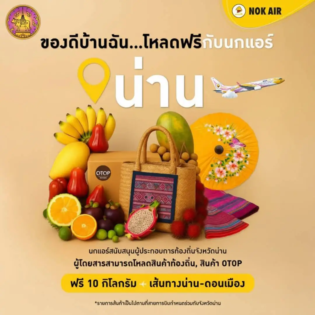 นกแอร์ได้ประกาศมาตรการสนับสนุนเศรษฐกิจฐานราก ผ่านโครงการให้ผู้โดยสารสามารถ โหลดสินค้าท้องถิ่นและสินค้า OTOP ฟรี 10 กิโลกรัม ในเส้นทางบิน น่าน–ดอนเมือง ช่วยเพิ่มโอกาสให้สินค้าชุมชนเข้าถึงตลาดกว้างขึ้น พร้อมทั้งเป็นแรงกระตุ้นการท่องเที่ยวและเศรษฐกิจเชิงสร้างสรรค์ของจังหวัด