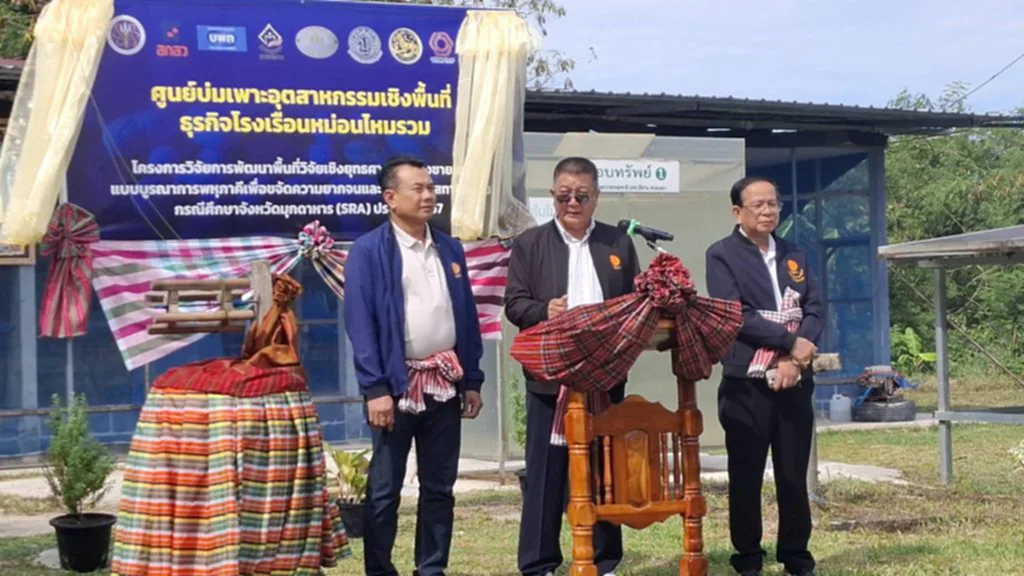 แก้จน มุกดาหาร เปิดป้ายศูนย์บ่มเพาะอุตสาหกรรมเชิงพื้นที่ธุรกิจโรงเรือนหม่อนไหม