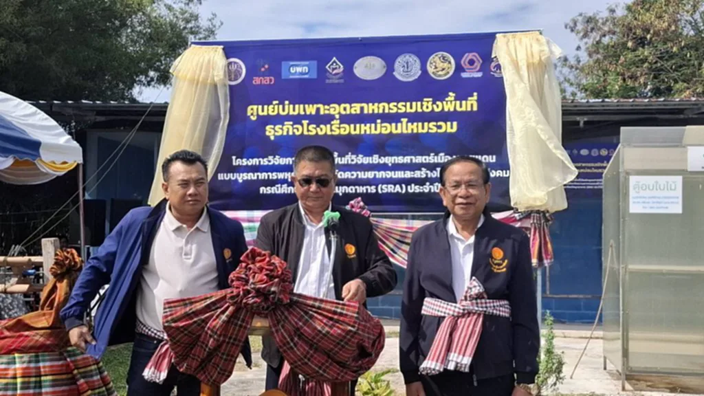 เวลา 13.00 น. วันที่ 20 พฤศจิกายน 2568 นายองค์การ ชัยบุตร รองประธานคณะกรรมาธิการแก้ไขปัญหาความยากจน เป็นประธานเปิดกิจกรรมและเปิดป้ายศูนย์บ่มเพาะอุตสาหกรรมเชิงพื้นที่ธุรกิจโรงเรือนหม่อนไหม ณ บ้านอรัญญา ตำบล กกแดง ตำบลนิคมคำสร้อย จังหวัดมกดาหาร โดยมี ดร.อโศก พลบำรุง ผู้อำนวยการฝ่ายวิจัยและนวัตกรรมหน่วยบริหารและจัดการทุนด้านการพัฒนาระดับพื้นที่ กล่าวรายงาน โดยมีนายพรวุฒิ คำแก้ว ผู้อำนวยการวิทยาลัยชุมชมชนมุกดาหาร ดร.ทิวากร เหล่าลือชา รองผู้อำนวยการฯ หัวหน้าส่วนราชการ ภาครัฐ ภาคเอกชน และ ทีมวิจัย ร่วมด้วย ภายใต้โครงการด้านอุตสาหกรรมเชิงพื้นที่ธุรกิจโรงเรือนหม่อนไหม และกิจกรรมการศึกษาดูงาน ซึ่งจัดขึ้นภายใต้โครงการวิจัยการพัฒนาพื้นที่วิจัยแบบบูรณาการพหุภาคี “Mukdahan Mode!”และโครงการพัฒนาศักยภาพอุตสาหกรรมเชิงพื้นที่ธุรกิจหม่อนไหม “Area Based Industry” พร้อมทั้งการสัมมนาเรื่อง “ปัญหาหนี้สินเกษตรกรและสถาบันเกษตรไทย” การดำเนินโครงการเหล่านี้สะท้อนความมุ่งมั่นของทุกภาคส่วนในการร่วมมือกันแก้ไขปัญหา ความยากจน ลดความเหลื่อมล้ำและสร้างโอกาสทางเศรษฐกิจแก่ประชาชนในจังหวัดมุกดาหารอย่างยั่งยืน โดยเฉพาะการจัดตั้งศูนย์บ่นเพาะอุตสาหกรรมเชิงพื้นที่ธุรกิจโรงเรือน หม่อนไหม แห่งนี้ขึ้นเพื่อเป็นแหล่งเรียนรู้ พัฒนาอาชีพ ต่อยอดองค์ความรู้ และเพิ่มรายได้ให้แก่ชุมชนในระยะยาว