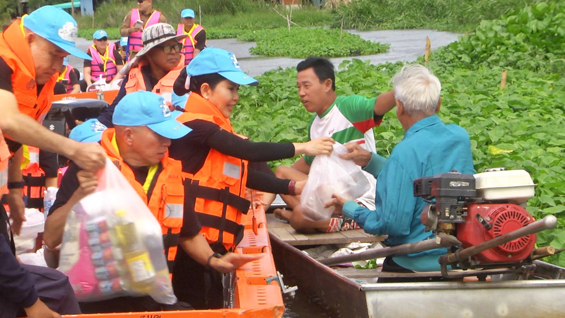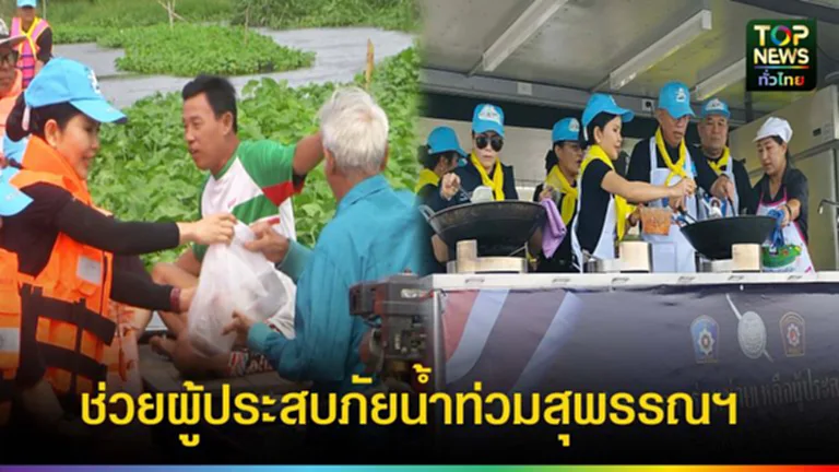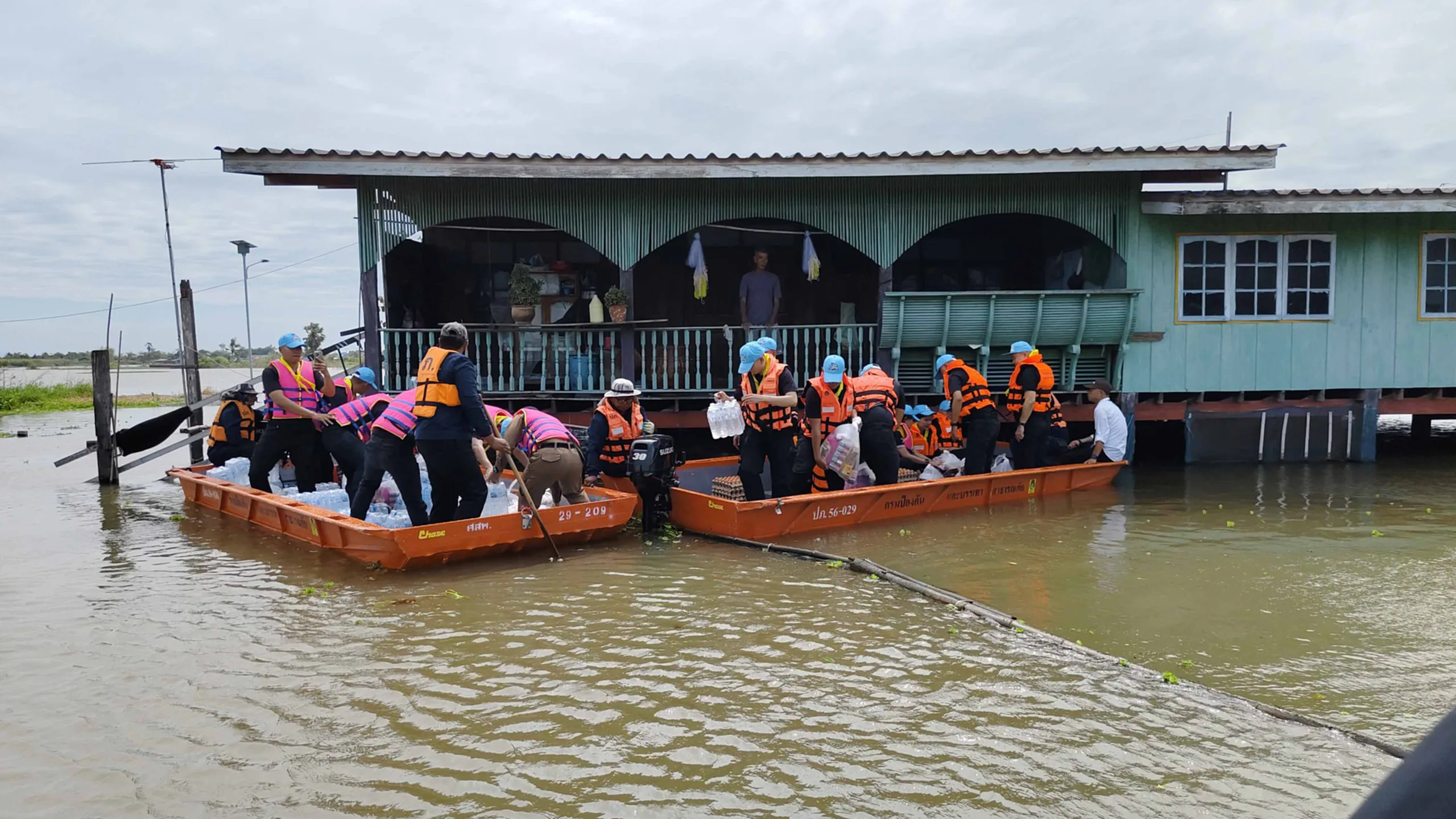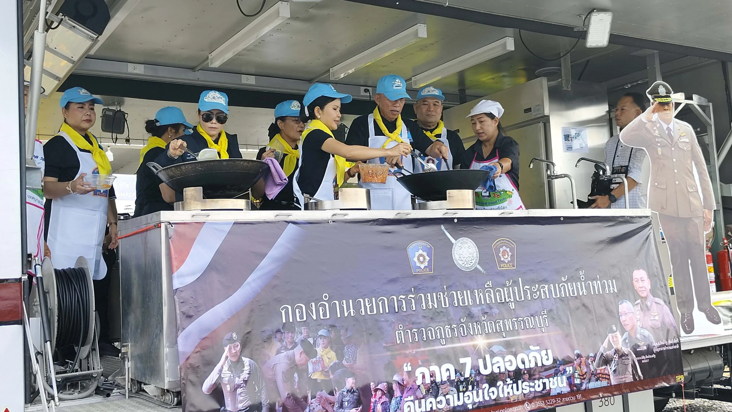สุพรรณบุรี///ตำรวจภาค7พร้อมคณะแม่บ้านลงเรือช่วยผู้ประสบภัยน้ำท่วมสุพรรณฯ ตั้งครัวเคลื่อนที่ มอบข้าวกล่อง 500 ครัวเรือน