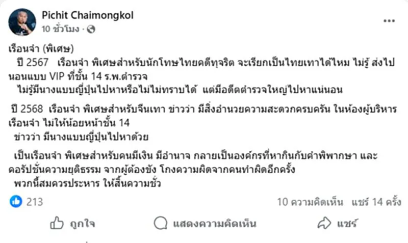 “พิชิต” คปท.จวกเดือด ต้องจับประหาร “เรือนจำพิเศษ” หากินกับคำพิพากษา เอื้อฉาว VIP ไทยเทา-จีนเทา ในคุก