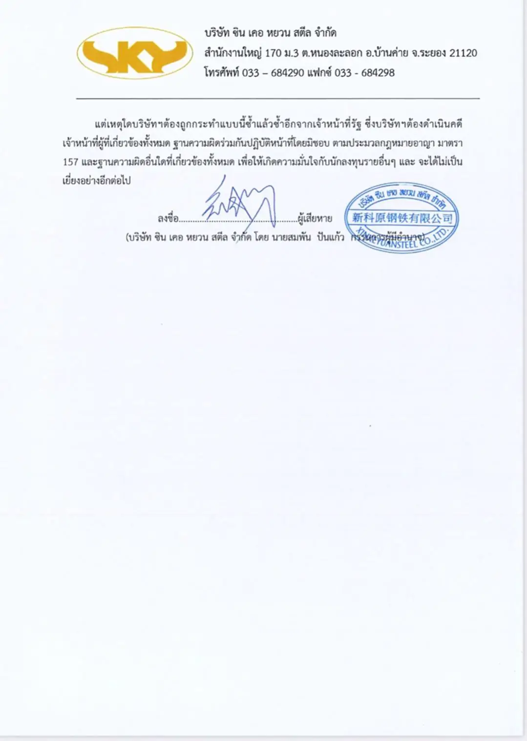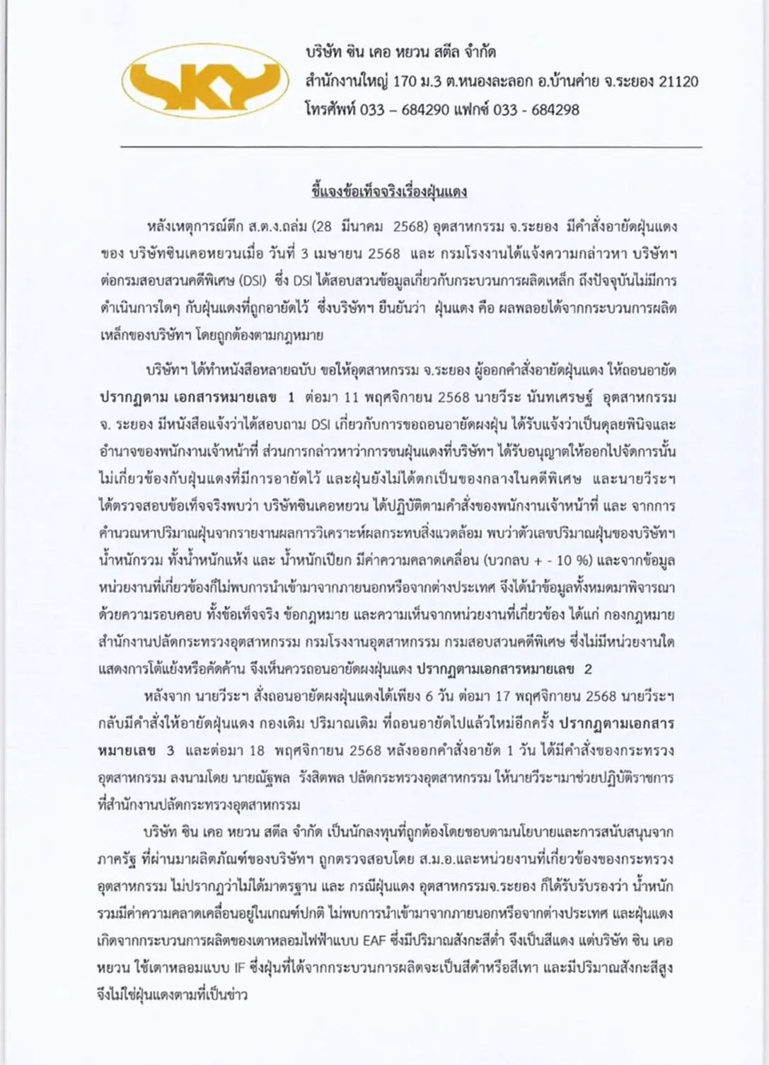 เมื่อวันที่ 21 พฤศจิกายน 2568 นายเขมพัสตร์ กิตติภัคดีกุล ผู้จัดการบริษัทซิน เคอ หยวน สตีล จำกัด เปิดเผยว่า บริษัทฯได้ออกหนังสือชี้แจงข้อเท็จจริงเรื่องฝุ่นแดง ลงนามโดยนายสมพัน ปันแก้ว กรรมการผู้มีอำนาจ ว่า หลังเหตุการณ์ตึก ส.ต.ง.ถล่ม (28 มีนาคม 2568) อุตสาหกรรม จ.ระยอง มีคำสั่งอายัดฝุ่นแดงของ บริษัทซินเคอหยวนเมื่อ วันที่ 3 เมษายน 2568 และ กรมโรงงานได้แจ้งความกล่าวหา บริษัทฯ ต่อกรมสอบสวนคดีพิเศษ (DSI) ซึ่ง DSI ได้สอบสวนข้อมูลเกี่ยว กับกระบวนการผลิตเหล็ก ถึงปัจจุบันไม่มีการดำเนินการใดๆ กับฝุ่นแดงที่ถูกอายัดไว้ ซึ่งบริษัทฯ ยืนยันว่า ฝุ่นแดง คือ ผลพลอยได้จากกระบวนการผลิตเหล็กของบริษัทฯ โดยถูกต้องตามกฎหมาย