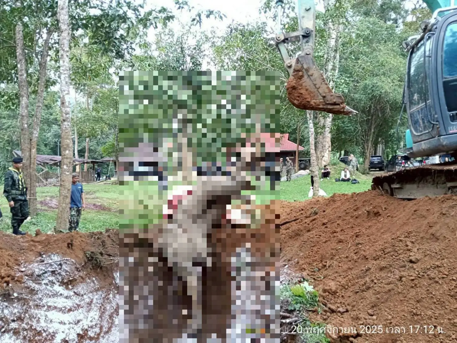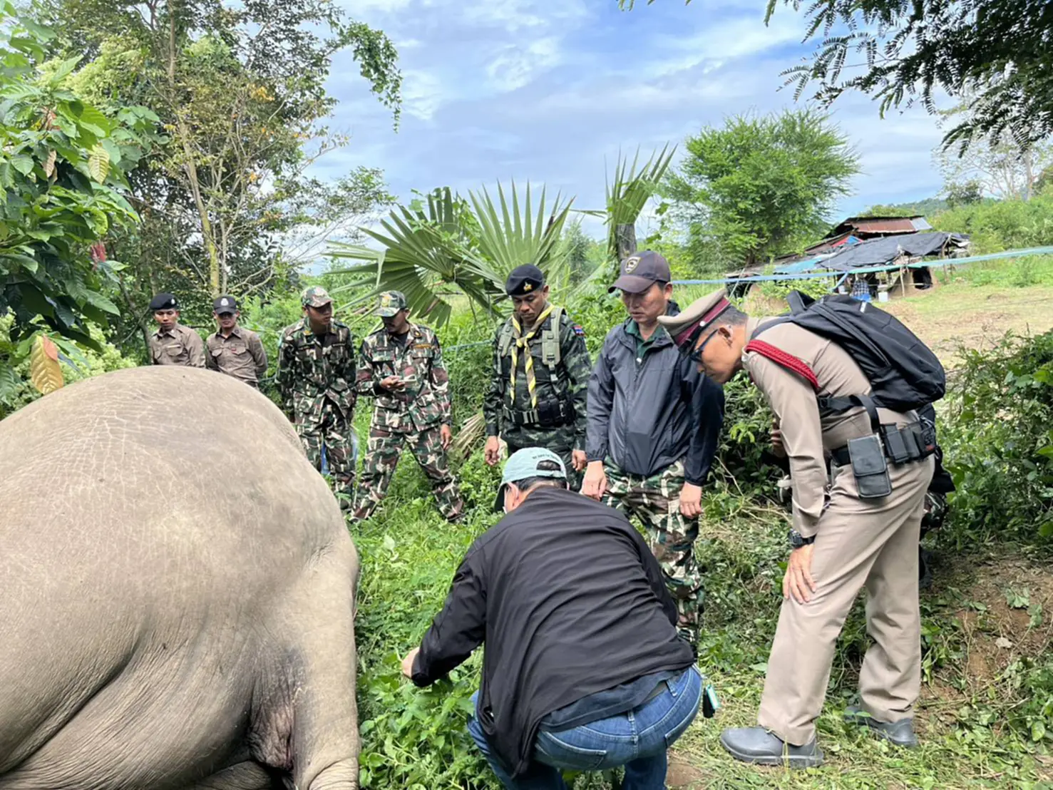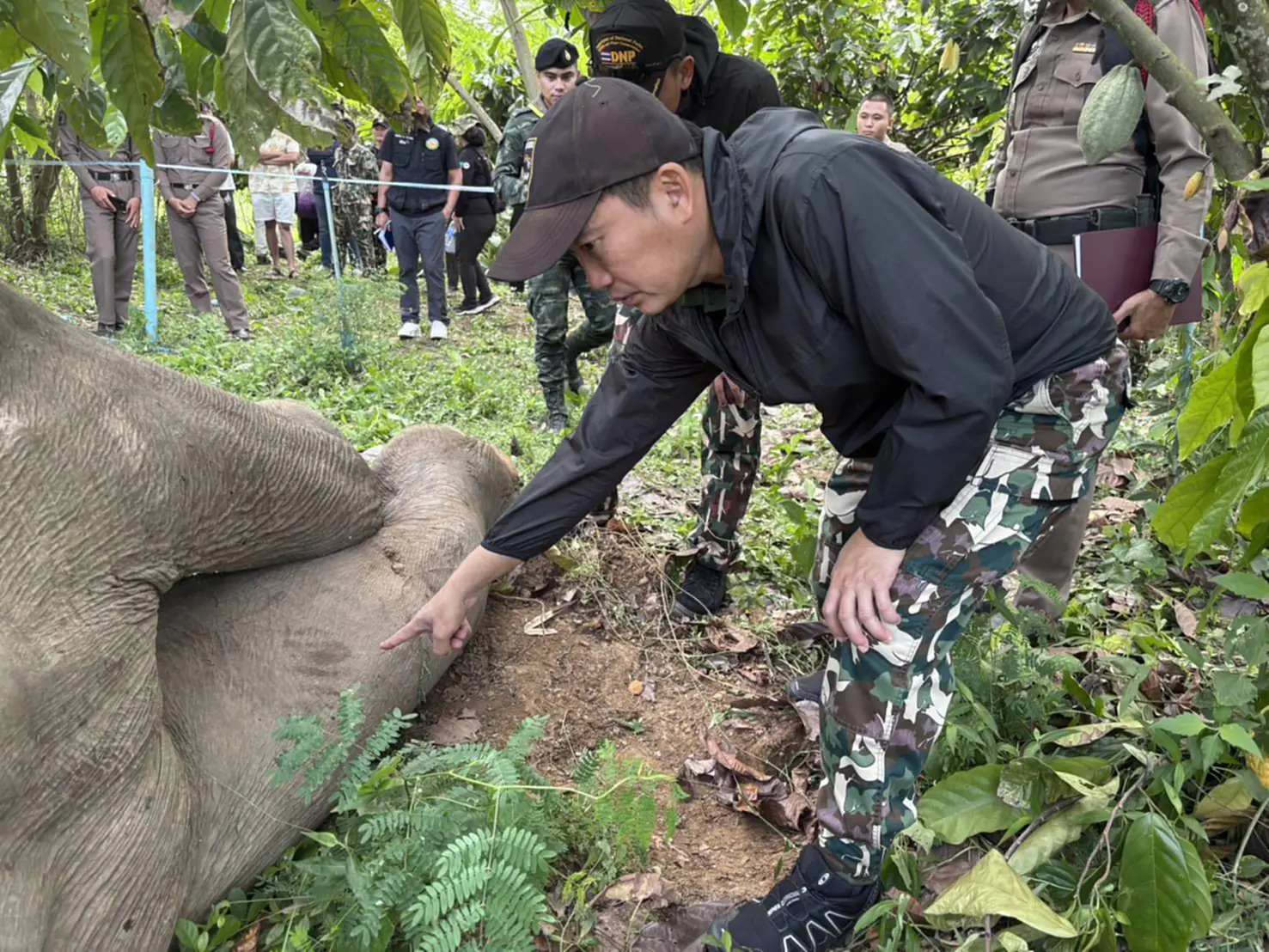 ผลการตรวจสอบ (วันที่ 20 พ.ย. 68 เวลา 10.00 น. ) พื้นที่เกิดเหตุ คณะเจ้าหน้าที่ได้สอบถามเจ้าของสวน ทราบชื่อ นายประยูร (สงวนนามสกุล) อายุ 73 ปี พบว่ามีช้างตายอยู่ในสวนของตัวเอง เมื่อเวลาประมาณ 08.00 น. กำลังจะลงมาฉีดยาที่สวน แต่เมื่อเดินมาถึงท้ายสวนพบว่ามีช้างป่านอนตายอยู่ จึงได้โทรแจ้งไปยังกำนันบุญลือ มั่งมี กำนันตำบลป่าเด็ง และแจ้งเจ้าหน้าที่อุทยานฯ ต่อไป จากการตรวจสอบพื้นที่เกิดเหตุ พบซากช้างป่าสีดอ เพศผู้ อายุประมาณ 15 ปี น้ำหนักประมาณ 3 ตัน นอนตายในท่านอนตะแคงซ้าย อยู่ในสวนของนายประยูร ในสภาพที่มีลักษณะเหมือนชักเกร็ง ขาหลังเหยียดตรง มีรอบไหม้บริเวณผิวหนัง และมีลวดพันอยู่บริเวณขาหลังข้างขวาและพาดลำตัวอยู่ คาดว่าตายเมื่อคืน