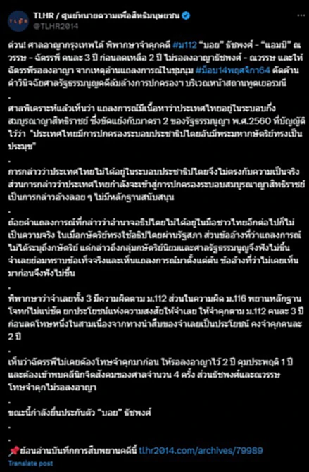 ศาลพิเคราะห์แล้วเห็นว่า แถลงการณ์มีเนื้อหาว่าประเทศไทยอยู่ในระบอบกึ่งสมบูรณาญาสิทธิราชย์ ซึ่งขัดแย้งกับมาตรา 2 ของรัฐธรรมนูญฯ พ.ศ.2560 ที่บัญญัติไว้ว่า “ประเทศไทยมีการปกครองระบอบประชาธิปไตยอันมีพระมหากษัตริย์ทรงเป็นประมุข”