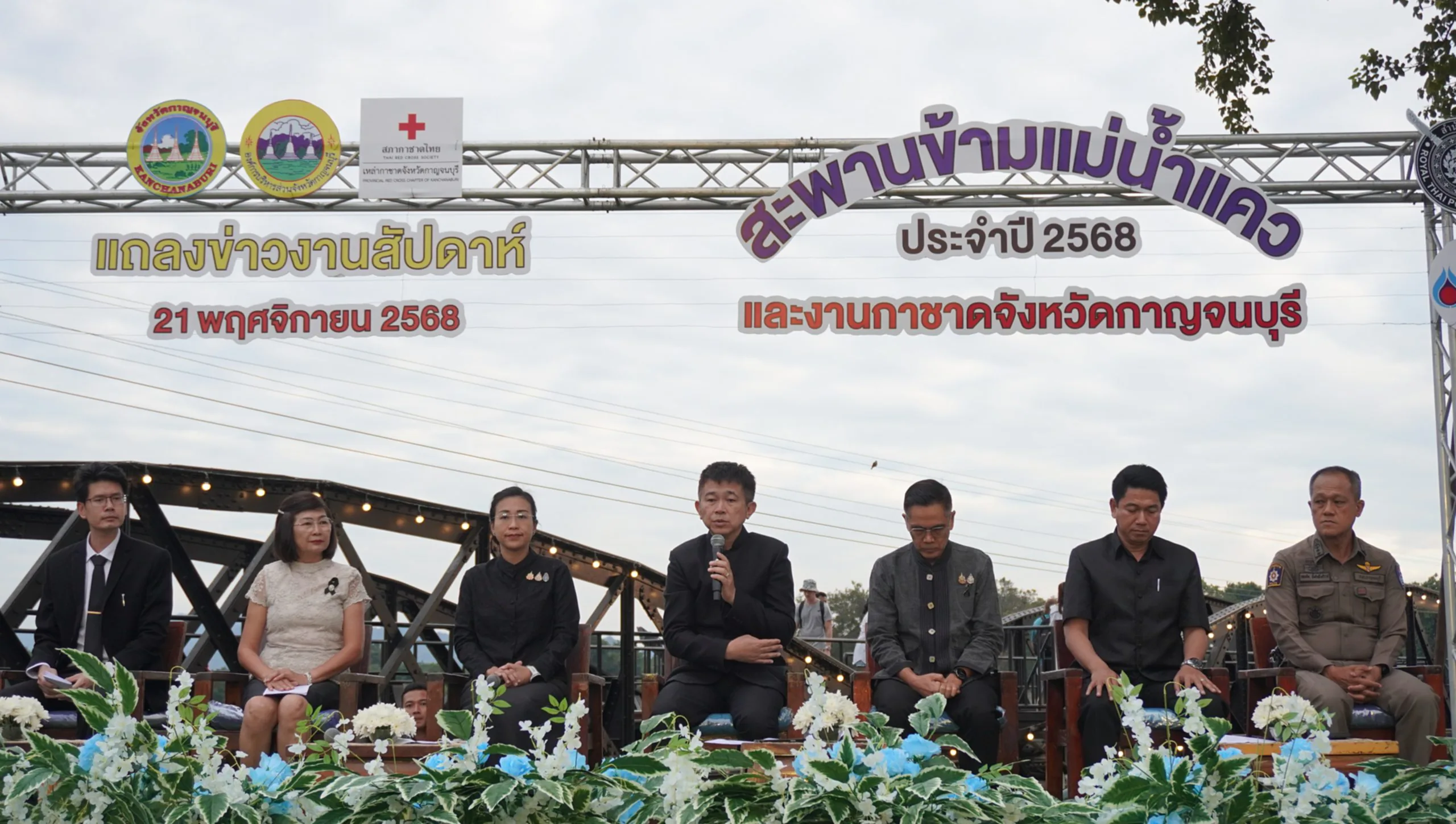 วันที่ 21 พฤศจิกายน 2568 เวลา 17.00 น. ณ บริเวณสะพานข้ามแม่น้ำแคว ตำบลท่ามะขาม อำเภอเมืองกาญจนบุรี จังหวัดกาญจนบุรี นายวุฒิพงษ์ สุภัควนิช รองผู้ว่าราชการจังหวัดกาญจนบุรี รักษาราชการแทนผู้ว่าราชการจังหวัดกาญจนบุรี เป็นประธานการแถลงข่าวการจัดงานสัปดาห์สะพานข้ามแม่น้ำแควและงานกาชาดจังหวัดกาญจนบุรี ประจำปี 2568 พร้อมด้วย นางพรรณวิภา ปิยัมปุตระ นายกเหล่ากาชาดจังหวัดกาญจนบุรี นายฑรัท เหลืองสอาด ปลัดจังหวัดกาญจนบุรี นายสมเกียรติ ยุพาพิน ปลัดองค์การบริหารส่วนจังหวัดกาญจนบุรี พ.ต.อ. สนธทัต ตั้งสิทธิ์เสรีวงศ์ รองผู้บังคับการตำรวจภูธรจังหวัดกาญจนบุรี นายแพทย์ ไชยวัฒน์ เพชรพรรณงาม รองนายแพทย์สาธารณสุขจังหวัดกาญจนบุรี และนางสาวจรรยารักษ์ สาธิตกิจ ท่องเที่ยวและกีฬาจังหวัดกาญจนบุรีร่วมแถลงข่าวฯ โดยมี นายสิทธิวีร์ วรรณพฤกษ์ รองผู้ว่าราชการจังหวัดกาญจนบุรี หัวหน้าส่วนราชการ เจ้าหน้าที่ที่เกี่ยวข้อง สื่อมวลชน และชาวจังหวัดกาญจนบุรีร่วมรับฟังการแถลงข่าวฯ