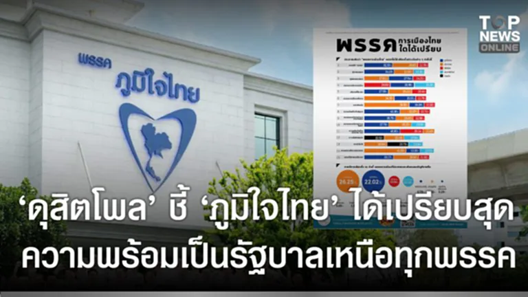 23 พ.ย. 2568 “สวนดุสิตโพล” มหาวิทยาลัยสวนดุสิต สำรวจความคิดเห็นประชาชนทั่วประเทศ เรื่อง “พรรคการเมืองไทย พรรคใดได้เปรียบ” กลุ่มตัวอย่าง จำนวน 1,794 คน (สำรวจทางออนไลน์และภาคสนาม) ระหว่างวันที่ 19-21 พฤศจิกายน 2568 พบว่า พรรคภูมิใจไทยถือเป็นพรรคที่มีความได้เปรียบมากที่สุดถึง 8 ข้อ โดยเฉพาะด้านความพร้อมที่จะเป็นรัฐบาล ร้อยละ 41.36 ความพร้อมด้านทรัพยากร (ทุน) ร้อยละ 40.80 และความสามารถในการทำงานทางการเมือง ร้อยละ 35.79 ขณะที่พรรคประชาชนมีความได้เปรียบเรื่องความทันสมัย ร้อยละ 50.06 รองลงมาคือ ความสามารถในการตรวจสอบ ร้อยละ 41.69 และความสามารถในการสื่อสาร ร้อยละ 34.39 ส่วนพรรคเพื่อไทยได้เปรียบเพียงข้อเดียว คือประสบการณ์ทางการเมือง ร้อยละ 29.88 ด้านประเด็นความซื่อสัตย์สุจริต ประชาชนยังไม่แน่ใจว่าพรรคใดมีความโดดเด่น ร้อยละ 22.52 สุดท้ายเมื่อถามว่าหากมีการเลือกตั้ง ณ วันนี้ พรรคการเมืองที่จะเลือกแบบบัญชีรายชื่อ คือ พรรคประชาชนมากที่สุด ร้อยละ 26.25 รองลงมาคือพรรคภูมิใจไทย ร้อยละ 22.02 และพรรคเพื่อไทย ร้อยละ 12.54