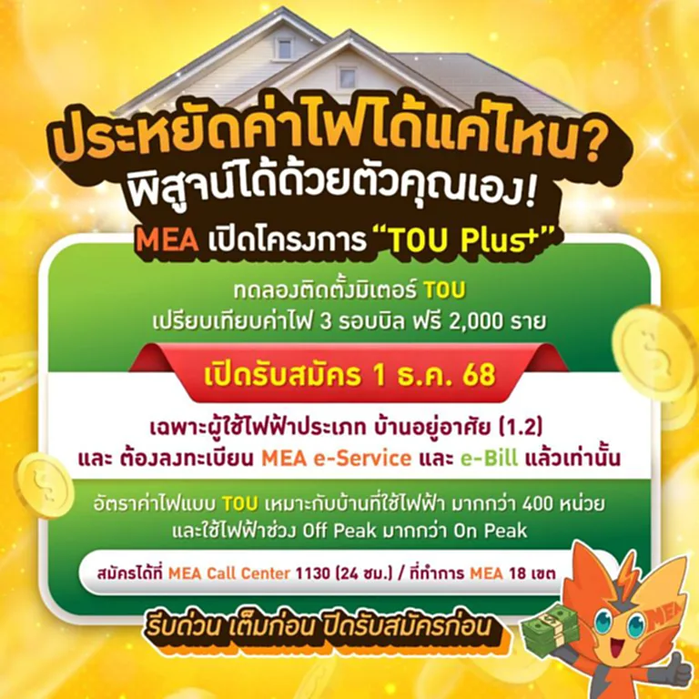 เพื่อสนับสนุนนโยบายรัฐบาลด้านการลดค่าไฟฟ้าให้ประชาชน MEA เปิดรับสมัครผู้เข้าร่วมโครงการ “TOU Plus” จำนวน 2,000 ราย เพื่อรับการติดตั้งเครื่องวัดหน่วยไฟฟ้าอัตรา TOU สำหรับทดลองเปรียบเทียบความแตกต่างของค่าไฟฟ้าระหว่างการใช้ไฟฟ้าภายใต้อัตราปกติ (อัตรา 1.2) และอัตรา TOU (อัตรา 1.3) โดยยังไม่ต้องเสียค่าใช้จ่ายในการเปลี่ยนเครื่องวัดหน่วยไฟฟ้า และ MEA จะแจ้งผลการเปรียบเทียบค่าไฟฟ้าจำนวน 3 รอบบิล ให้ผู้เข้าร่วมโครงการฯ ทาง e-Mail หากผู้เข้าร่วมโครงการฯ ประสงค์จะเปลี่ยนประเภทการใช้ไฟฟ้าเป็นอัตรา TOU อย่างถาวร จะต้องชำระค่าใช้จ่ายตามที่ MEA กำหนด