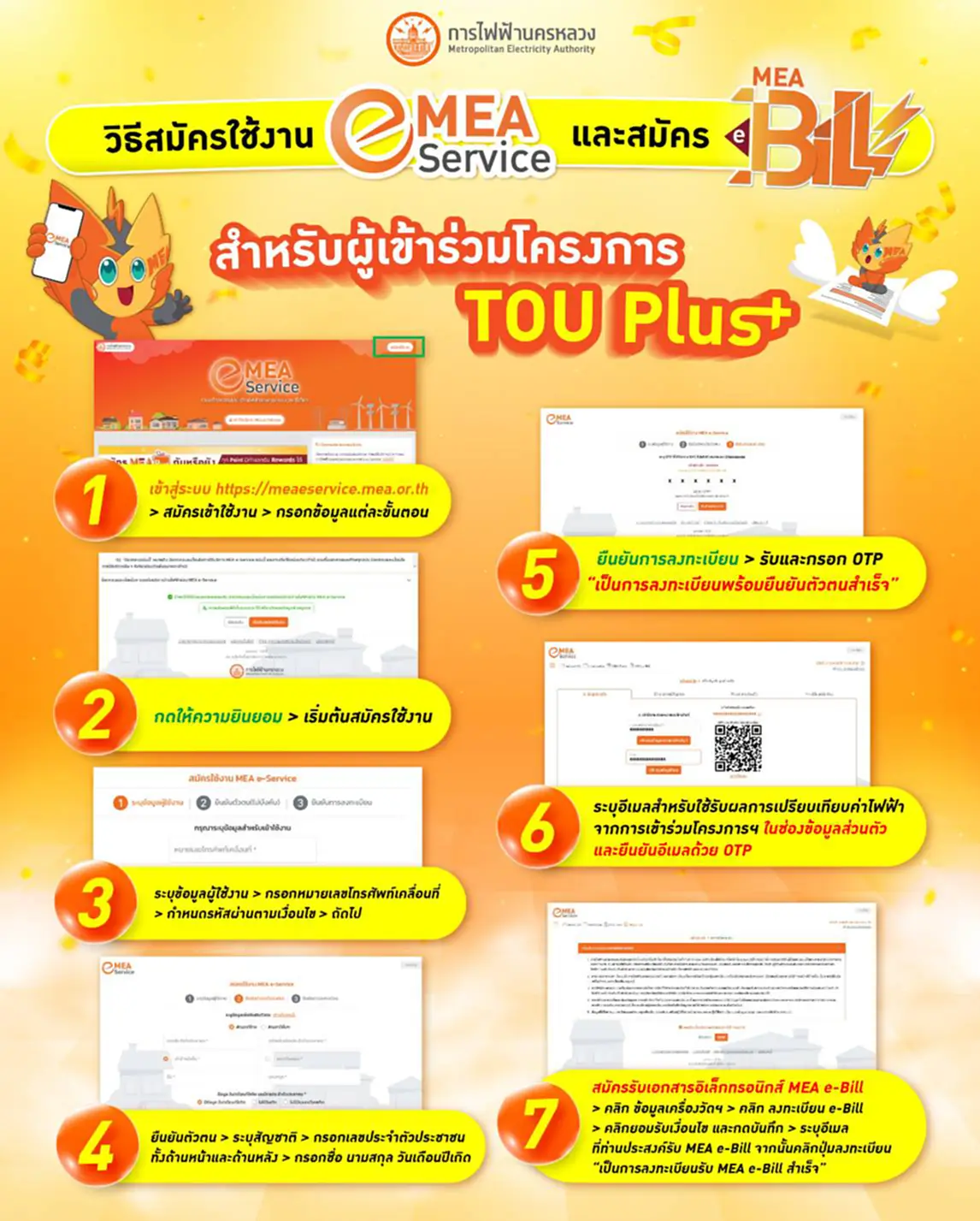 – ได้ลงทะเบียนใช้งาน MEA e-Service พร้อมยืนยันตัวตน ระบุ e-Mail Address สำหรับใช้ในการติดต่อ และสมัครใช้บริการ MEA e-Bill สำหรับเครื่องวัดหน่วยไฟฟ้าที่จะเข้าร่วมโครงการฯ แล้วเสร็จ ก่อนสมัครเข้าร่วมโครงการฯ (รายละเอียดขั้นตอนการลงทะเบียนฯ ตรวจสอบได้จาก Infographic ท้ายข่าว)