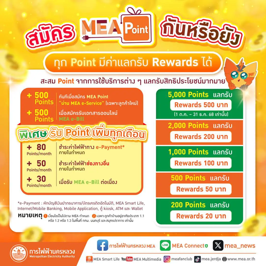 สำหรับผู้สนใจเข้าร่วมโครงการฯ ที่ยังไม่เคยลงทะเบียนใช้งาน MEA e-Service และสมัครใช้บริการ MEA e-Bill เพื่อลดการใช้กระดาษมาก่อน เมื่อลงทะเบียนใช้งาน MEA e-Service พร้อมยืนยันตัวตน และสมัครใช้บริการ MEA e-Bill เรียบร้อยแล้ว จะได้รับ MEA Point จำนวน 1,000 Points ซึ่งสามารถนำไปแลกรับ Rewards ได้ตามเงื่อนไขที่ MEA กำหนด (รายละเอียดของ MEA Point และ Rewards ตรวจสอบได้จาก Infographic ท้ายข่าว)
