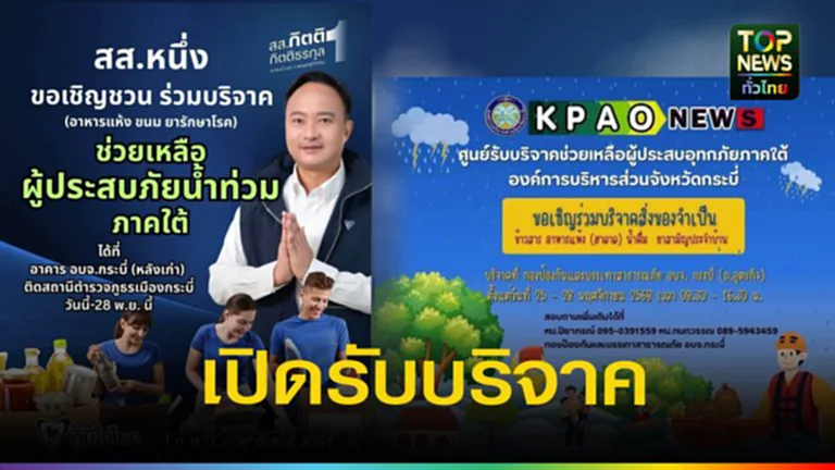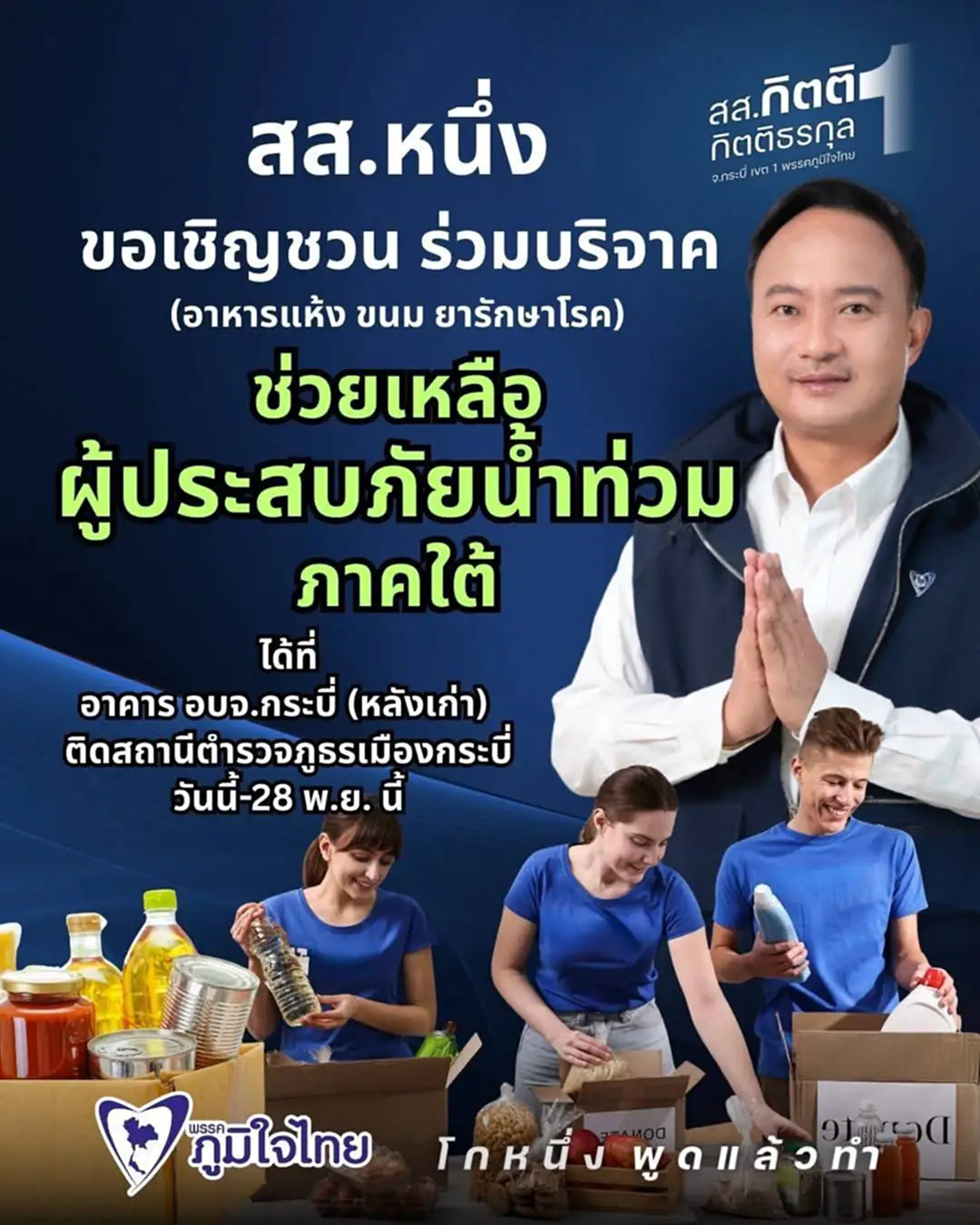 เปิดรับบริจาคช่วยผู้ประสบอุทกภัยภาคใต้ สส.กิตติ–อบจ.กระบี่ เชิญชวนประชาชนร่วมส่งต่อกำลังใจ