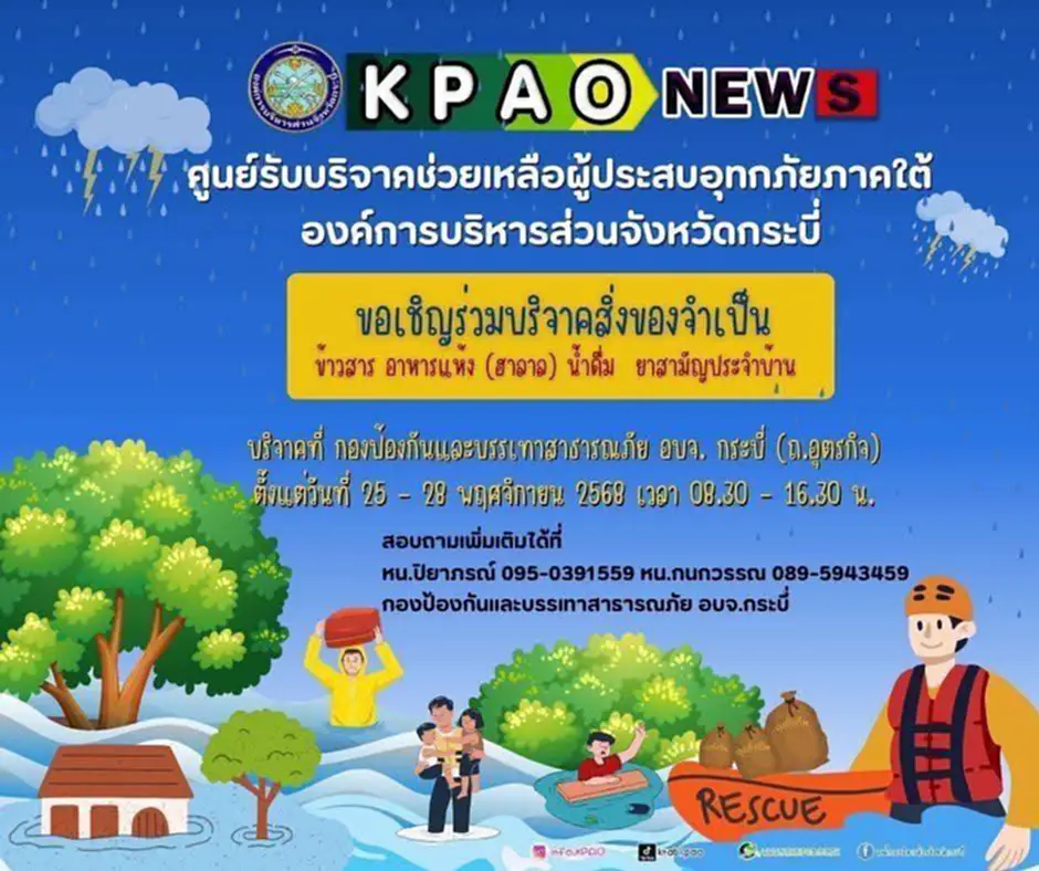 วันที่ 25 พ.ย. 2568 ท่ามกลางสถานการณ์อุทกภัยที่ยังคงรุนแรงในหลายจังหวัดภาคใต้ นายกิตติ กิตติธรกุล สมาชิกสภาผู้แทนราษฎรจังหวัดกระบี่ พร้อมด้วยองค์การบริหารส่วนจังหวัดกระบี่ ขอเชิญชวนพี่น้องประชาชนและผู้มีจิตศรัทธาร่วมบริจาคสิ่งของจำเป็นเพื่อช่วยเหลือผู้ประสบภัย