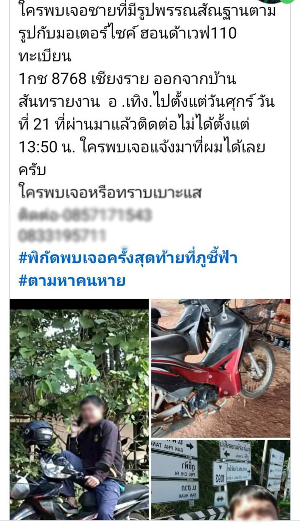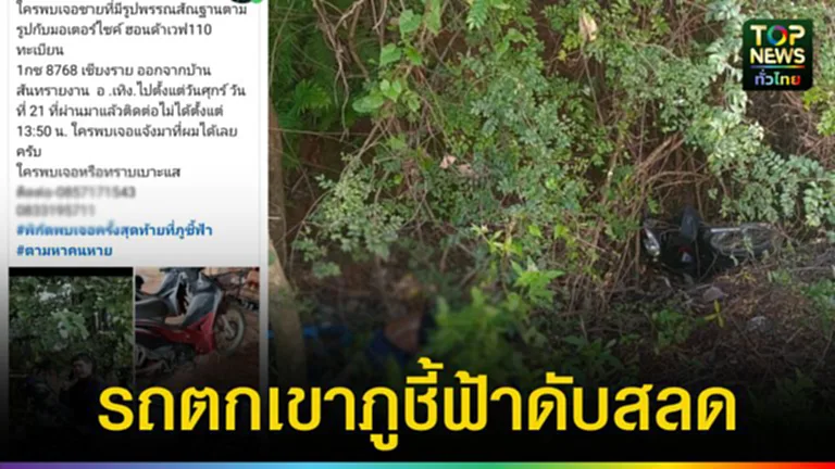 วันที่ 25 พ.ย. 68 เวลาประมาณ 11.30 น. เจ้าหน้าที่ทหารพรานจาก ร้อย ทพ.3104 ฉก.ทพ.31 กองกำลังผาเมือง ได้รับแจ้งจากผู้นำชุมชนและชาวบ้านว่าได้พบร่องรอยมีอุบัติเหตุบนถนนทางขึ้นภูชี้ฟ้า ต.ตับเต่า อ.เทิง จ.เชียงราย จึงจัดชุดปฏิบัติการไปร่วมกับหน่วยงานที่เกี่ยวข้องและชาวบ้านเข้าตรวจสอบพบเป็นถนนบนภูเขาที่คดเคี้ยว ในเขตพื้นที่บ้านประชาภักดี หมู่ 25 ต.ตับเต่า อ.เทิง ห่างจากภูชี้ฟ้าประมาณ 6 กิโลเมตร และพบมีรอยรถจักรยานยนต์ไถลพงหญ้าข้างทางเป็นรอยตกลงไปในป่าเชิงเขาลึกประมาณ 5-6 เมตร เจ้าหน้าที่จงลงไปตรวจในพงหญ้าพบรถจักรยานยนต์ที่ตกลงไปเป็นยี่ห้อฮอนด้า เวฟ ทะเบียน เชียงราย สภาพเสียหายและใกล้พบร่างชายที่เป็นคนขับนอนเสียชีวิตห่างจากรถจักรยานยนต์เพียงเล็กน้อย