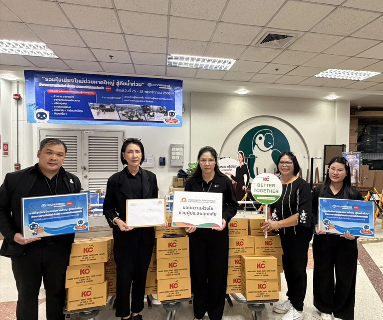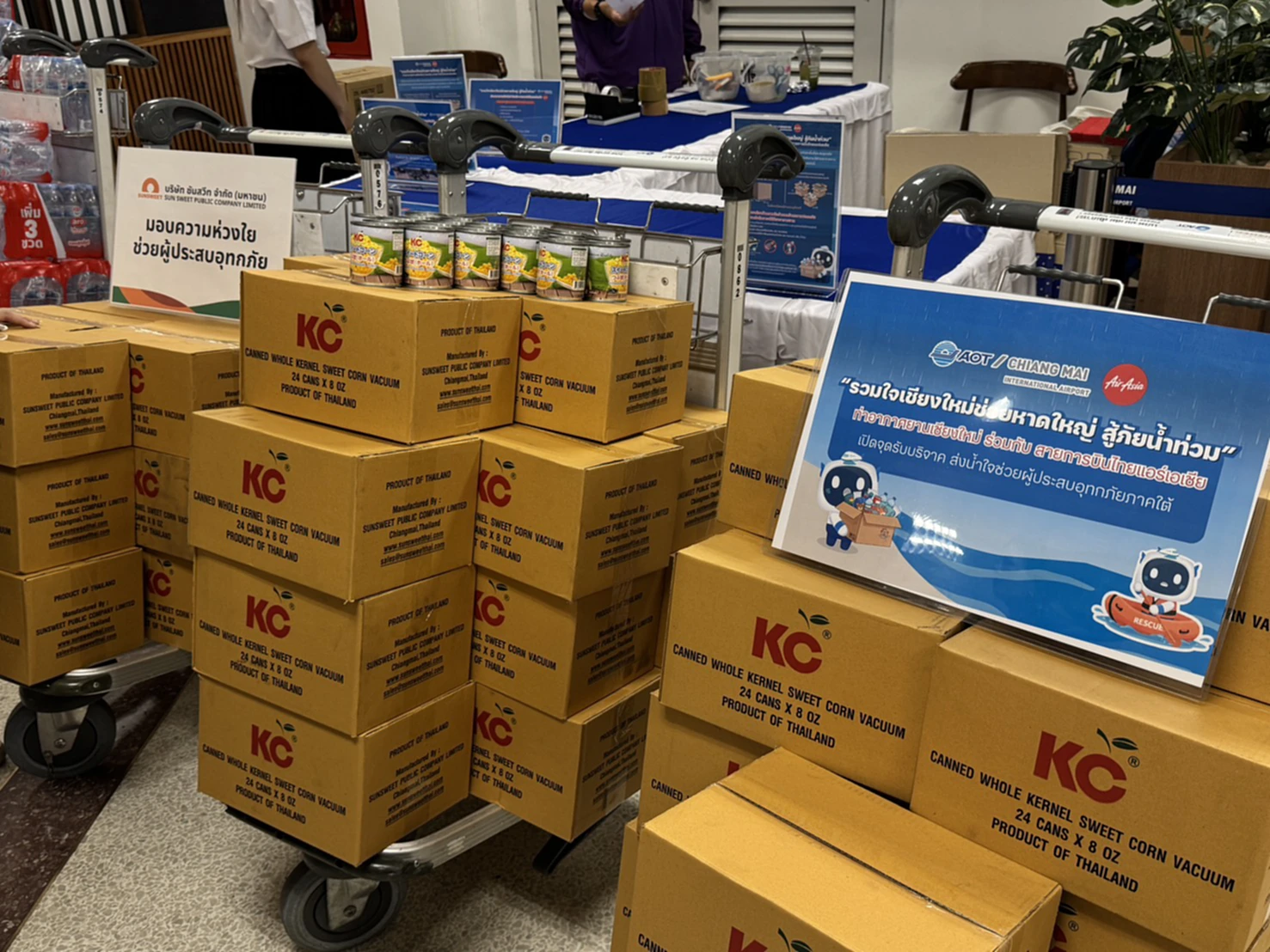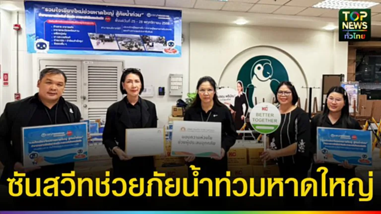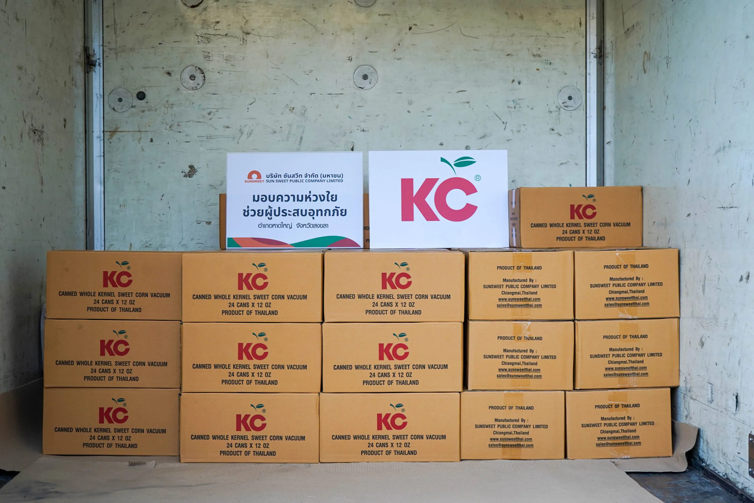 SUN ได้สนับสนุนผลิตภัณฑ์อาหารพร้อมรับประทาน ข้าวโพดหวานบรรจุกระป๋อง ตรา KC เพื่อช่วยเหลือประชาชนในพื้นที่ประสบภัยให้ได้รับอาหารที่ปลอดภัยและเพียงพอในระยะเร่งด่วน การส่งมอบจัดขึ้นผ่านความร่วมมือจากหลายหน่วยงาน ได้แก่ สมาคมผู้ผลิตอาหารสำเร็จรูป กรมประมง ท่าอากาศยานเชียงใหม่ และ สายการบินไทยแอร์เอเชีย เพื่อสนับสนุนด้านการลำเลียงสิ่งของไปยังพื้นที่ เพื่อบรรเทาความเดือดร้อน และมอบพลังใจให้แก่ผู้ที่ได้รับผลกระทบให้ก้าวผ่านสถานการณ์ครั้งนี้ไปด้วยความเข้มแข็ง