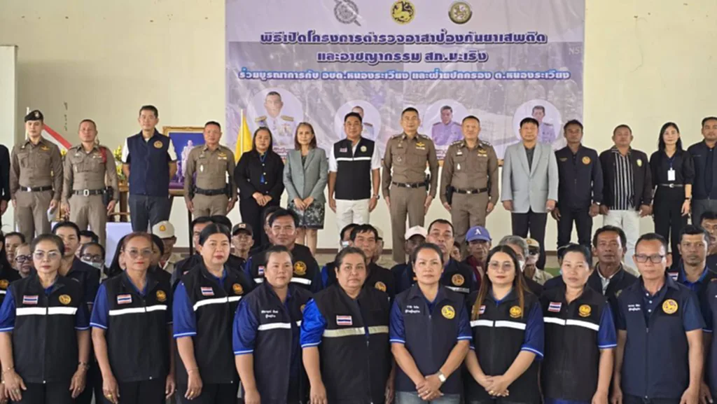 วันที่ 26 พฤศจิกายน 2568 ที่อาคารอเนกประสงค์ อบต.หนองระเวียง ตำบลหนองระเวียง อำเภอเมือง จังหวัดนครราชสีมา พล.ต.ต.ณรงค์ศักดิ์ พรหมทา ผู้บังคับการตำรวจภูธรจังหวัดนครราชสีมา เป็นประธานเปิด โครงการตำรวจอาสาป้องกันยาเสพติดและอาชญากรรม ในพื้นที่ สภ.มะเริง โดยมี นายวิษณุ อยู่อุ่นพะเนา นายก อบต.หนองระเวียง, นายอนุชา ศิริโภคานนท์ กำนันตำบลหนองระเวียง, พ.ต.อ.ธนิต ดวงกลาง ผกก.สภ.มะเริง, พ.ต.ท.สุทธิรักษ์ ลัคนาลิขิต รอง ผกก.ป., พ.ต.ต.บรรลือศักดิ์ โพธิ์นวลศรี สวป.สภ.มะเริง และผู้ใหญ่บ้านในพื้นที่ร่วมให้การต้อนรับอย่างพร้อมเพรียง