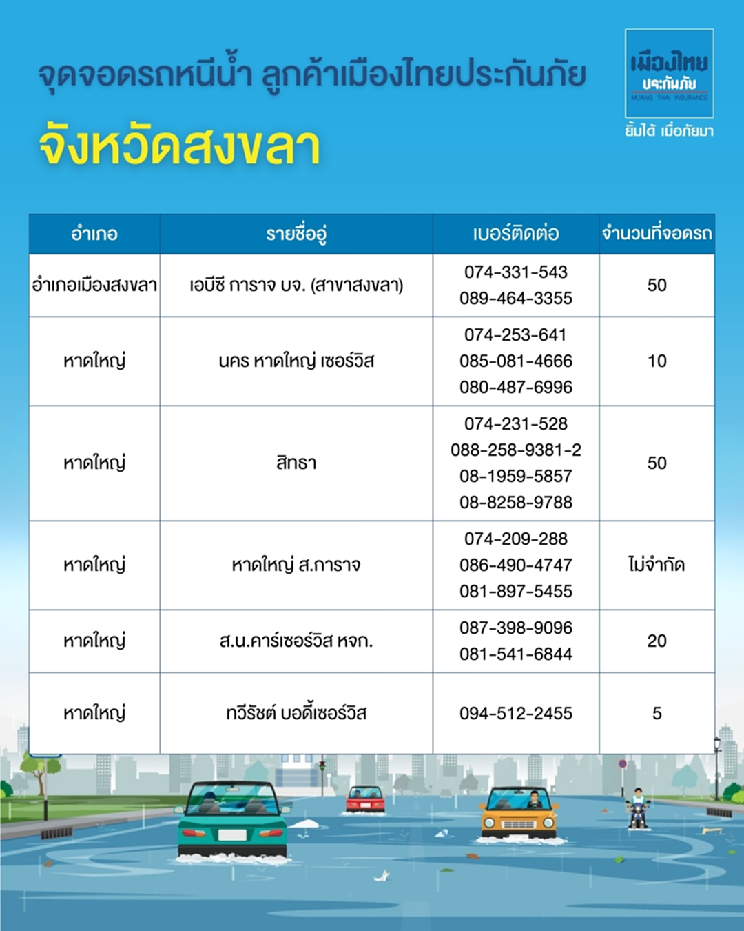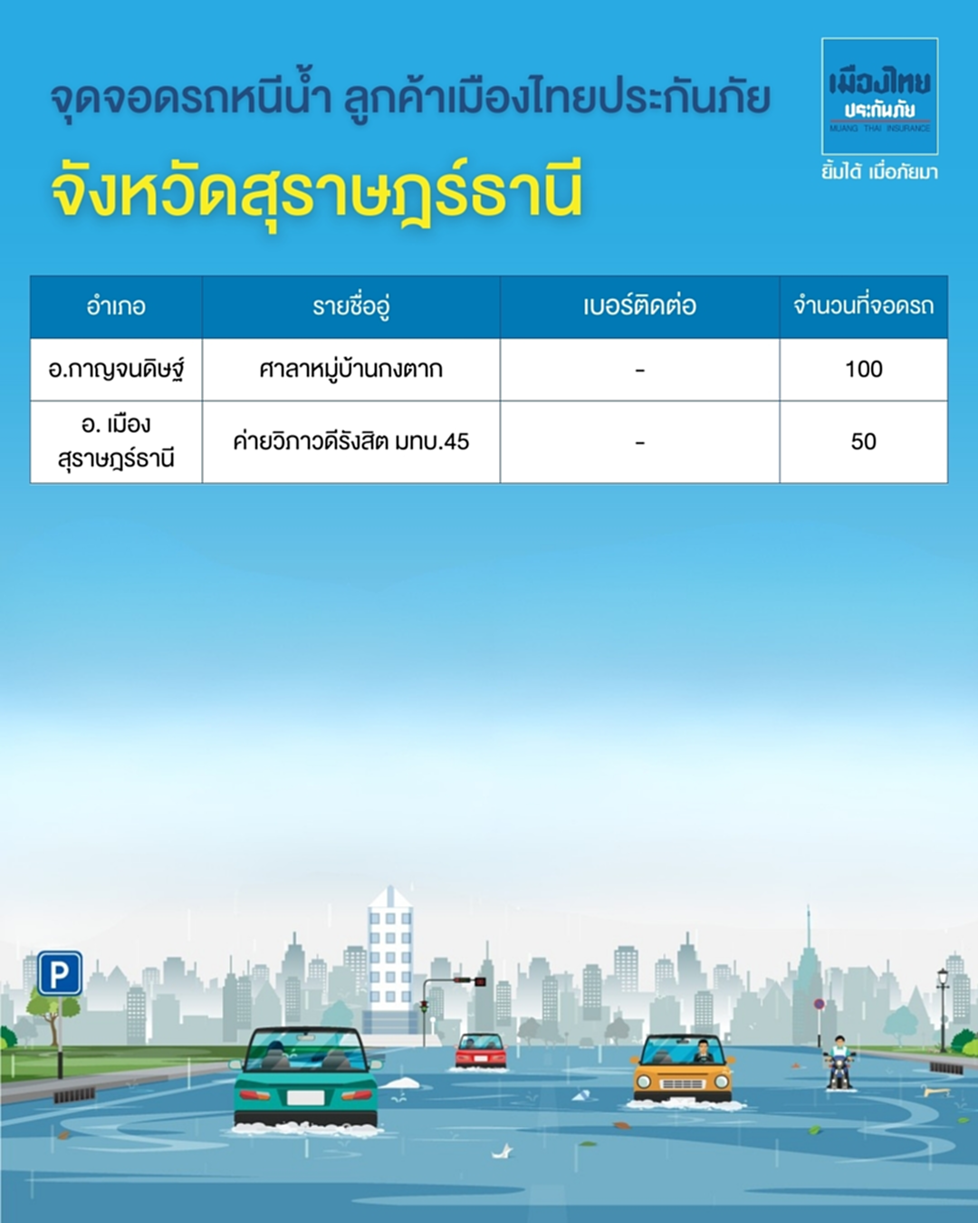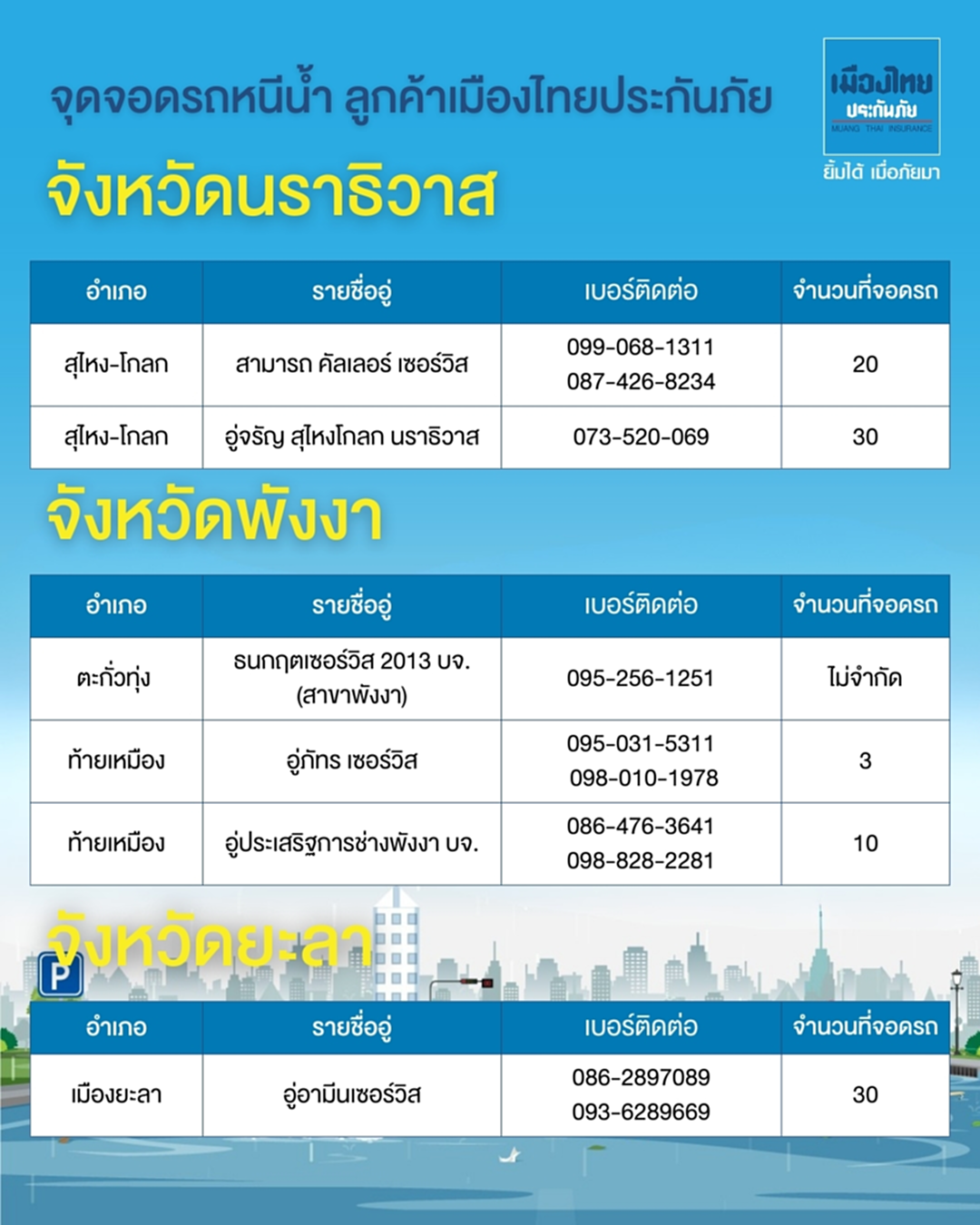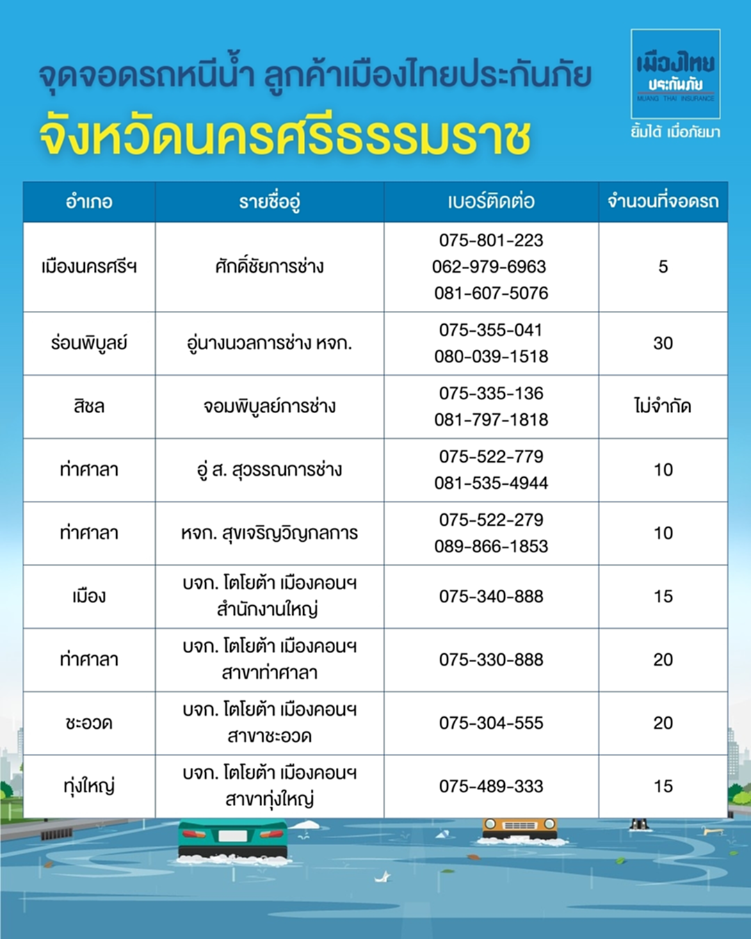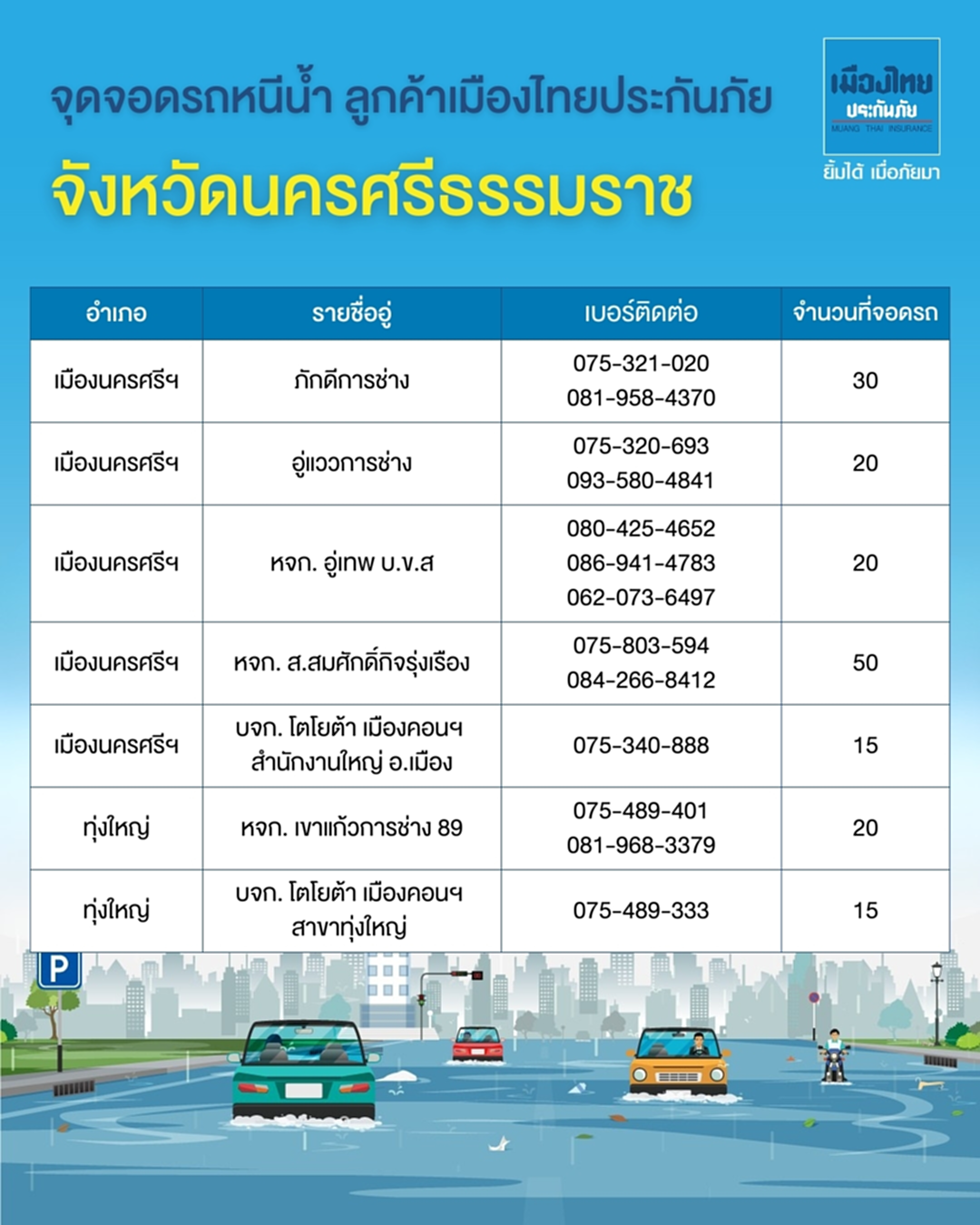 บริษัทฯ จึงเปิดให้บริการจุดจอดรถหนีน้ำท่วมทั่วทั้งภาคใต้ โดยขยายในพื้นที่ที่มีความเสี่ยง จำนวน 130 จุด ครอบคลุมพื้นที่มีผลกระทบรุนแรง (Severe Flood Zone) จำนวน 2 จังหวัด ได้แก่ นครศรีธรรมราช สุราษฎร์ธานี , พื้นที่ได้รับผลกระทบปานกลาง (Moderate Zone) จำนวน 6 จังหวัด ได้แก่ ตรัง ปัตตานี พัทลุง นราธิวาส ภูเก็ต พังงา , พื้นที่ได้รับผลกระทบน้อย (Mild Zone) จำนวน 4 จังหวัด ได้แก่ ชุมพร สตูล ยะลา กระบี่ โดยลูกค้าเมืองไทยประกันภัย เข้ารับบริการได้ฟรี จนกว่าสถานการณ์จะอุทกภัยที่คลี่คลาย เพื่อช่วยลดความเสี่ยงต่อความเสียหายที่อาจเกิดขึ้น โดยสามารถตรวจสอบจุดจอดได้ที่ https://webmti.co/44lzlVi