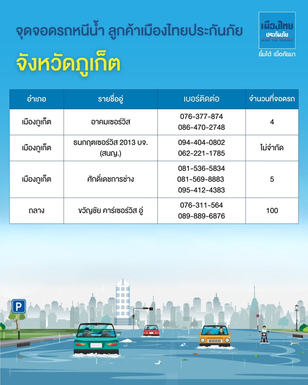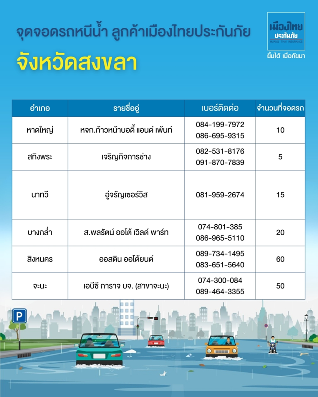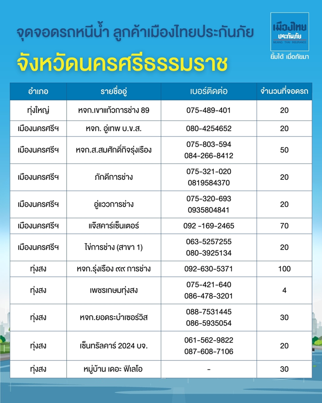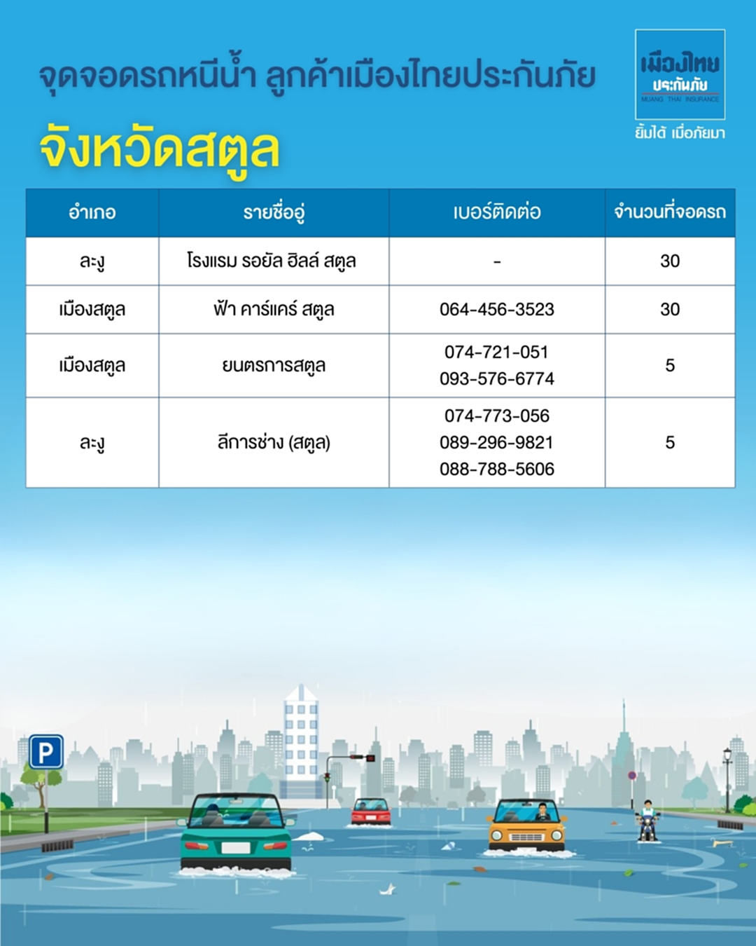 บริษัทฯ จึงเปิดให้บริการจุดจอดรถหนีน้ำท่วมทั่วทั้งภาคใต้ โดยขยายในพื้นที่ที่มีความเสี่ยง จำนวน 130 จุด ครอบคลุมพื้นที่มีผลกระทบรุนแรง (Severe Flood Zone) จำนวน 2 จังหวัด ได้แก่ นครศรีธรรมราช สุราษฎร์ธานี , พื้นที่ได้รับผลกระทบปานกลาง (Moderate Zone) จำนวน 6 จังหวัด ได้แก่ ตรัง ปัตตานี พัทลุง นราธิวาส ภูเก็ต พังงา , พื้นที่ได้รับผลกระทบน้อย (Mild Zone) จำนวน 4 จังหวัด ได้แก่ ชุมพร สตูล ยะลา กระบี่ โดยลูกค้าเมืองไทยประกันภัย เข้ารับบริการได้ฟรี จนกว่าสถานการณ์จะอุทกภัยที่คลี่คลาย เพื่อช่วยลดความเสี่ยงต่อความเสียหายที่อาจเกิดขึ้น โดยสามารถตรวจสอบจุดจอดได้ที่ https://webmti.co/44lzlVi