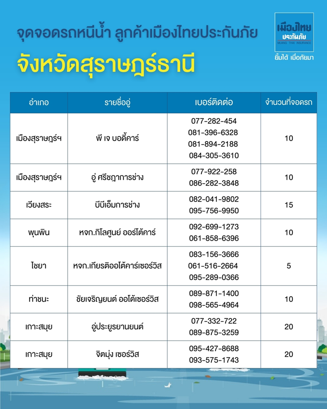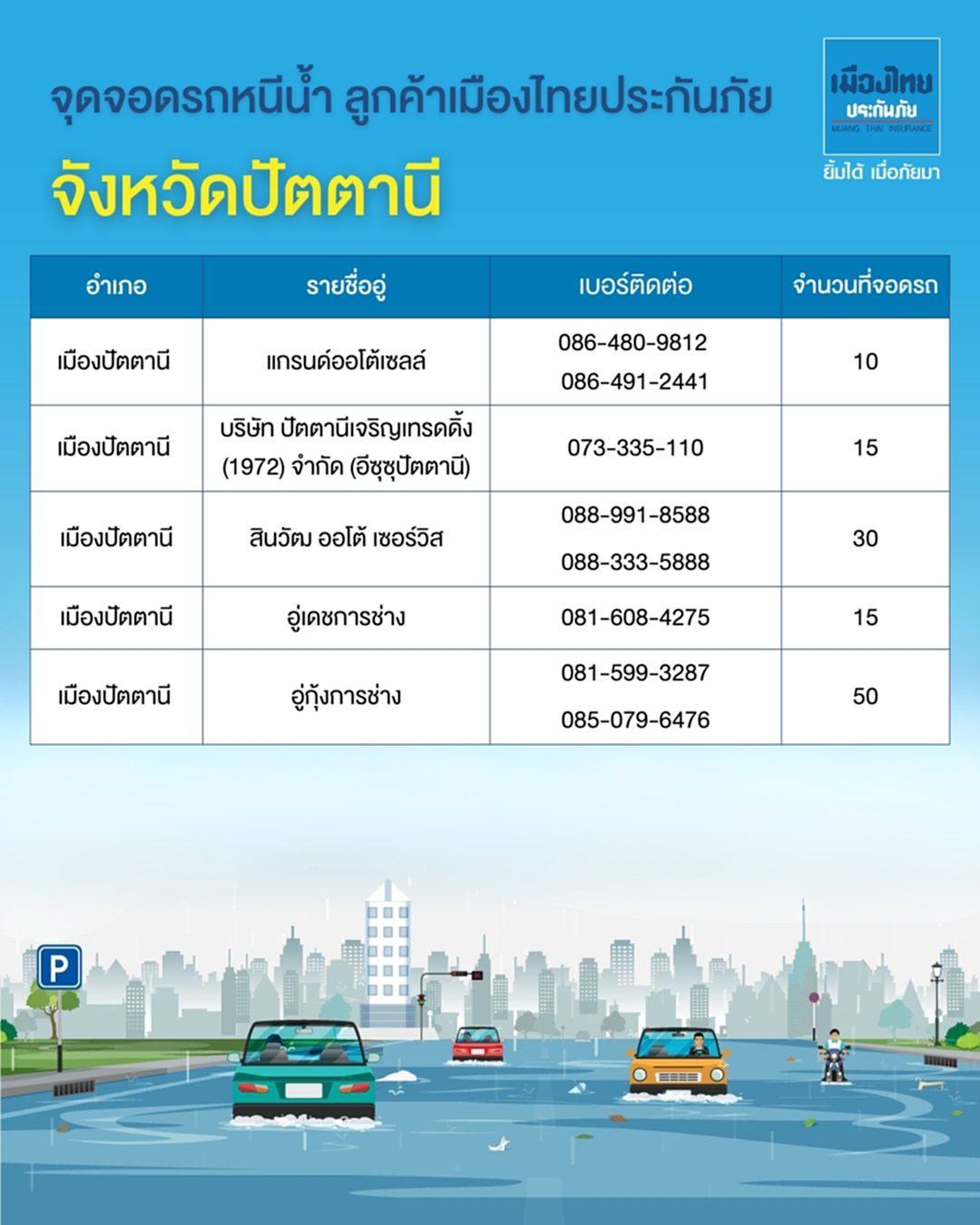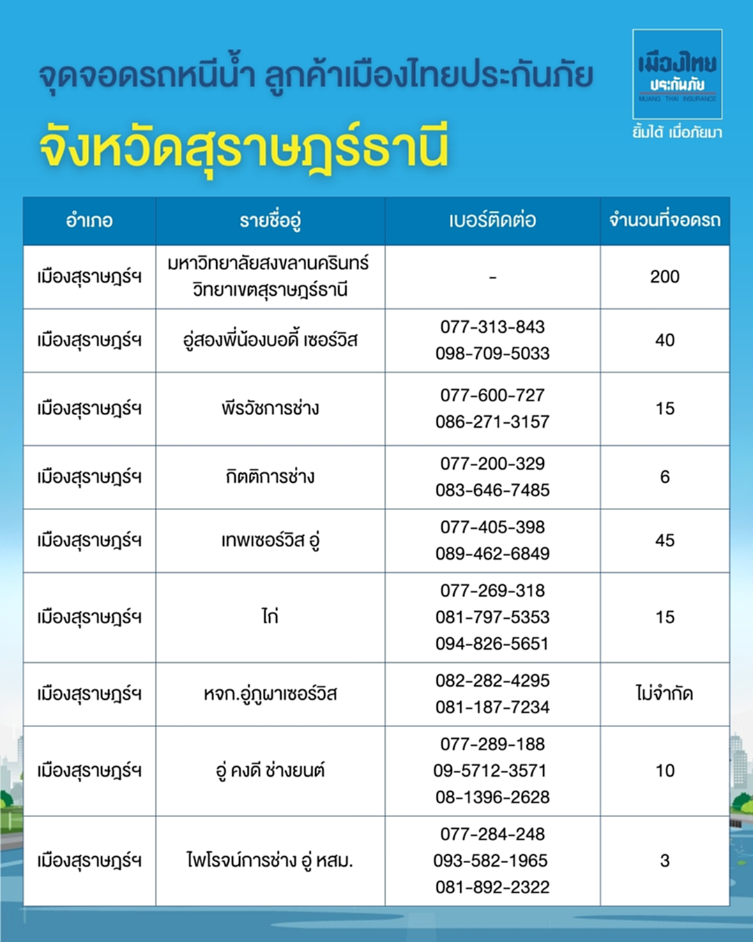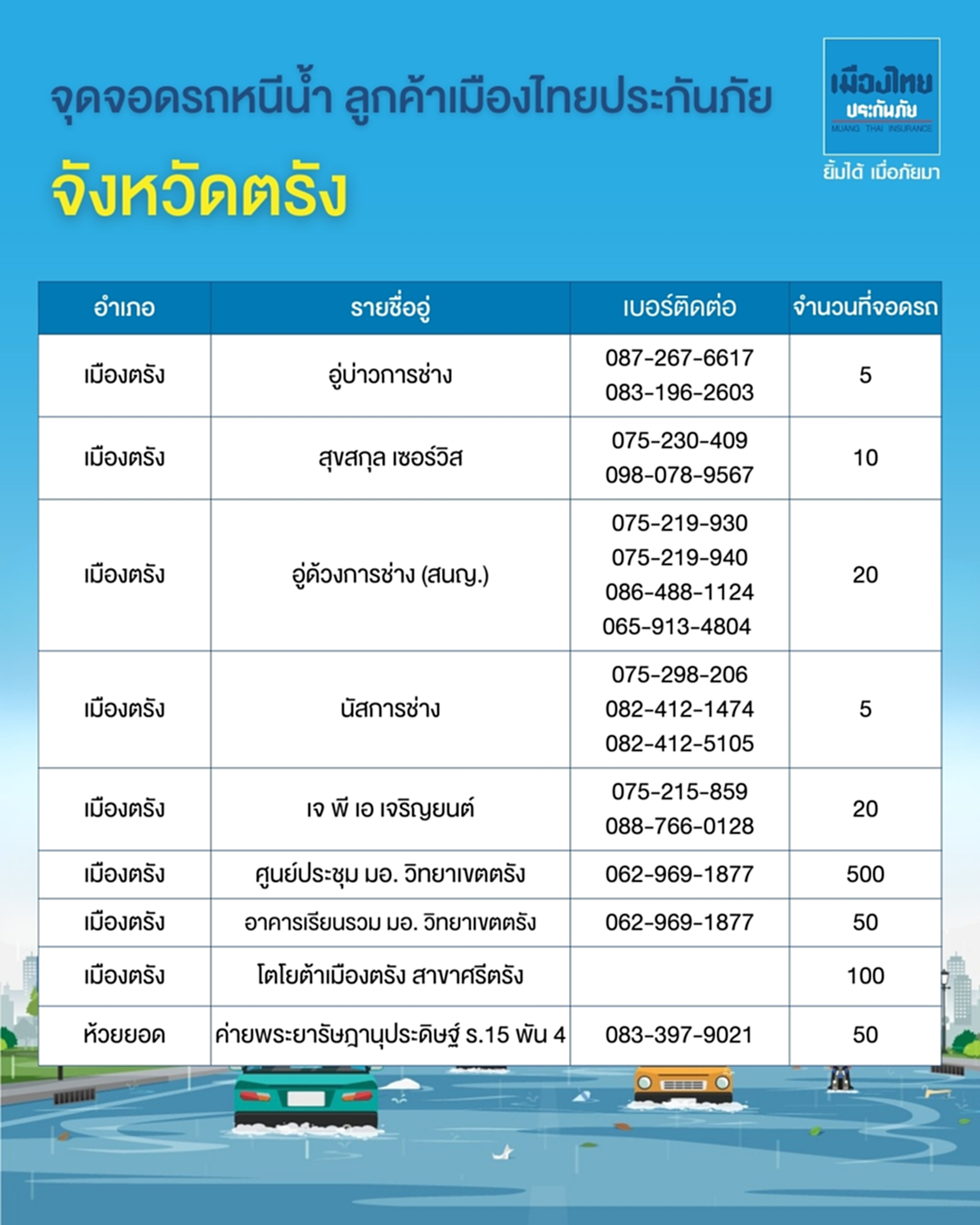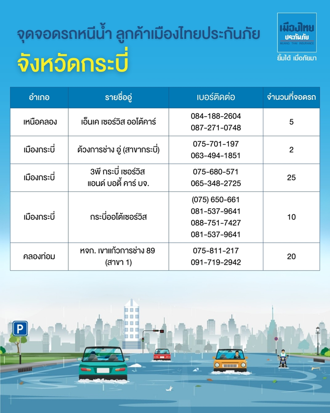 บริษัทฯ จึงเปิดให้บริการจุดจอดรถหนีน้ำท่วมทั่วทั้งภาคใต้ โดยขยายในพื้นที่ที่มีความเสี่ยง จำนวน 130 จุด ครอบคลุมพื้นที่มีผลกระทบรุนแรง (Severe Flood Zone) จำนวน 2 จังหวัด ได้แก่ นครศรีธรรมราช สุราษฎร์ธานี , พื้นที่ได้รับผลกระทบปานกลาง (Moderate Zone) จำนวน 6 จังหวัด ได้แก่ ตรัง ปัตตานี พัทลุง นราธิวาส ภูเก็ต พังงา , พื้นที่ได้รับผลกระทบน้อย (Mild Zone) จำนวน 4 จังหวัด ได้แก่ ชุมพร สตูล ยะลา กระบี่ โดยลูกค้าเมืองไทยประกันภัย เข้ารับบริการได้ฟรี จนกว่าสถานการณ์จะอุทกภัยที่คลี่คลาย เพื่อช่วยลดความเสี่ยงต่อความเสียหายที่อาจเกิดขึ้น โดยสามารถตรวจสอบจุดจอดได้ที่ https://webmti.co/44lzlVi