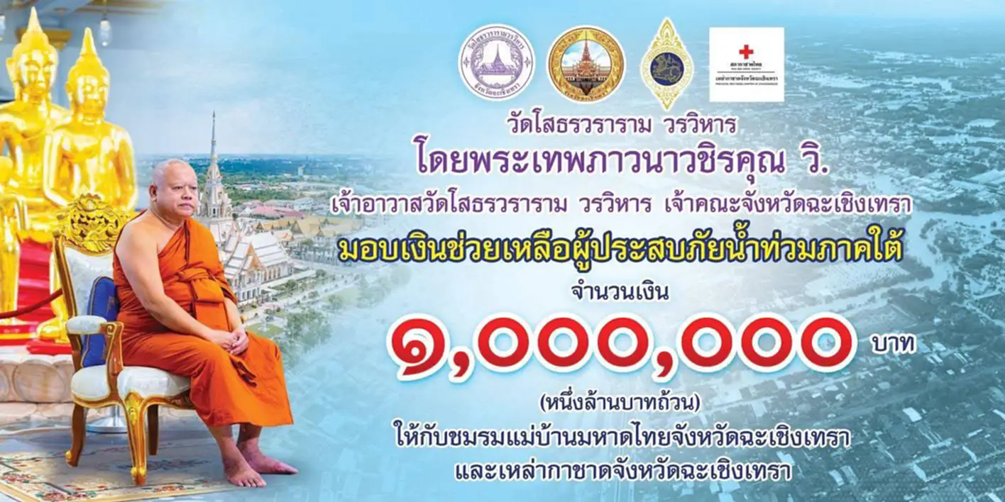 วัดโสธรวราราม วรวิหาร มอบเงินช่วยเหลือผู้ประสบอุทกภัยภาคใต้ 1,000,000 บาท ผ่านชมรมแม่บ้านมหาดไทยจังหวัดฉะเชิงเทรา