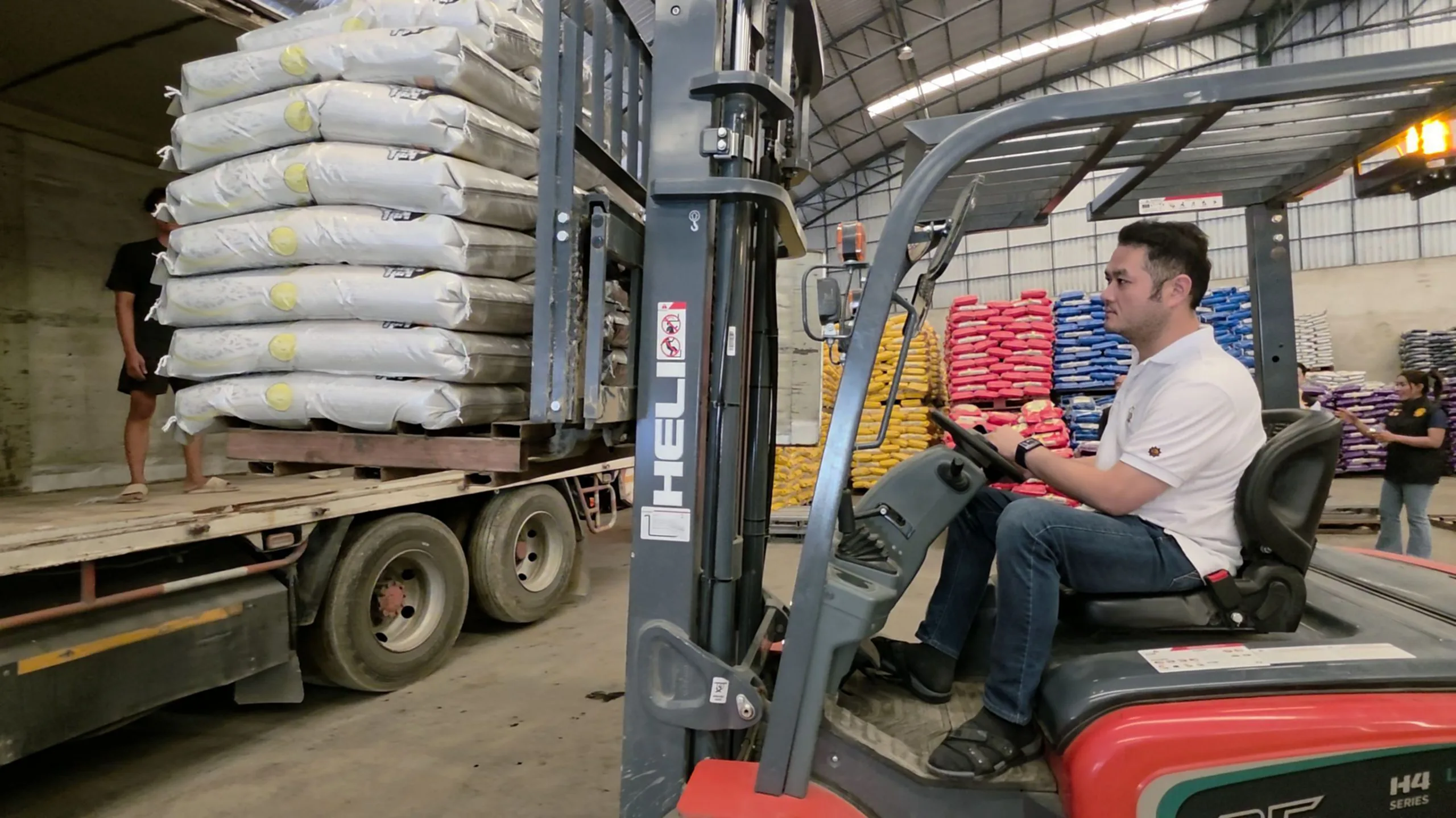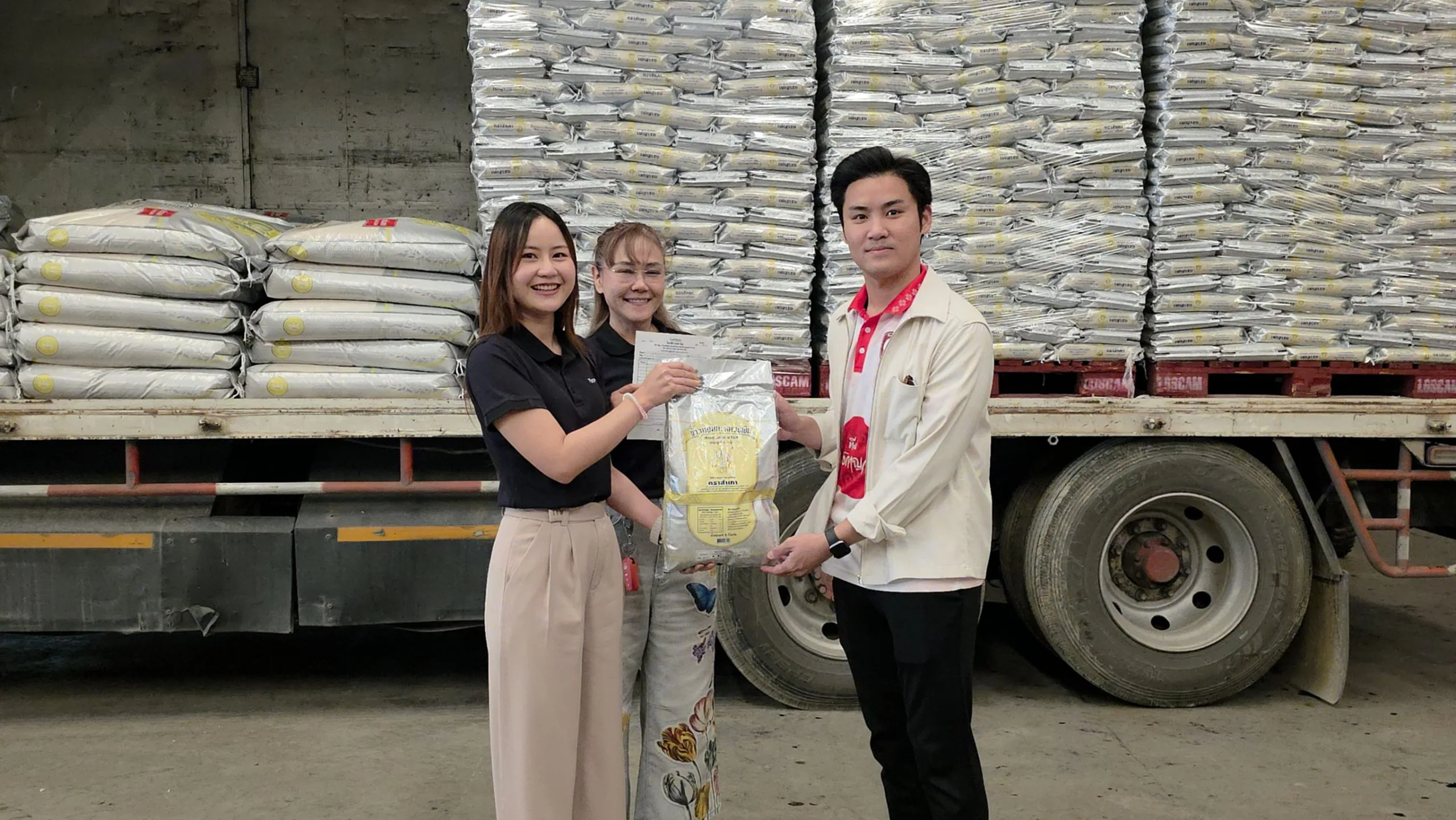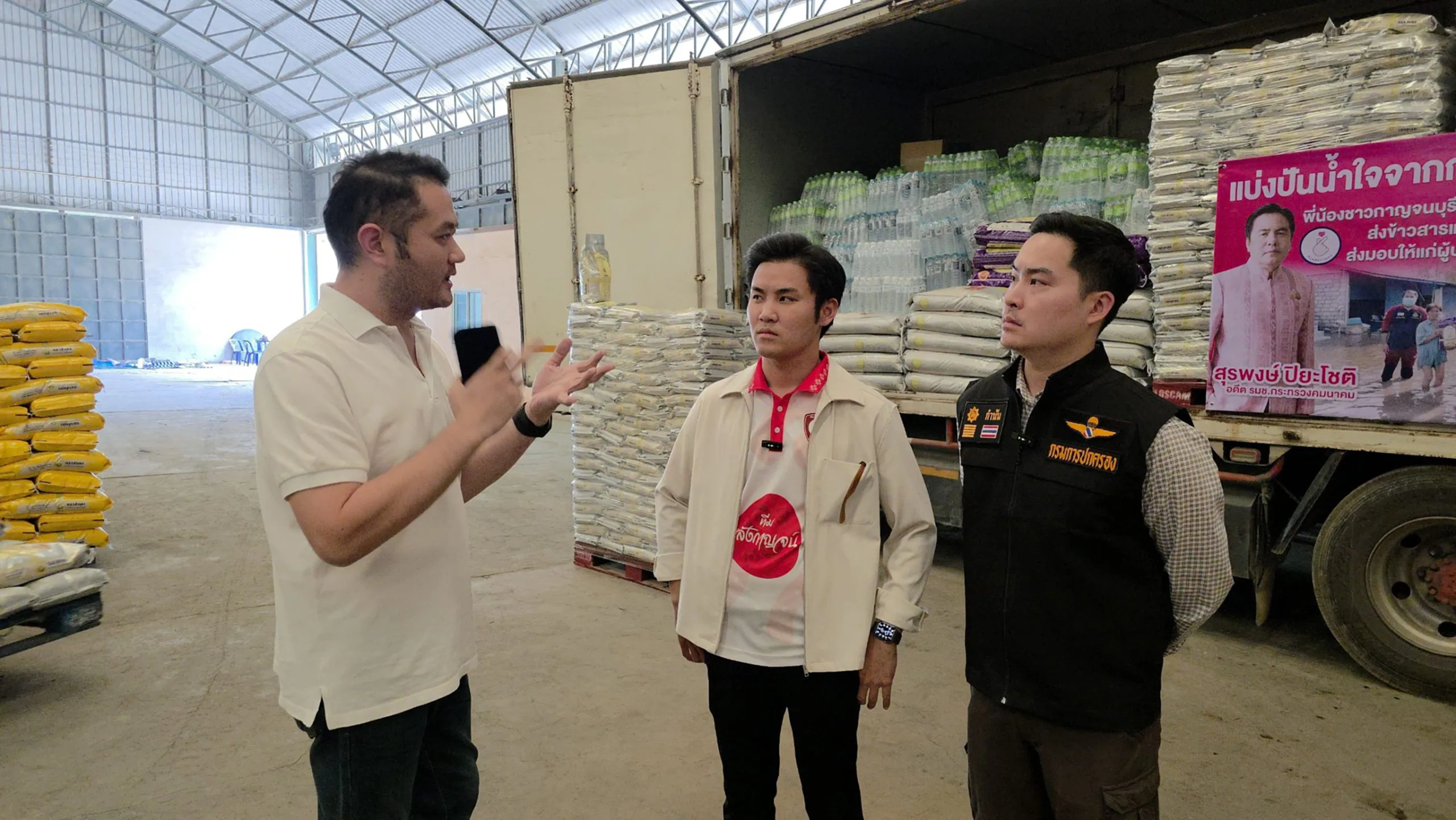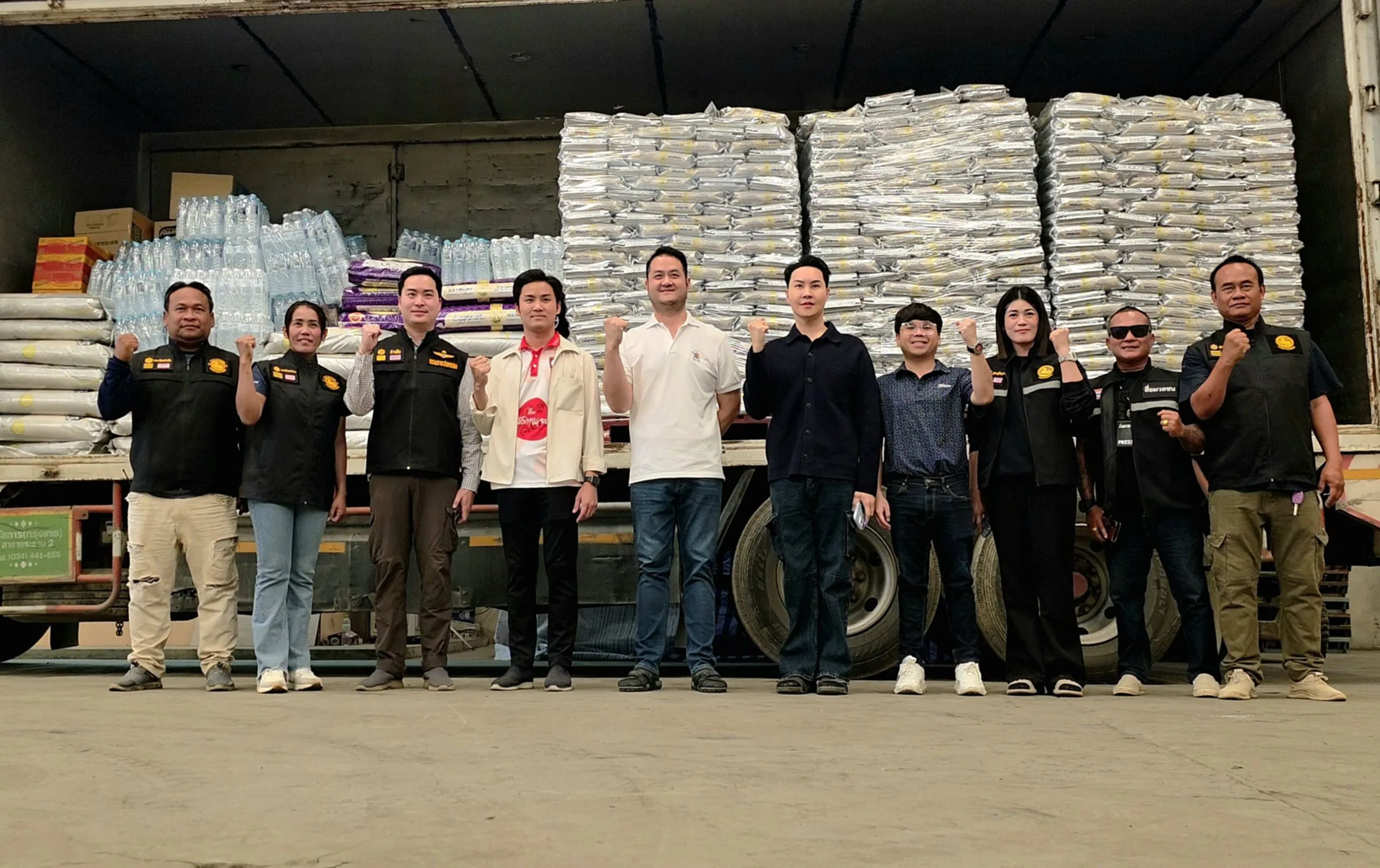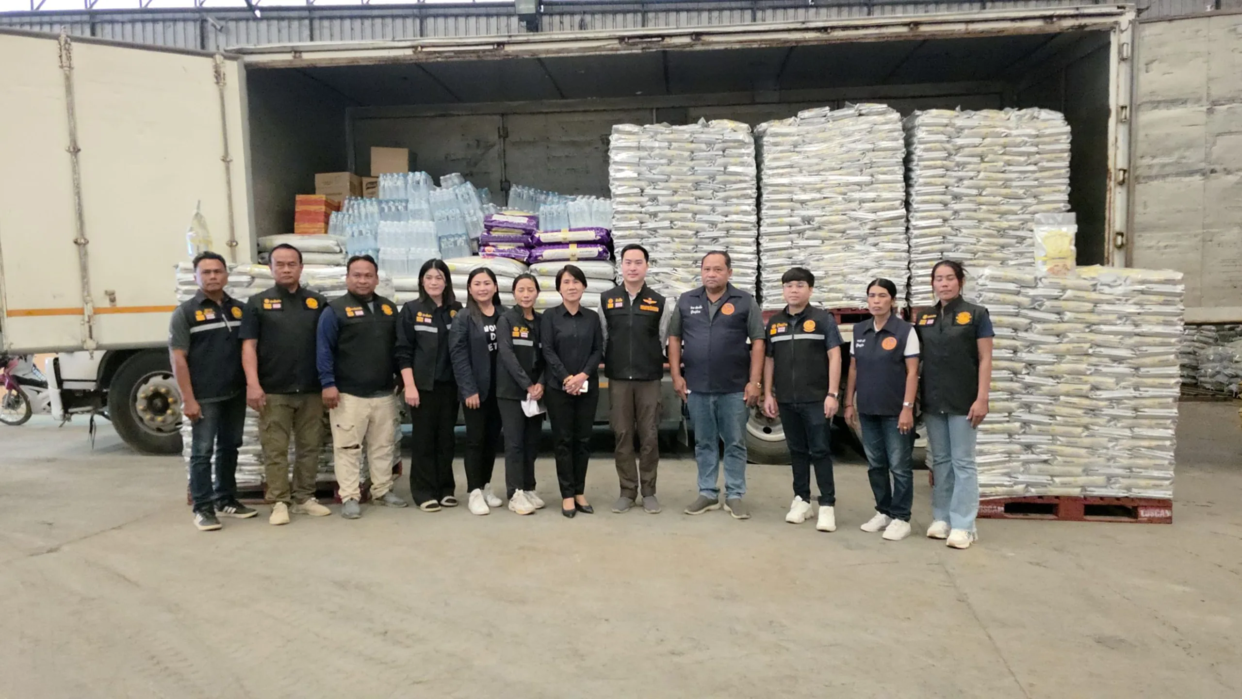 ครับหรือว่าหนึ่งถุงเล็กเนี่ยอย่างที่เราเห็นด้านหลังนะครับ ถุงเล็กเนี่ยหนึ่งพันถุงครับ นำลงไปให้พ่อแม่พี่น้องที่เขากำลังเดือดร้อนอยู่นะครับ แล้วก็ส่วนนึงนะครับก็ยังมีถุงใหญ่ครับ หนึ่งกระสอบสี่สิบโลที่เห็นด้านหลัง ตรงนี้เนี่ยจะไปแจกตามโรงครัวที่เขาเปิดทำข้าวกล่องครับ