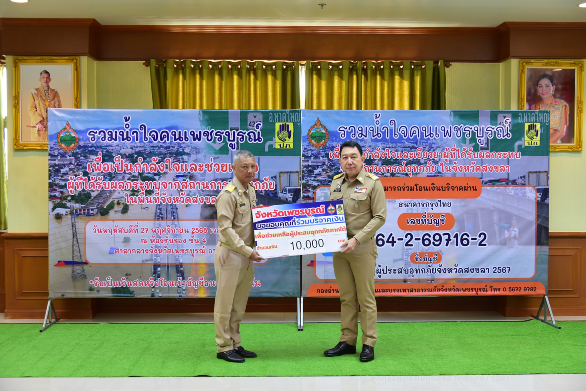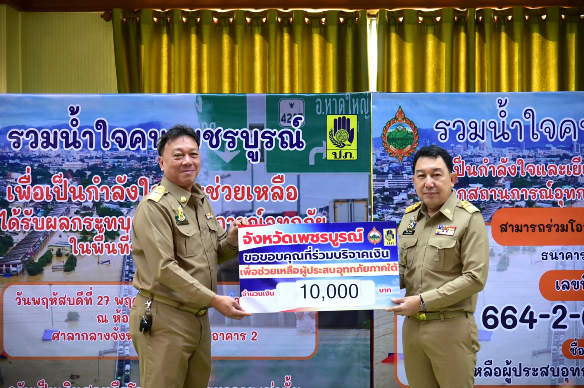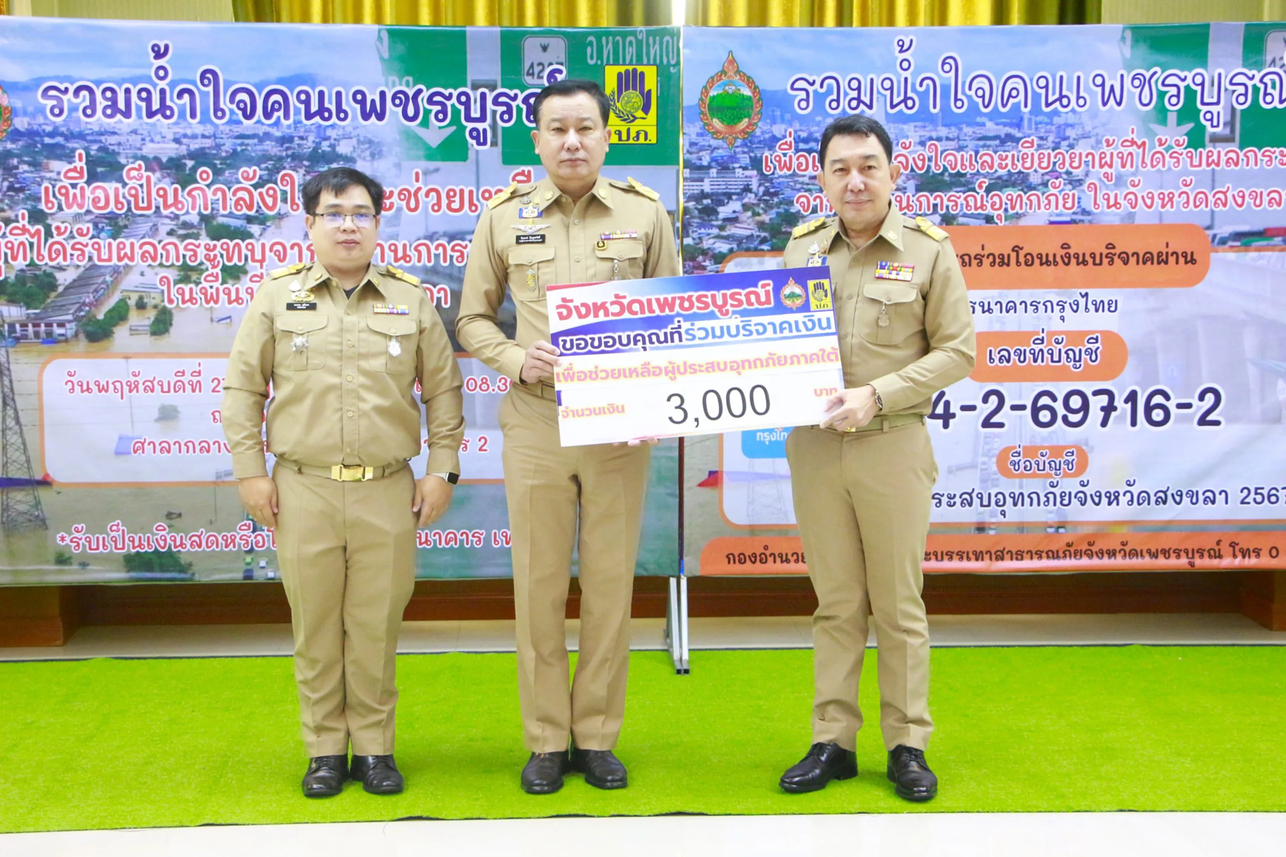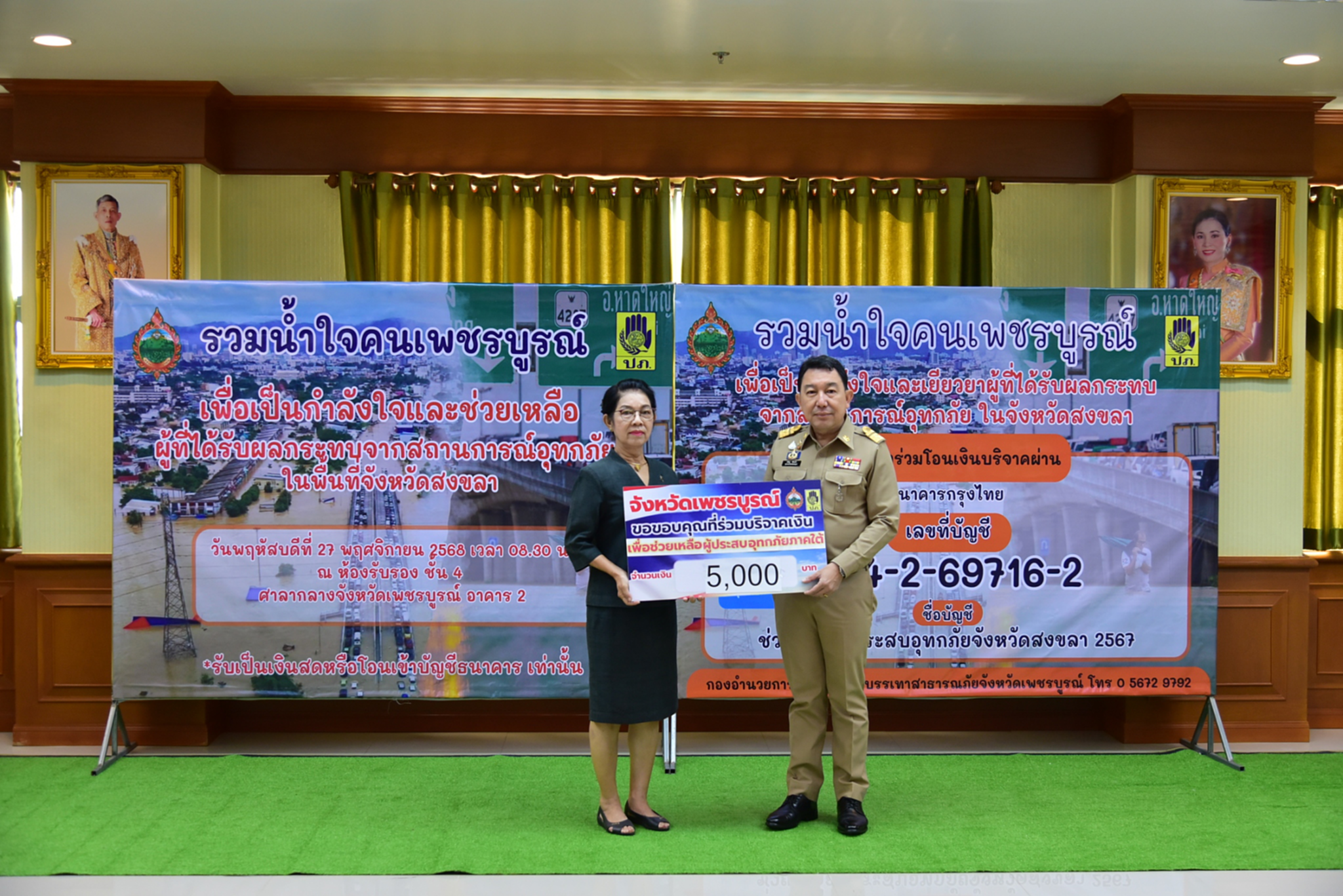 โดยภายในงาน ผู้ว่าราชการจังหวัดเพชรบูรณ์ รองผู้ว่าราชการจังหวัด และหัวหน้าส่วนราชการ ข้าราชการ ภาคธุรกิจ องค์กรปกครองส่วนท้องถิ่น และประชาชน ได้ร่วมกันบริจาคเงินช่วยเหลือผู้ประสบอุทกภัย โดยมียอดบริจาคในเช้านี้ ทั้งสิ้น 324,699 บาท ซึ่งจะถูกส่งต่อไปช่วยเหลือผู้ประสบภัยในจังหวัดสงขลาโดยตรง