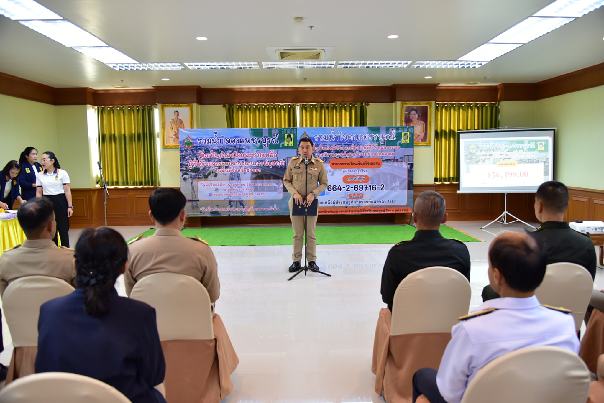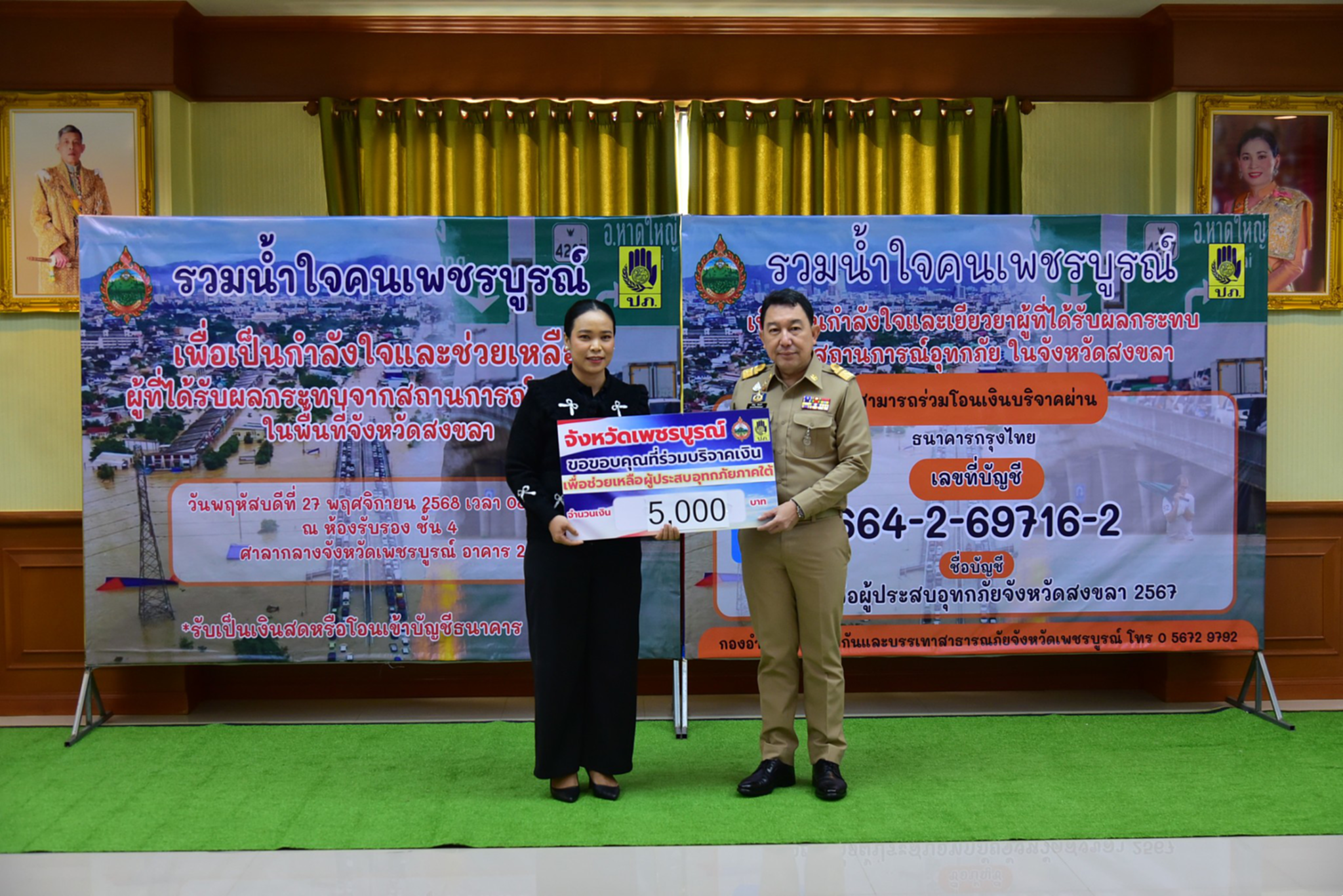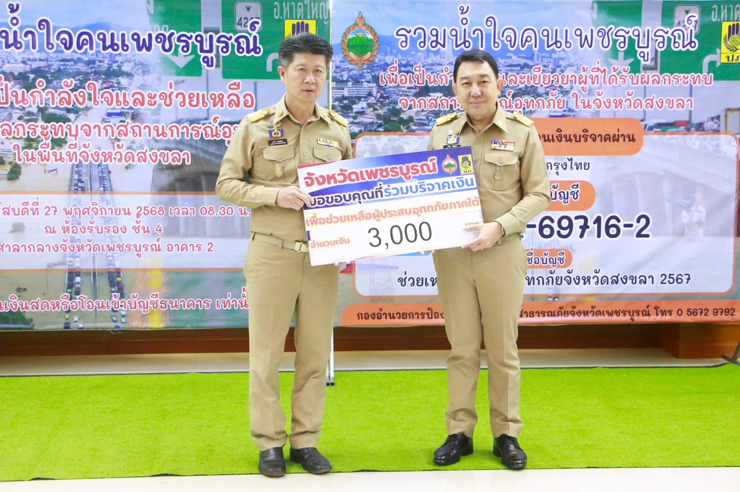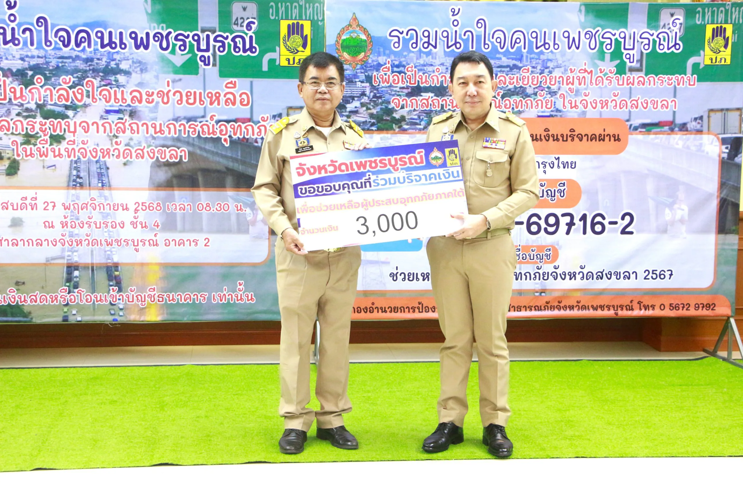 โดยภายในงาน ผู้ว่าราชการจังหวัดเพชรบูรณ์ รองผู้ว่าราชการจังหวัด และหัวหน้าส่วนราชการ ข้าราชการ ภาคธุรกิจ องค์กรปกครองส่วนท้องถิ่น และประชาชน ได้ร่วมกันบริจาคเงินช่วยเหลือผู้ประสบอุทกภัย โดยมียอดบริจาคในเช้านี้ ทั้งสิ้น 324,699 บาท ซึ่งจะถูกส่งต่อไปช่วยเหลือผู้ประสบภัยในจังหวัดสงขลาโดยตรง