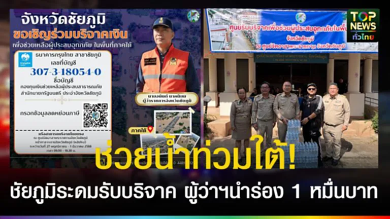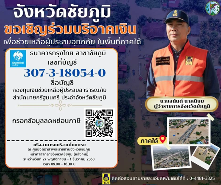 วันที่ 27 พ.ย. 68 จังหวัดชัยภูมิได้ตั้งศูนย์รับบริจาคเงินและสิ่งของจำเป็นเพื่อช่วยเหลือผู้ประสบอุทกภัยภาคใต้ โดยเฉพาะพื้นที่ประสบภัยหนักในอำเภอหาดใหญ่ ภายในอาคารศูนย์จิตอาสาพระราชทาน หน้าศาลากลางจังหวัดชัยภูมิ นายอนันต์ นาคนิยม ผู้ว่าราชการจังหวัดชัยภูมิ ซึ่งได้ประกาศเชิญชวนประชาชนร่วมบริจาคเครื่องอุปโภคบริโภคและสิ่งของยังชีพต่าง ๆ เช่น ข้าวสาร อาหารแห้ง ยารักษาโรค นมผง ผ้าอ้อมเด็ก–ผู้ใหญ่ และของใช้จำเป็น พร้อมเปิดรับบริจาคเงินสมทบทุนที่จุดรับบริจาคภายในงาน