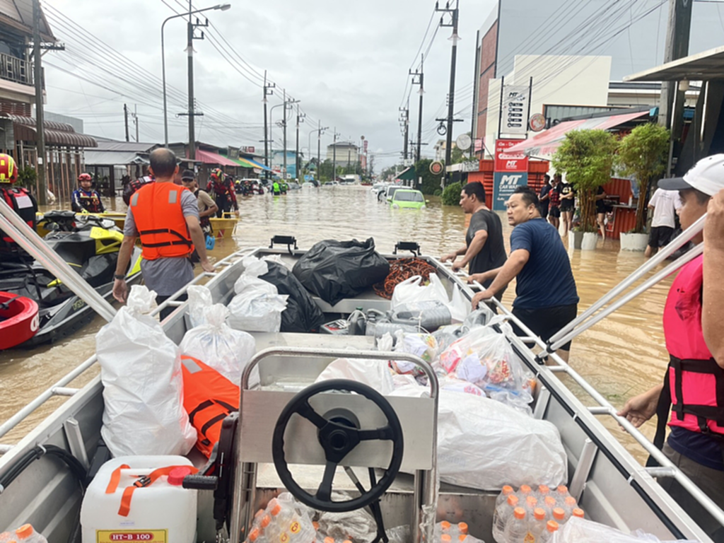 กองเรือและหน่วยเคลื่อนที่เร็วของซีพีเอฟ นำเรือท้องแบน 3 ลำ พร้อมทีมเจ็ตสกีภูเก็ต ของเครือซีพี ลงพื้นที่หาดใหญ่ ร่วมภารกิจกับทหาร ตำรวจ และทีมกู้ภัยทางน้ำ เร่งอพยพผู้คนที่ติดค้างในบ้าน พร้อมส่งมอบอาหารและน้ำดื่มให้ถึงมือประชาชนโดยเร็วที่สุด