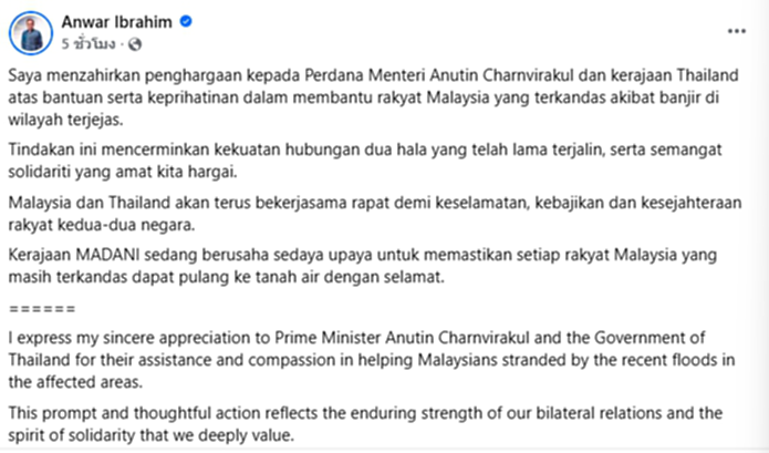 สำนักข่าวเบอร์นามารายงานว่านายกรัฐมนตรีอันวาร์ อิบราฮิม ผู้นำมาเลเซียได้โพสต์ผ่านเฟสบุ๊คในวันนี้ (พฤหัสที่ 27 พย.) โดยเขียนข้อความแสดงความขอบคุณอย่างจริงใจต่อนายอนุทิน ชาญวีรกูล นายกรัฐมนตรีไทย และรัฐบาลไทย สำหรับความช่วยเหลือและการอพยพอย่างรวดเร็ว รวมทั้งความเห็นอกเห็นใจต่อชาวมาเลเซียที่ติดค้างจากเหตุน้ำท่วมครั้งใหญ่ในพื้นที่ภาคใต้ของไทย