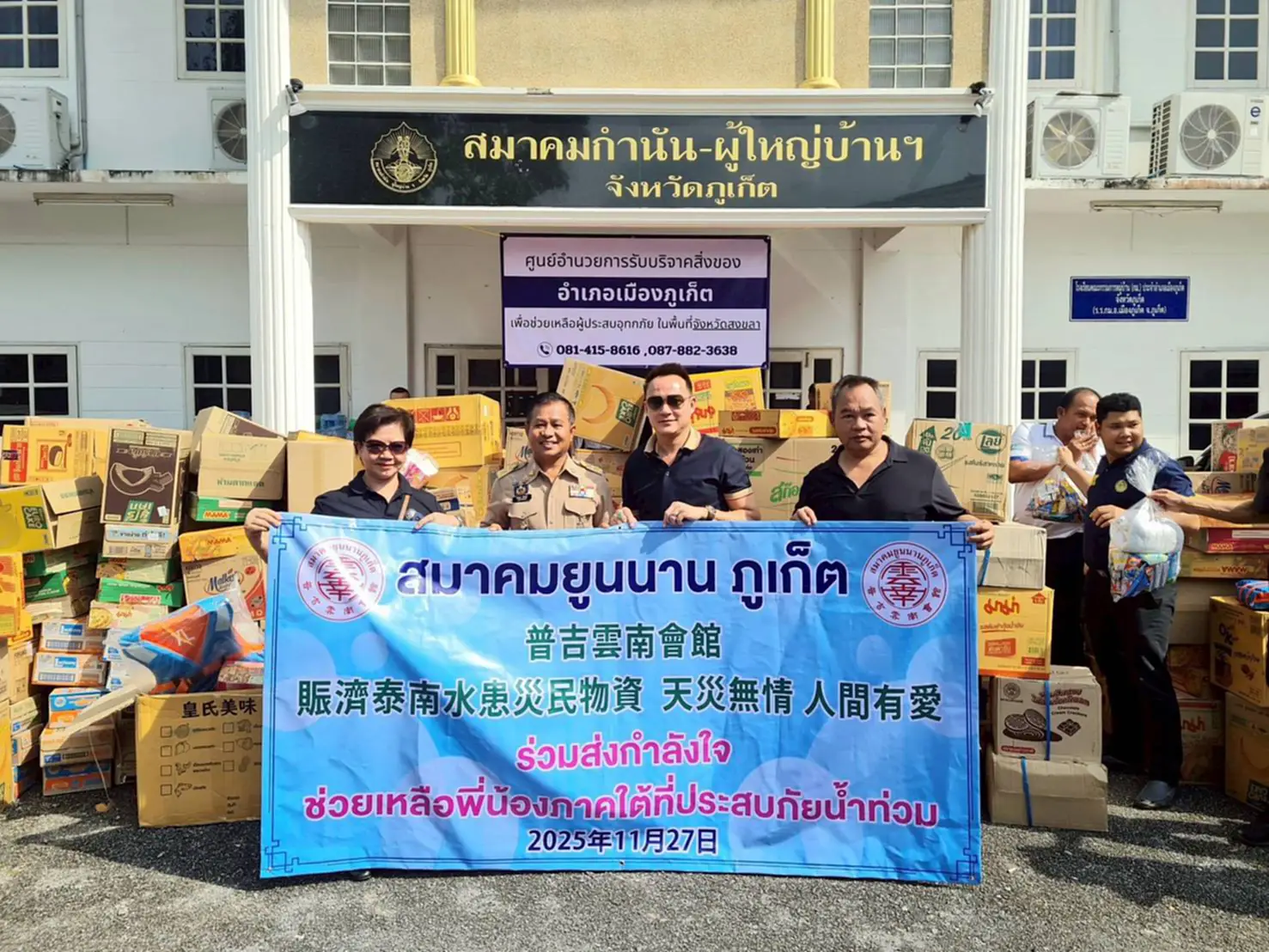 วันที่ 27 พ.ย. 2568 ณ ที่ว่าการอำเภอเมืองภูเก็ต สมาคมยูนนานจังหวัดภูเก็ต นำโดย นายสุรพงษ์ หยางเจริญสกุล นายกสมาคมยูนนานจังหวัดภูเก็ต และนายกสมาคมท่องเที่ยวไทยจีน–ภูเก็ต พร้อมด้วยคณะกรรมการและสมาชิกสมาคม ร่วมกันส่งมอบสิ่งของอุปโภคบริโภคเพื่อช่วยเหลือผู้ประสบภัยน้ำท่วมในพื้นที่ภาคใต้ การมอบสิ่งของช่วยเหลือในครั้งนี้ มี นายไพโรจน์ ศรีละมุล นายอำเภอเมืองภูเก็ตเป็นผู้แทนรับมอบ เพื่อนำไปกระจายสู่ประชาชนในพื้นที่ประสบภัยที่ได้รับผลกระทบจากสถานการณ์น้ำท่วมในหลายจังหวัดของภาคใต้