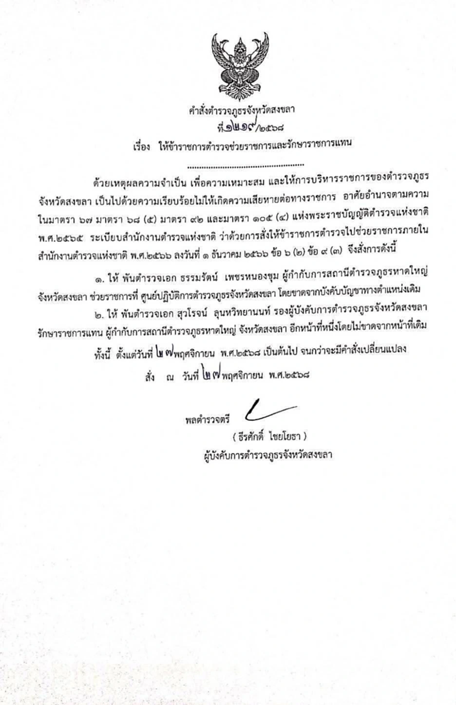 เนื้อหาระบุว่า ด้วยเหตุผลความจำเป็น เพื่อความเหมาะสม และให้การบริหารราชการของตำรวจภูธรจังหวัดสงขลา เป็นไปด้วยความเรียบร้อยไม่ให้เกิดความเสียหายต่อทางราชการ อาศัยอำนาจตามตามความในมาตรา ๖๗ มาตรา 68(5) มาตรา 92 และมาตรา 105(4) แห่งพระราชบัญญัติตำรวจแห่งชาติ พ.ศ.2565 ระเบียบสำนักงานตำรวจแห่งชาติ ว่าด้วยการสั่งให้ข้าราชการตำรวจไปช่วยราชการภายใน