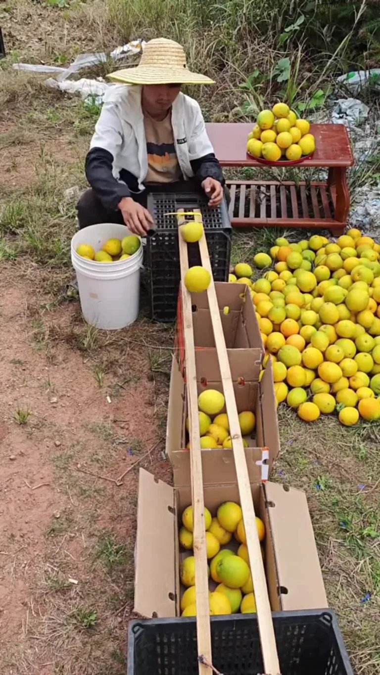 โดยคนงานจะจัดวางไม้สองท่อนให้ปลายข้างหนึ่งแคบและปลายอีกข้างกว้างกว่า ก่อนทยอยปล่อยลูกส้มไหลไปตามหน้าไม้ลงกล่องข้างล่างที่เรียงตามขนาดส้มลูกเล็กไปหาส้มลูกใหญ่กว่า ถือเป็นวิธีการเรียบง่ายแต่มีประสิทธิภาพไม่น้อย