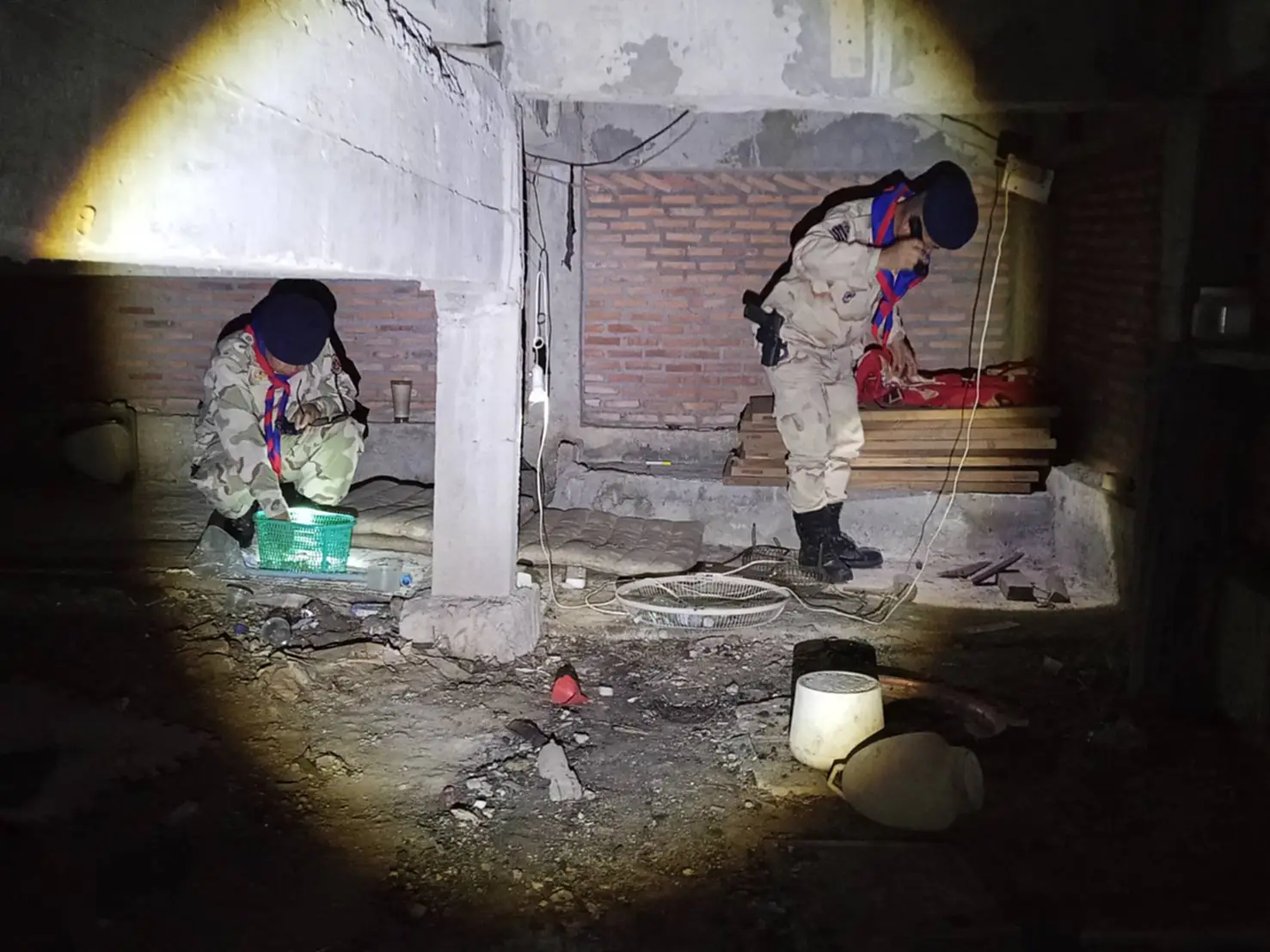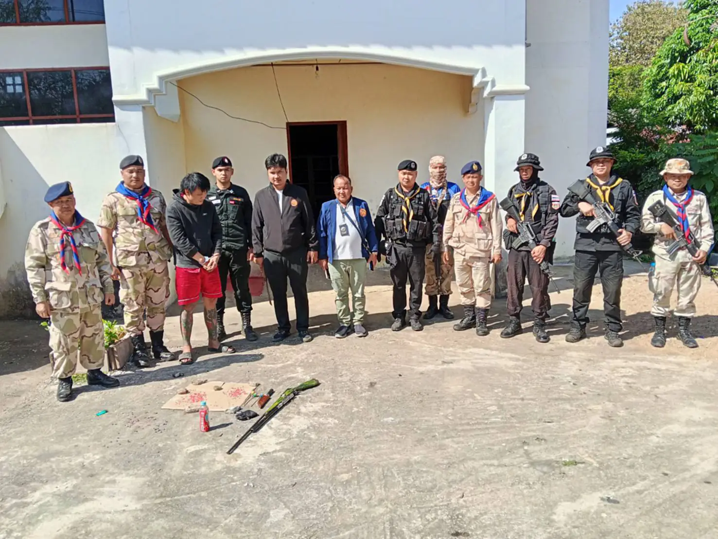 ทันทีที่พบเจ้าหน้าที่ นายเอ๋ได้วิ่งไปที่ริมรั้วและโยนสิ่งของบางอย่างออกไปนอกรั้ว เมื่อตรวจค้นอย่างละเอียดพบว่าเป็นยาบ้า จำนวน 201 เม็ดนอกจากนี้ยังพบเลื่อยไฟฟ้าและไม้แปรรูป จึงได้ประสานหน่วยงานป้องกันรักษาป่าที่ ตก.2 (ขะเนจื้อ) ร่วมจับกุมและตรวจยึดเลื่อยไฟฟ้า 1 เครื่อง และไม้มะค่าแปรรูปจำนวน 11 แผ่น